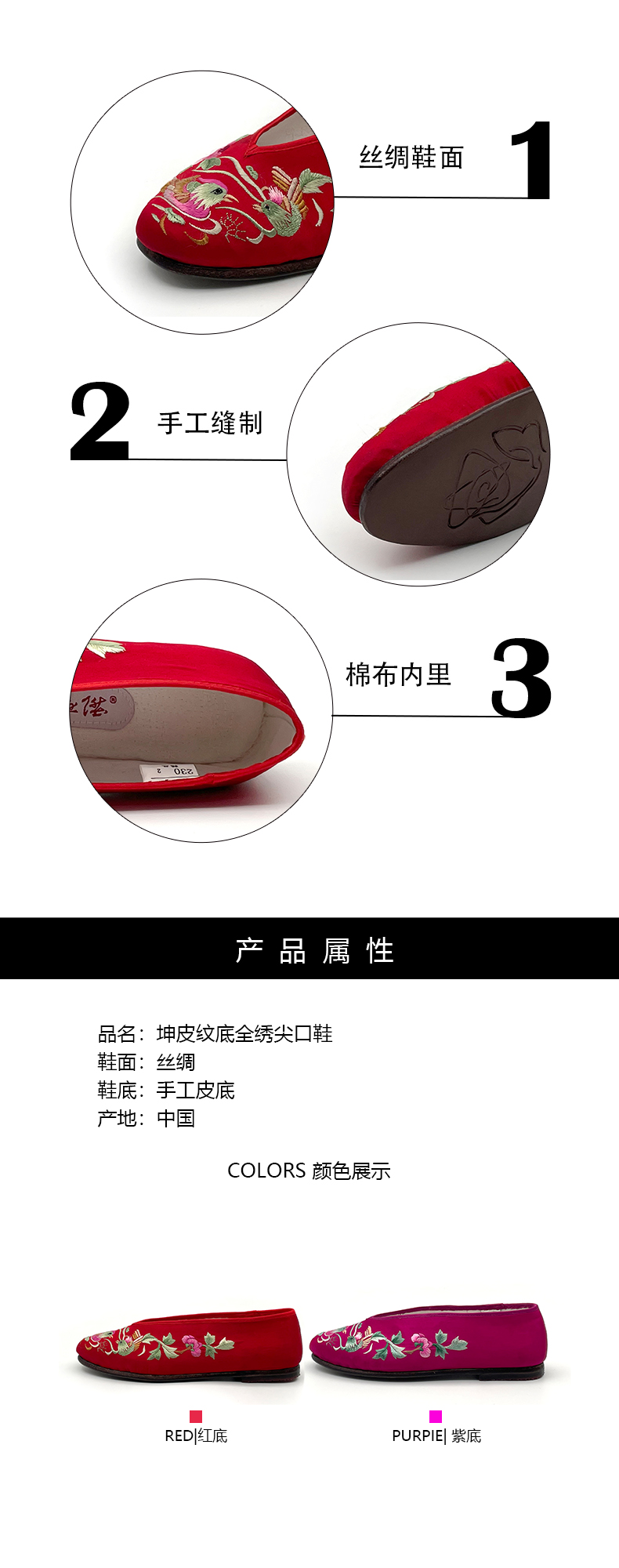 内联升女鞋手工单鞋皮纹底绣花尖口鞋7260A