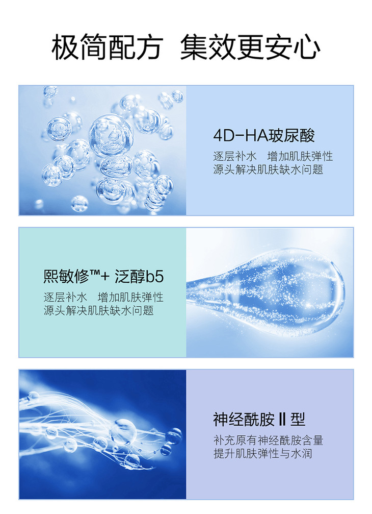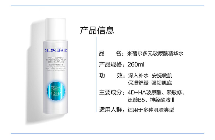 这是米蓓尔的多元玻尿酸精华水,润百颜同厂,足足有260ml,真的觉得有赚到。精华水的成分表很优秀,主要是4D玻尿酸、熙敏修专利、泛醇b5和神经酰胺II型,无酒精、无色素、无香料,多元醇防腐体系。4D玻尿酸因为价格高,所以在一般护肤品里很少见,保湿锁水比普通玻尿酸要好,而且具备一定的修复能力。而专利的熙敏修则是超高活性的玻尿酸,分子量很小,渗透性高,能够有效修复肌肤,舒缓敏感。