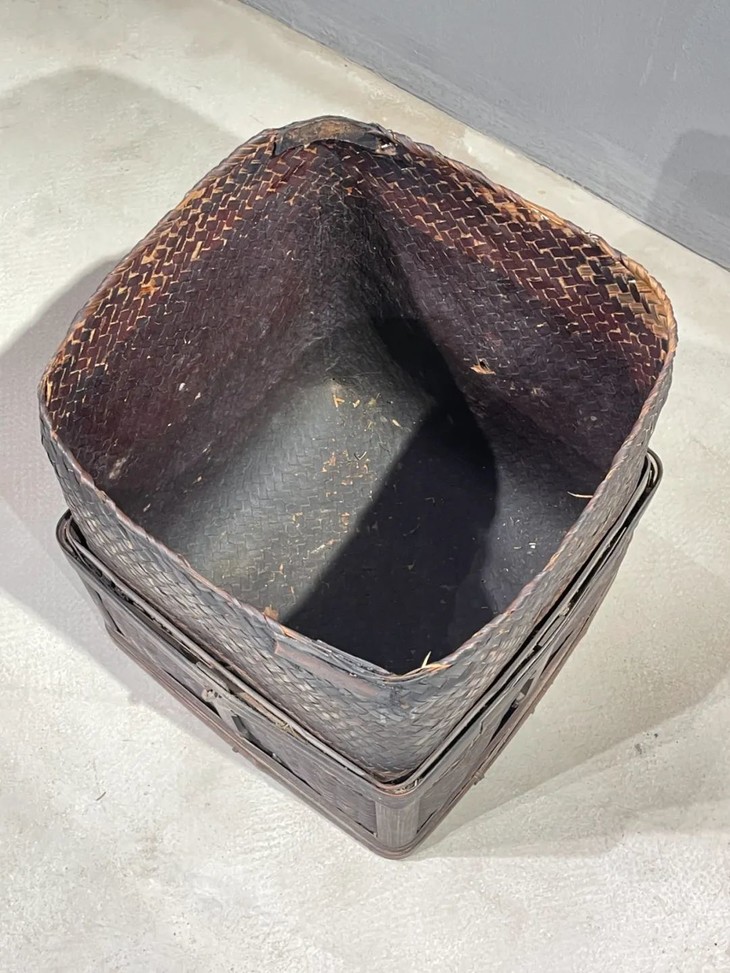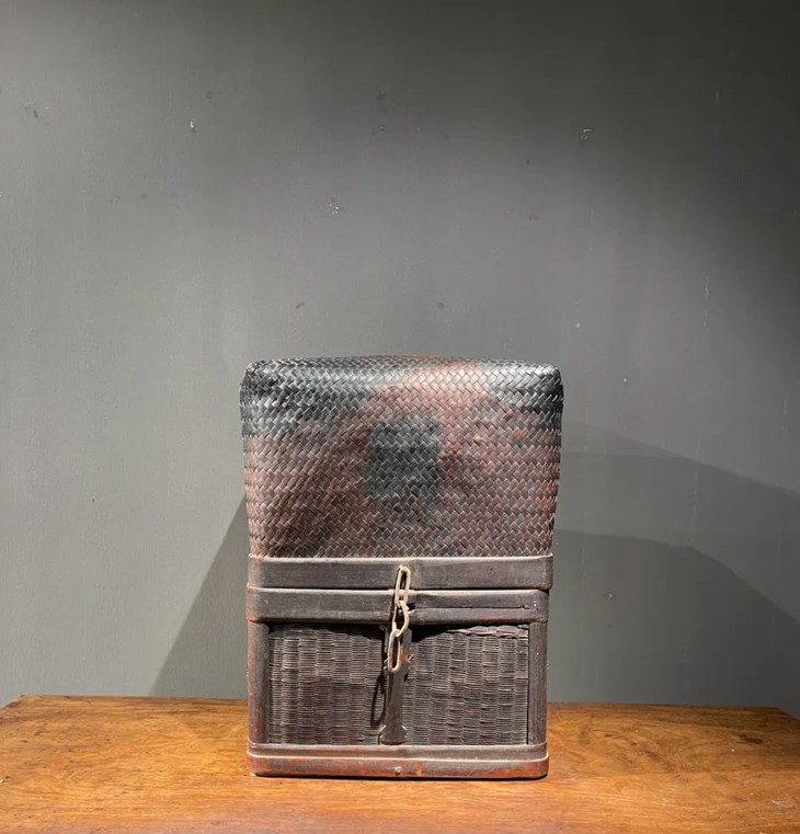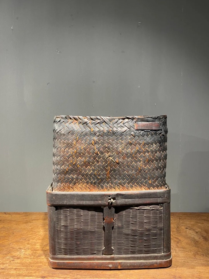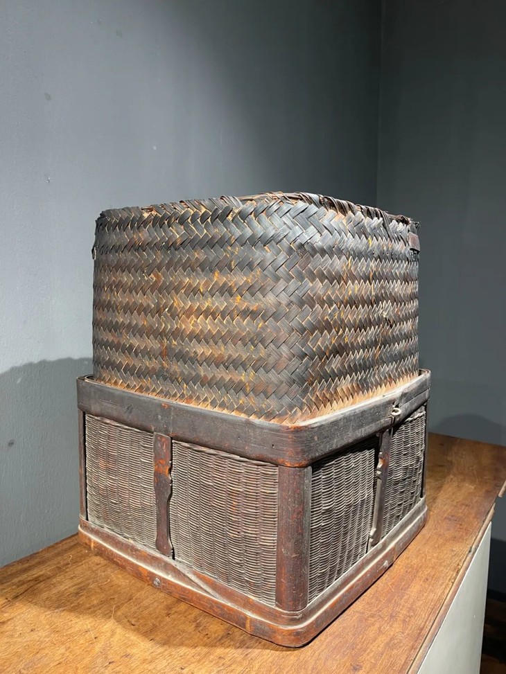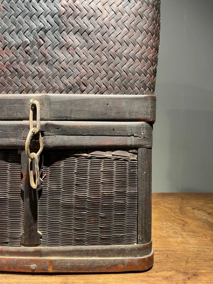 这是一件造型独特典雅,制作精美、年代久远的竹编髹褐漆茶叶储存箱,整体设计风格独特精緻,完全以传统竹编工艺手作编成,长方柱状器身,上层平顶,内部可以储存茶叶,应是清末民初的茶仓,全器髹褐漆逾百年之老竹包浆皮壳渾厚温润,设计精巧别致,优雅大方,气质非凡,如今可摆放于当代空间内,因其独特风格与优良之细节,可以与各种空间搭配,而且可以实用当茶具或是茶叶、食品等收纳,尽显用之美的风範。
