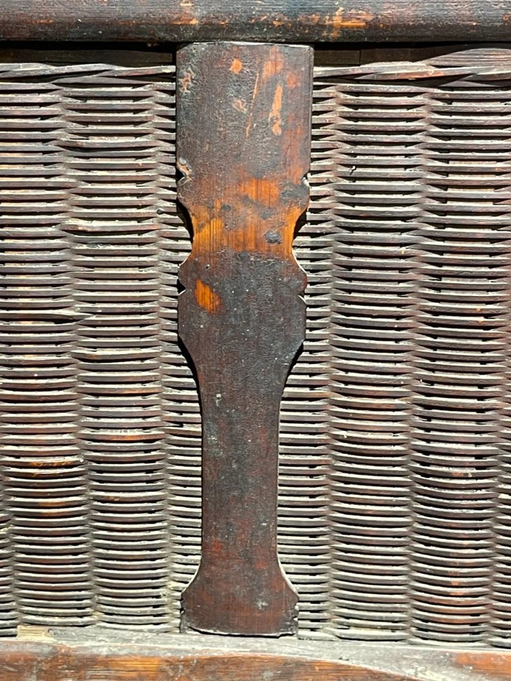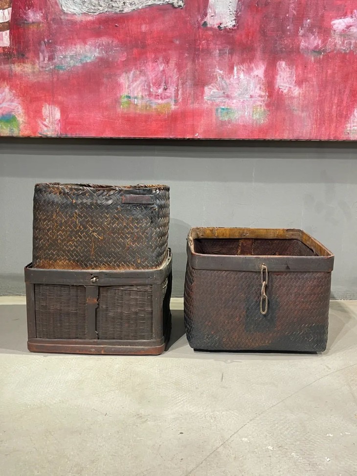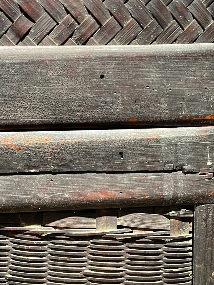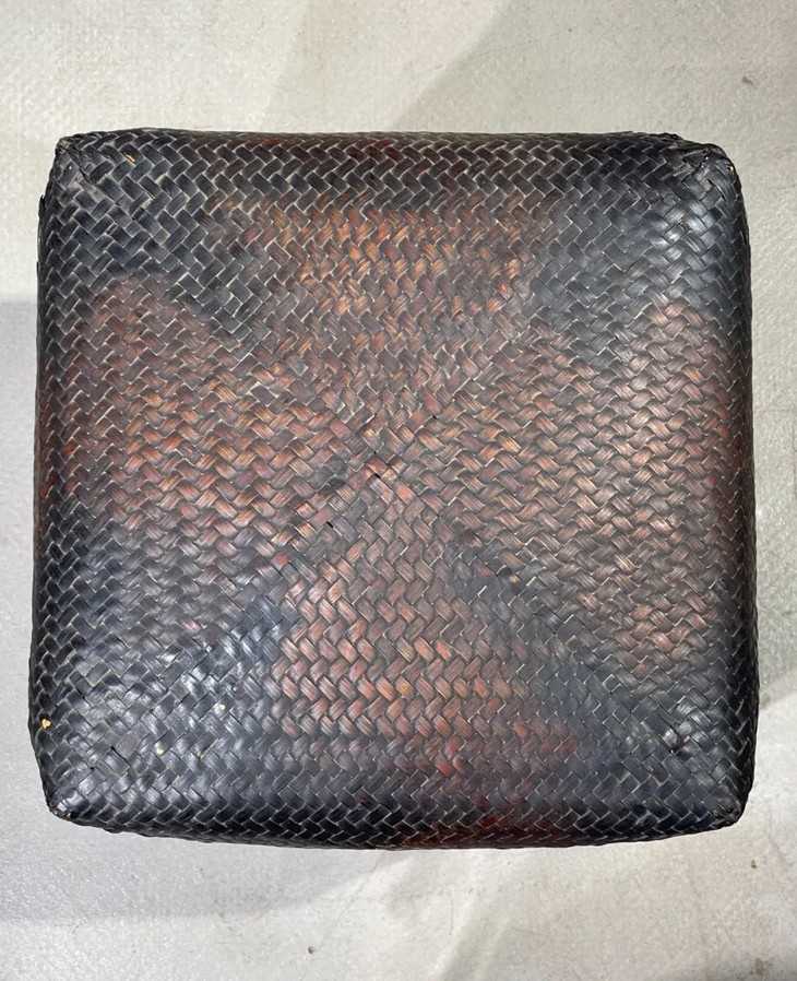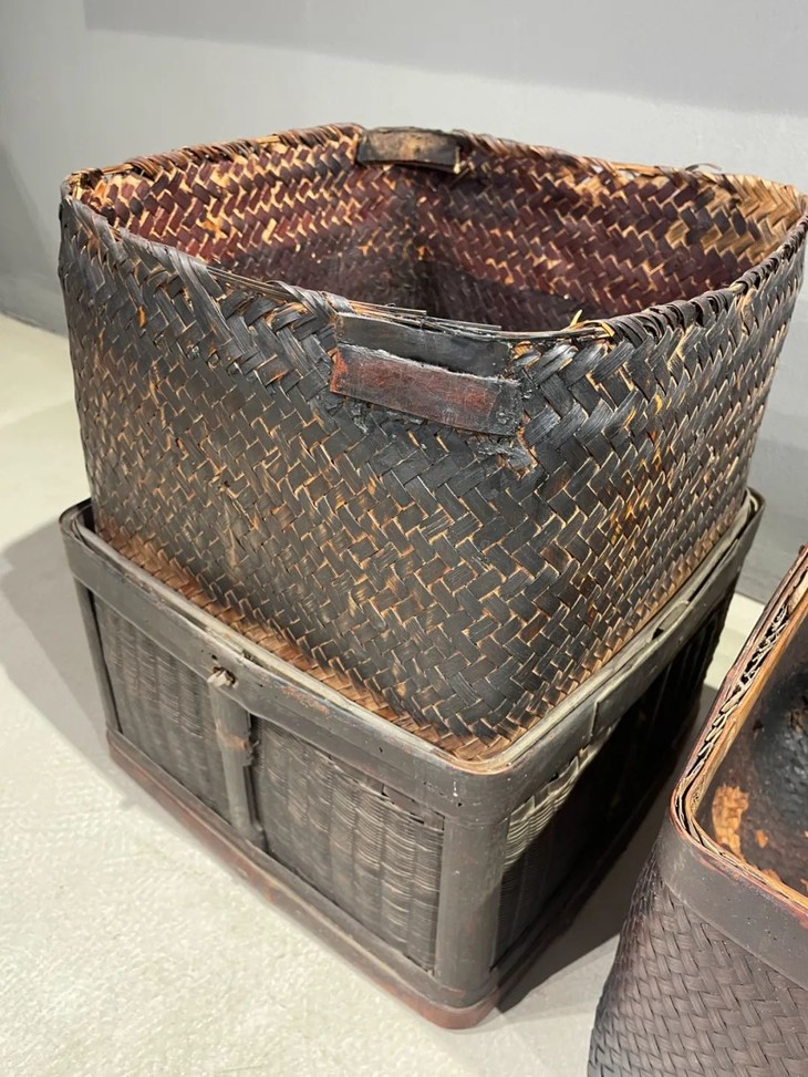 这是一件造型独特典雅,制作精美、年代久远的竹编髹褐漆茶叶储存箱,整体设计风格独特精緻,完全以传统竹编工艺手作编成,长方柱状器身,上层平顶,内部可以储存茶叶,应是清末民初的茶仓,全器髹褐漆逾百年之老竹包浆皮壳渾厚温润,设计精巧别致,优雅大方,气质非凡,如今可摆放于当代空间内,因其独特风格与优良之细节,可以与各种空间搭配,而且可以实用当茶具或是茶叶、食品等收纳,尽显用之美的风範。