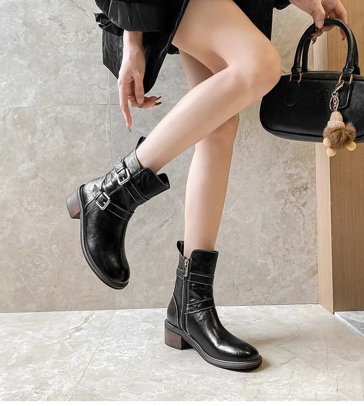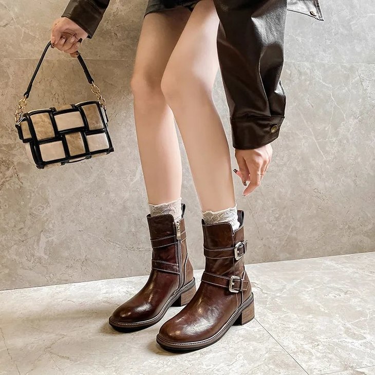 有点酷感的圆头短靴,两侧扣针环绕靴筒一周。乍一看有点牛仔靴的味道在里面,时尚感满满~