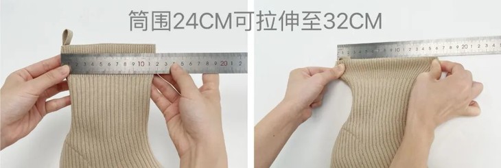 以及这适宜的弹力包容更多脚型,鞋口筒维度不拉伸的情况下是24cm左右,拉伸后可达到32cm左右,宽脚、肉脚穿绝对是妥妥的,而且也不用担心会变形哦,回弹力也是很赞的!