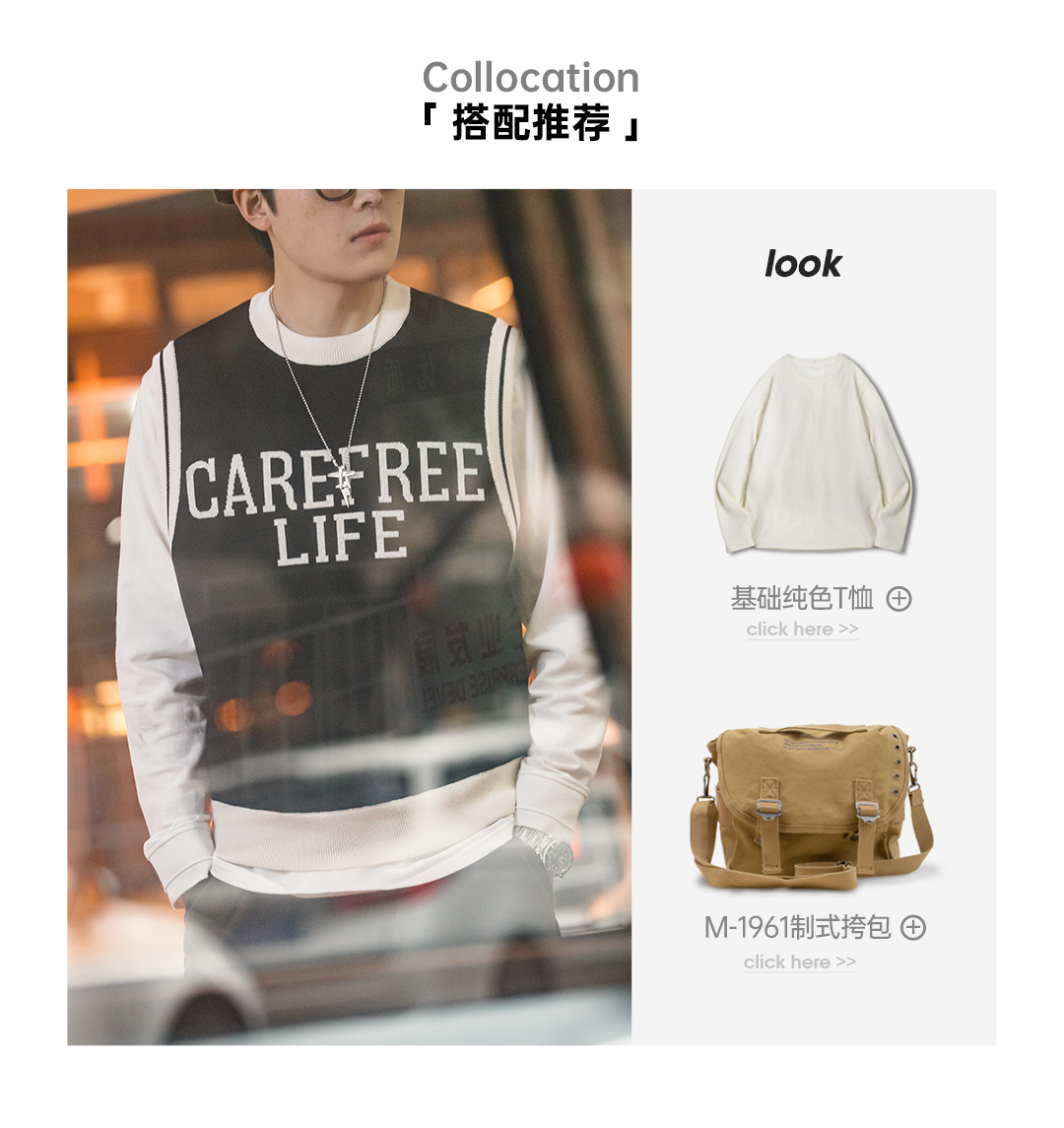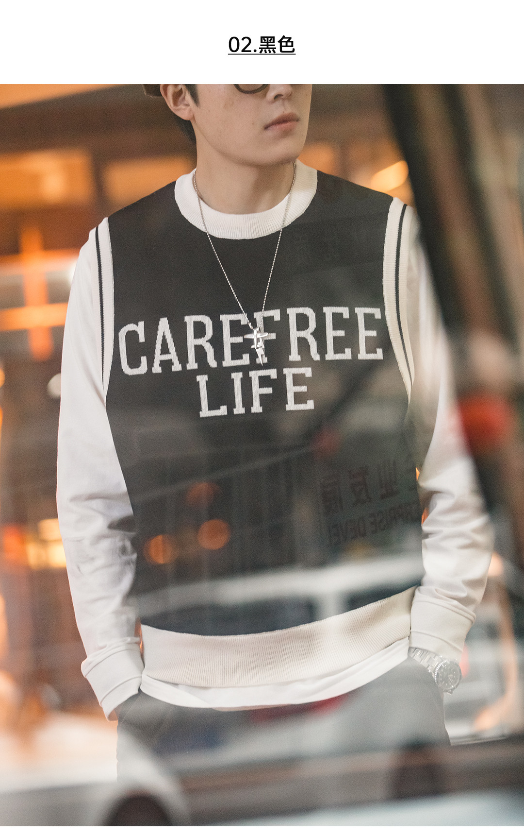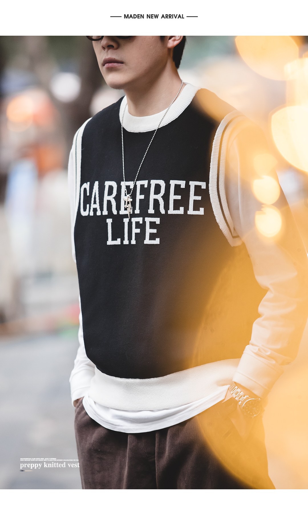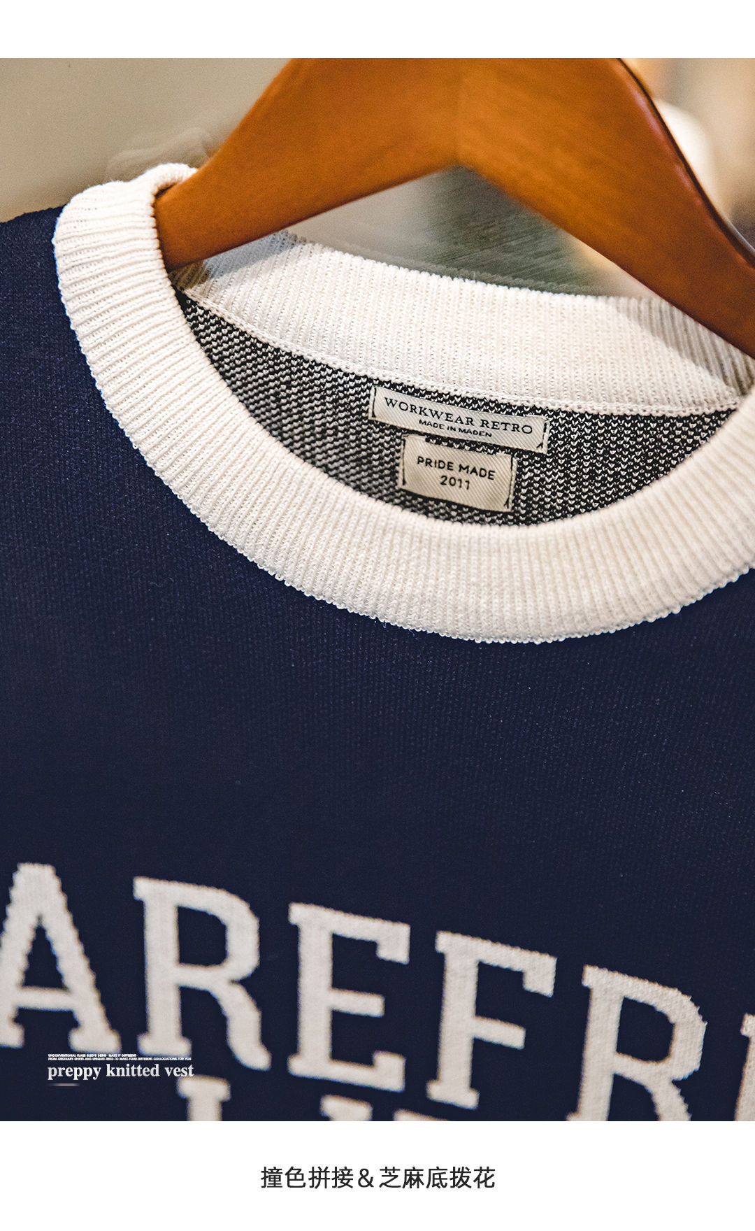 工装精选 美式休闲圆领字母针织背心学院风街头无袖套头马甲男春