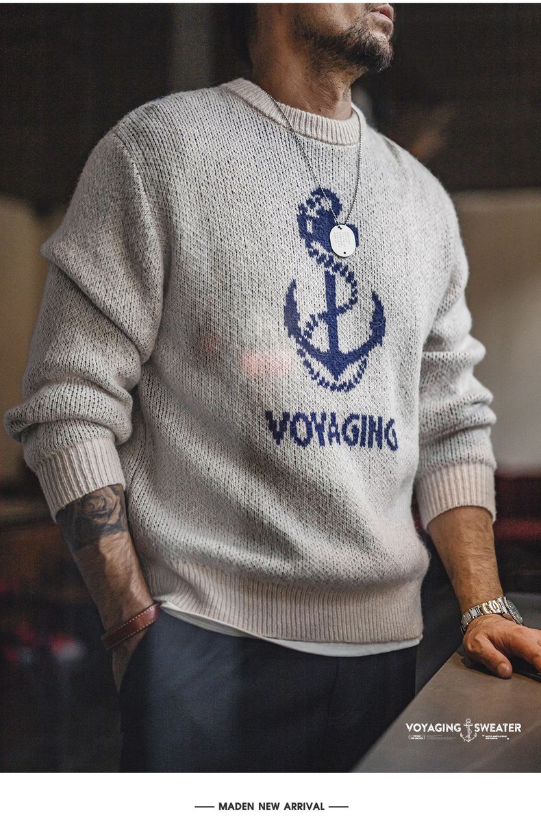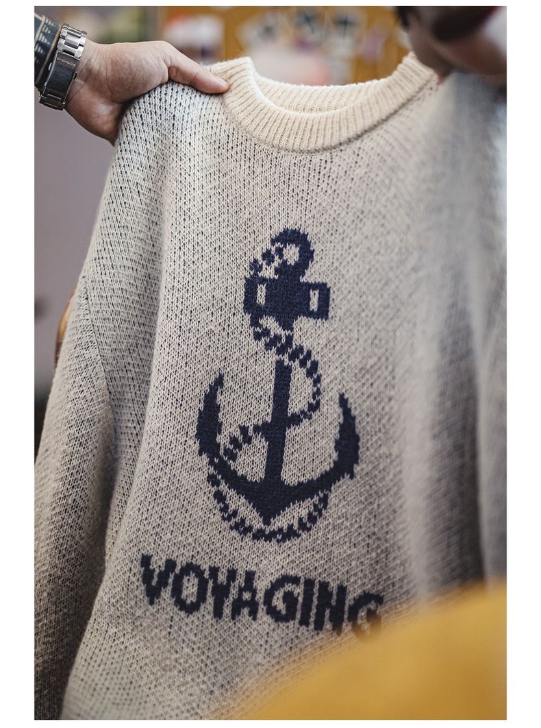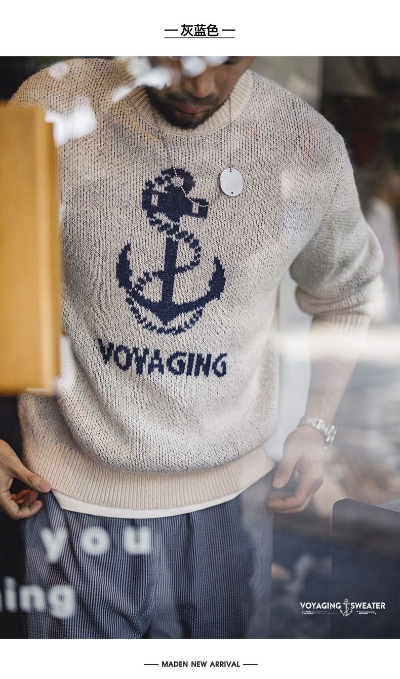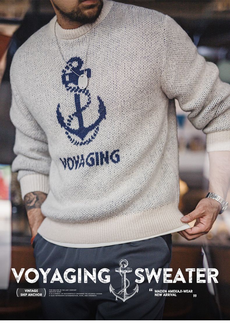 工装优选 美式复古针织船锚提花毛衣vintage套头圆领打底衫男秋冬