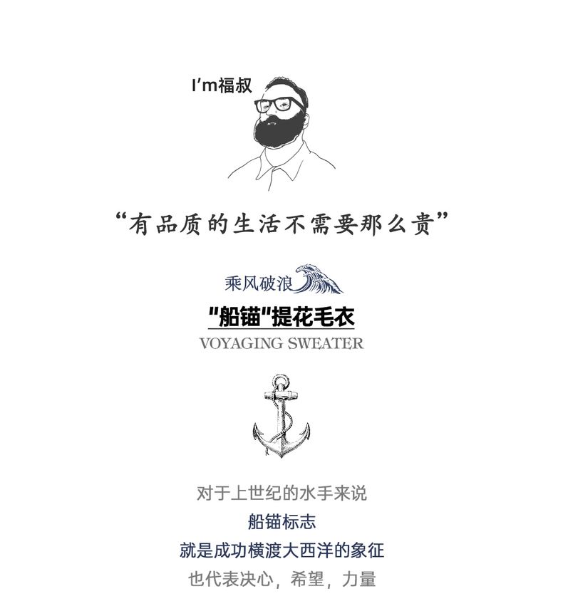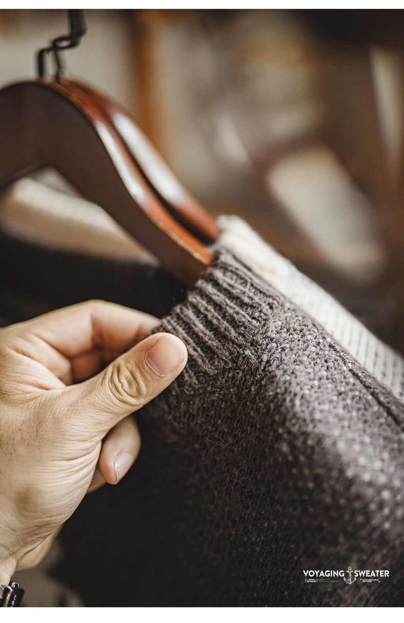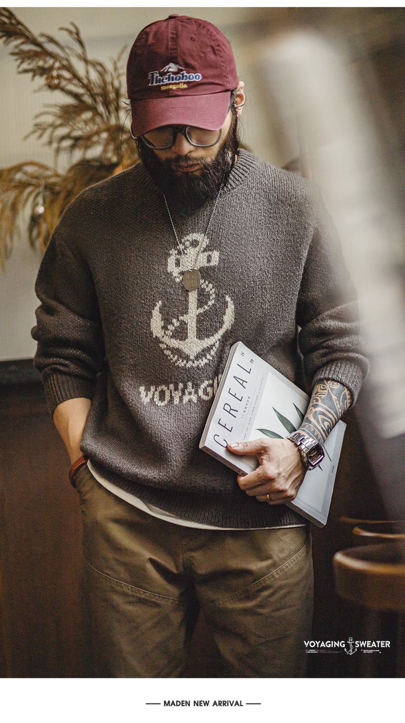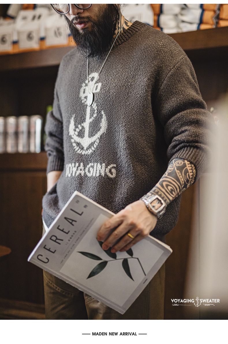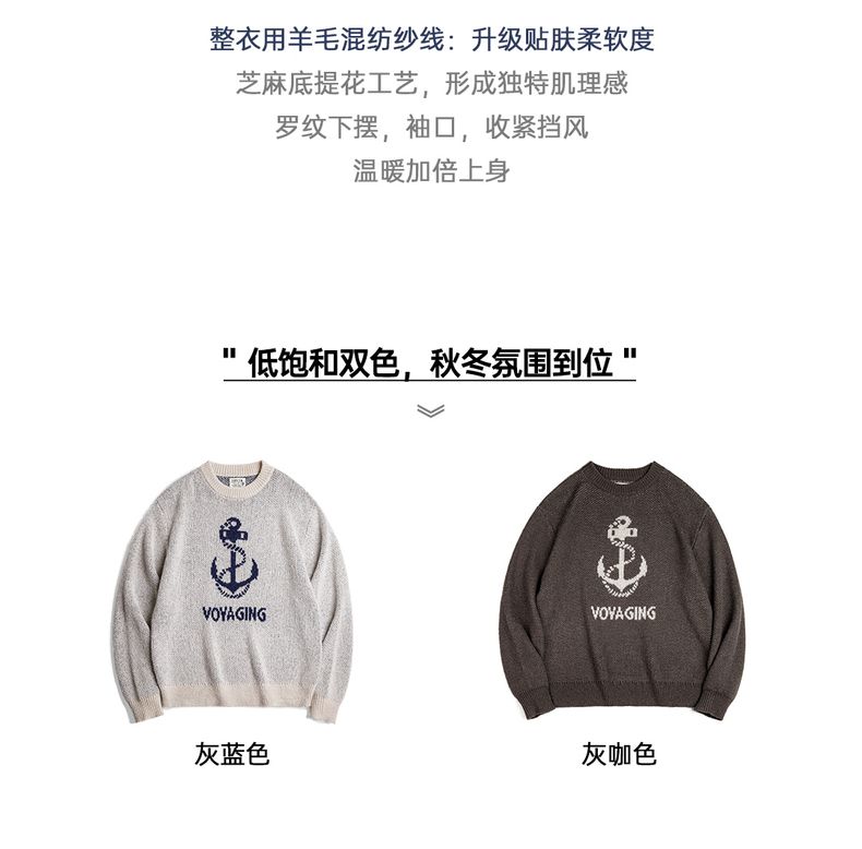 工装优选 美式复古针织船锚提花毛衣vintage套头圆领打底衫男秋冬