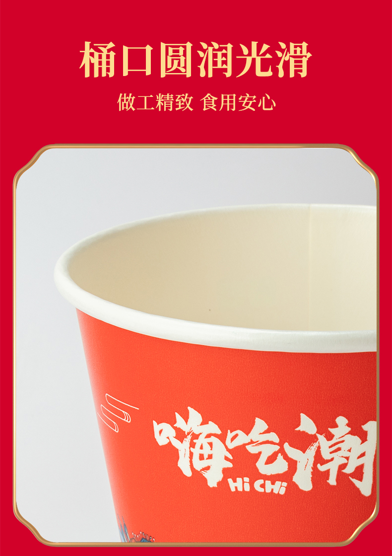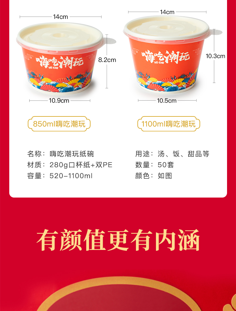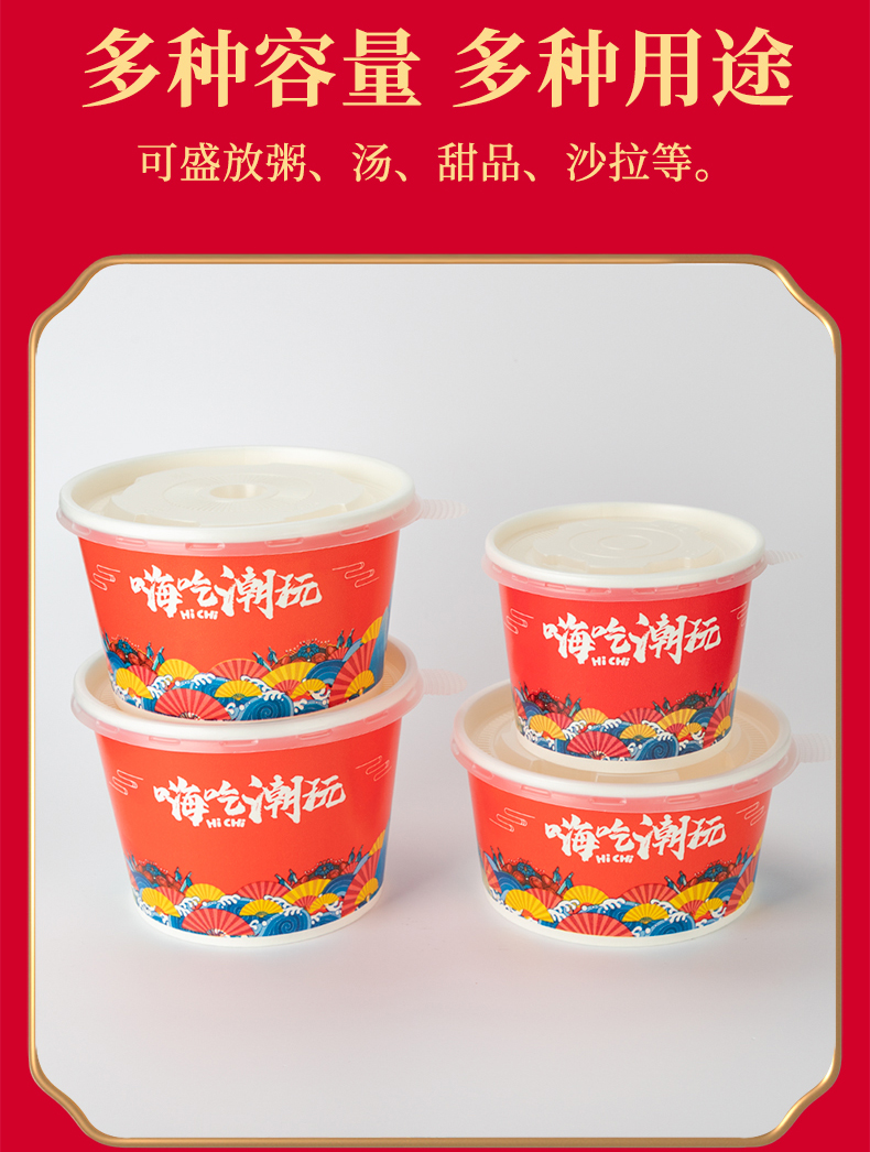 喇叭花一次性纸碗圆盒国潮外卖打包便当盒面碗带盖50套