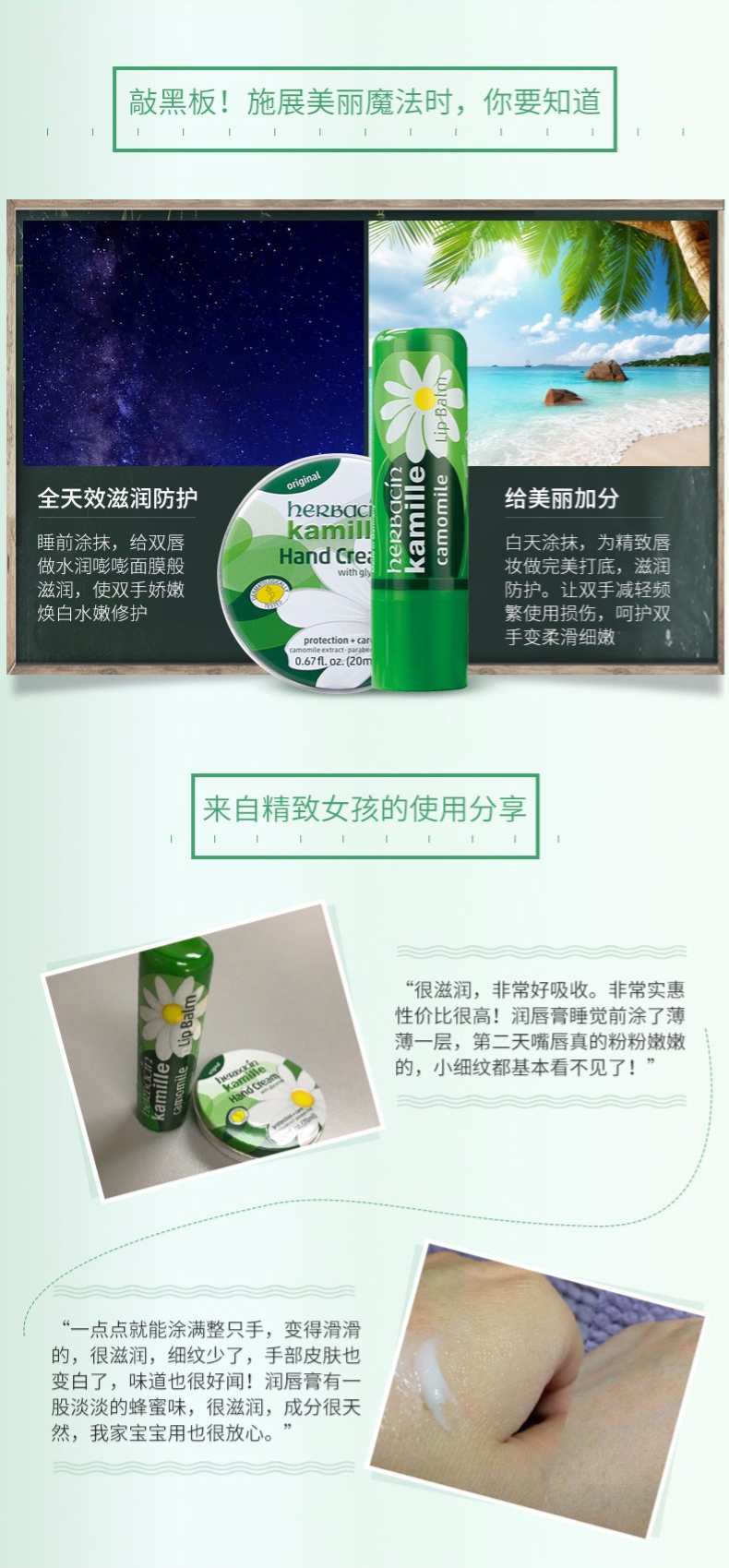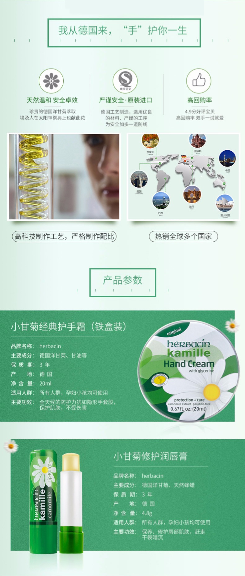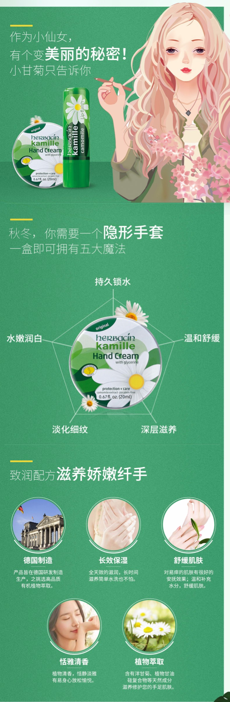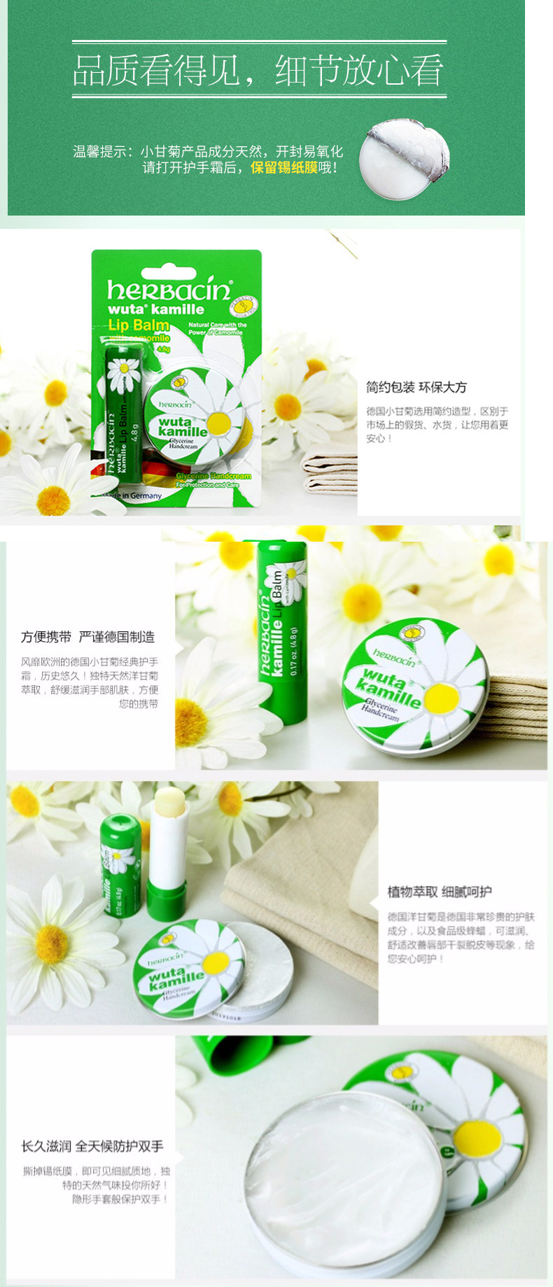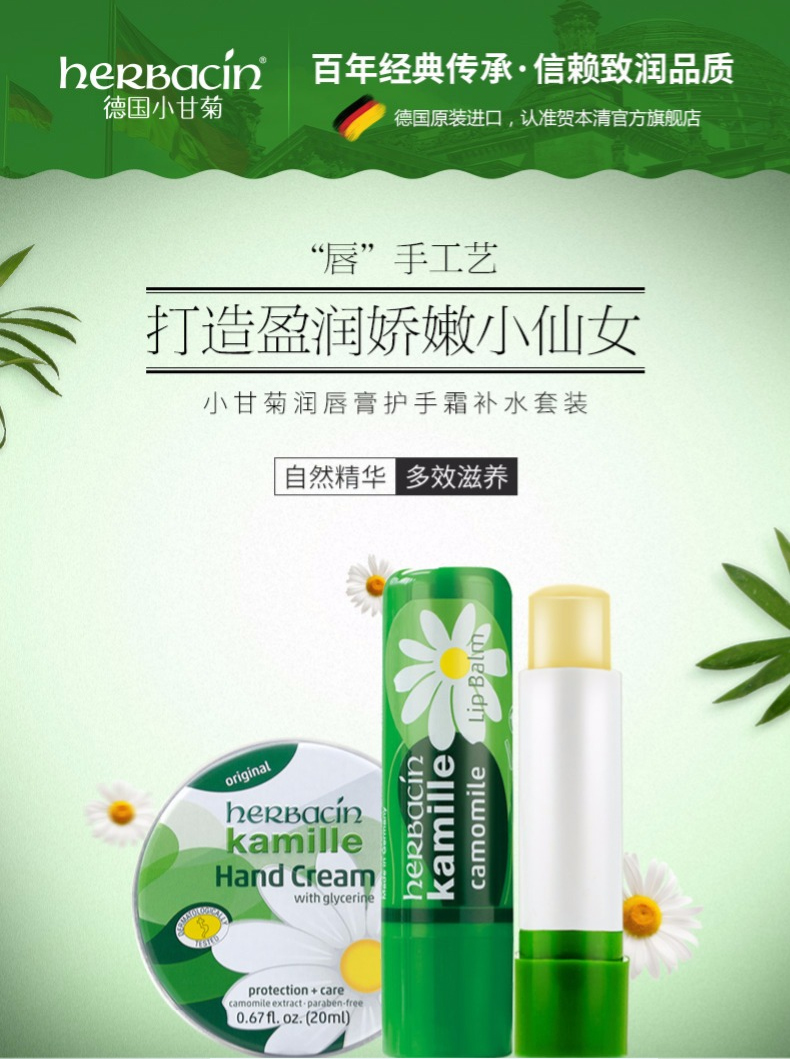 【一般贸易进口】德国贺本清小甘菊herbacin敏感修护唇膏4.8g+经典护手霜20ml组合装