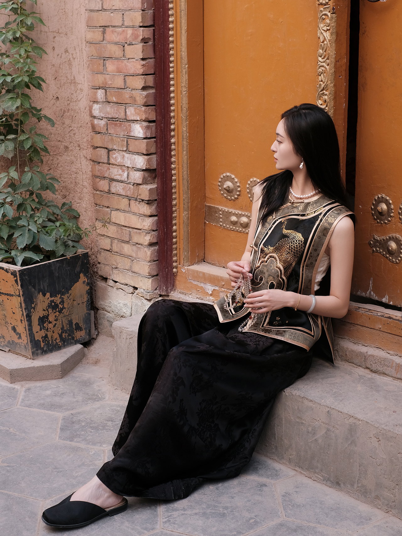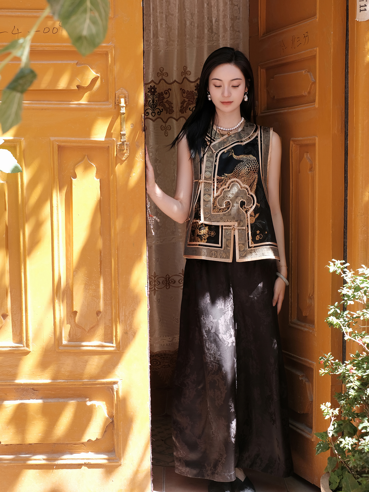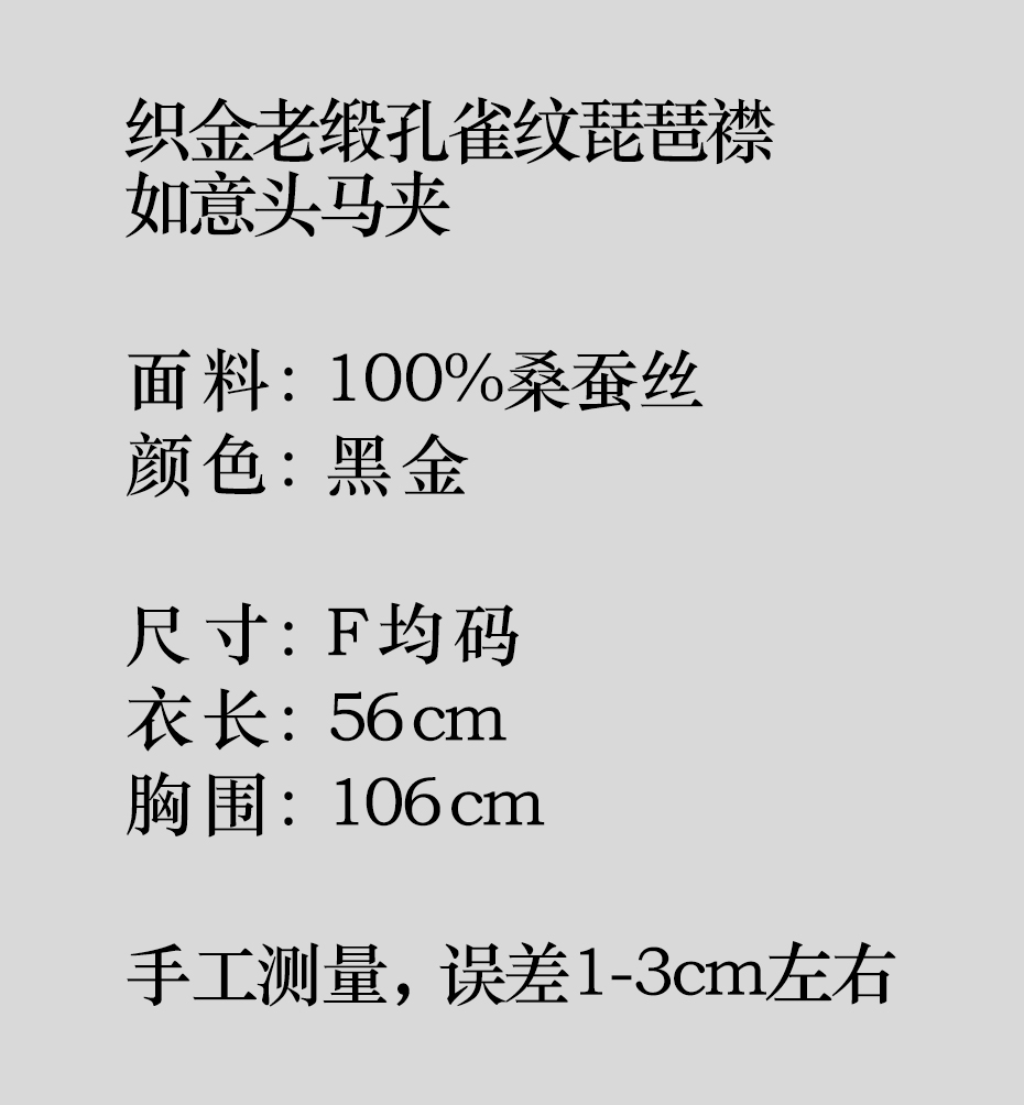 盛唐牡丹盛奢系列| 织金老缎孔雀纹琵琶襟如意头马夹(特殊商品不退不换)