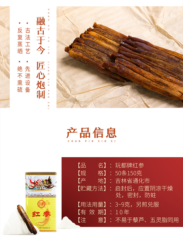 康美玩都红参150克/盒 新开河长白山无添加蔗糖红参整枝铁盒装 煲汤滋补品泡酒药材 多规格可选