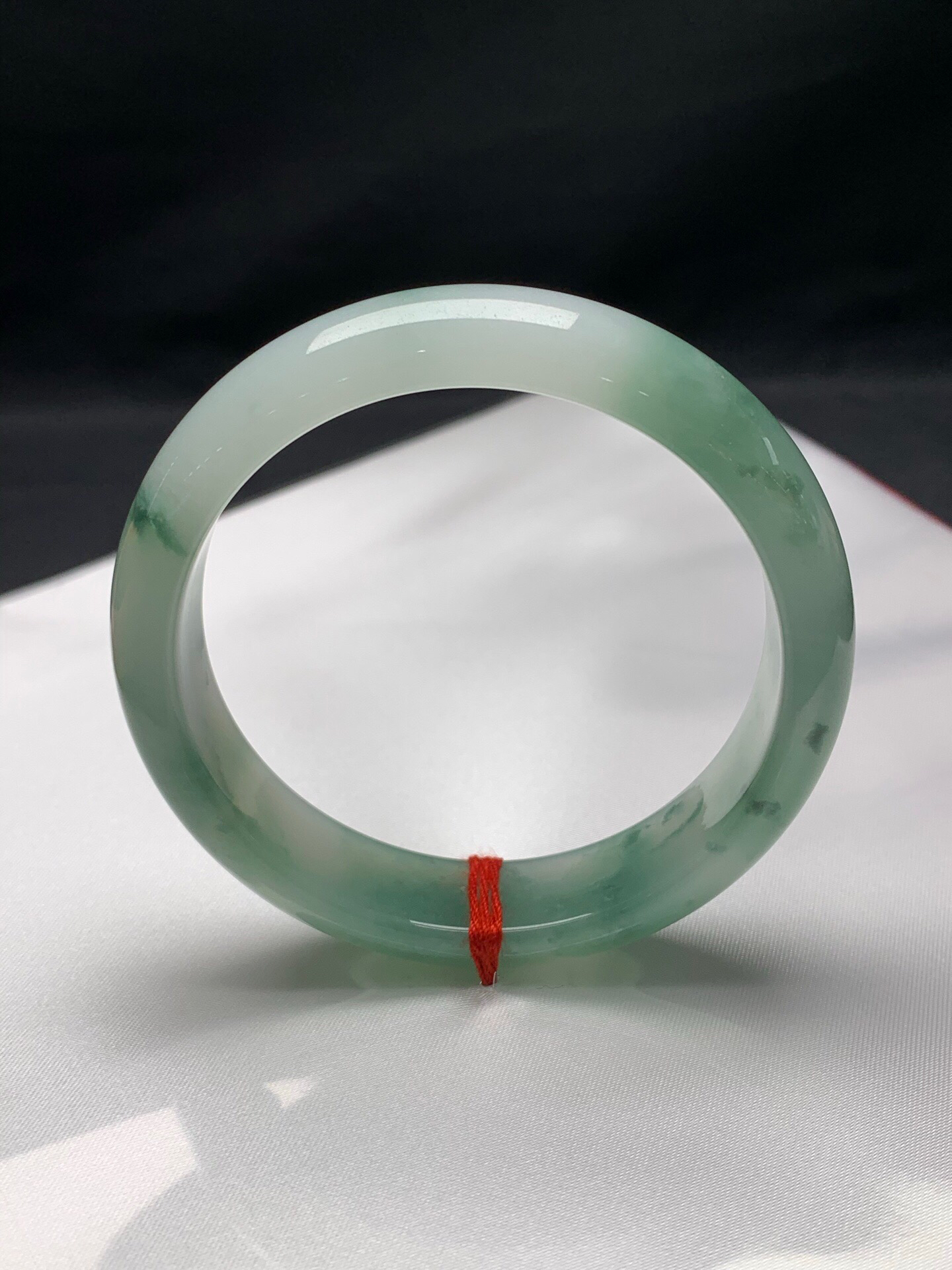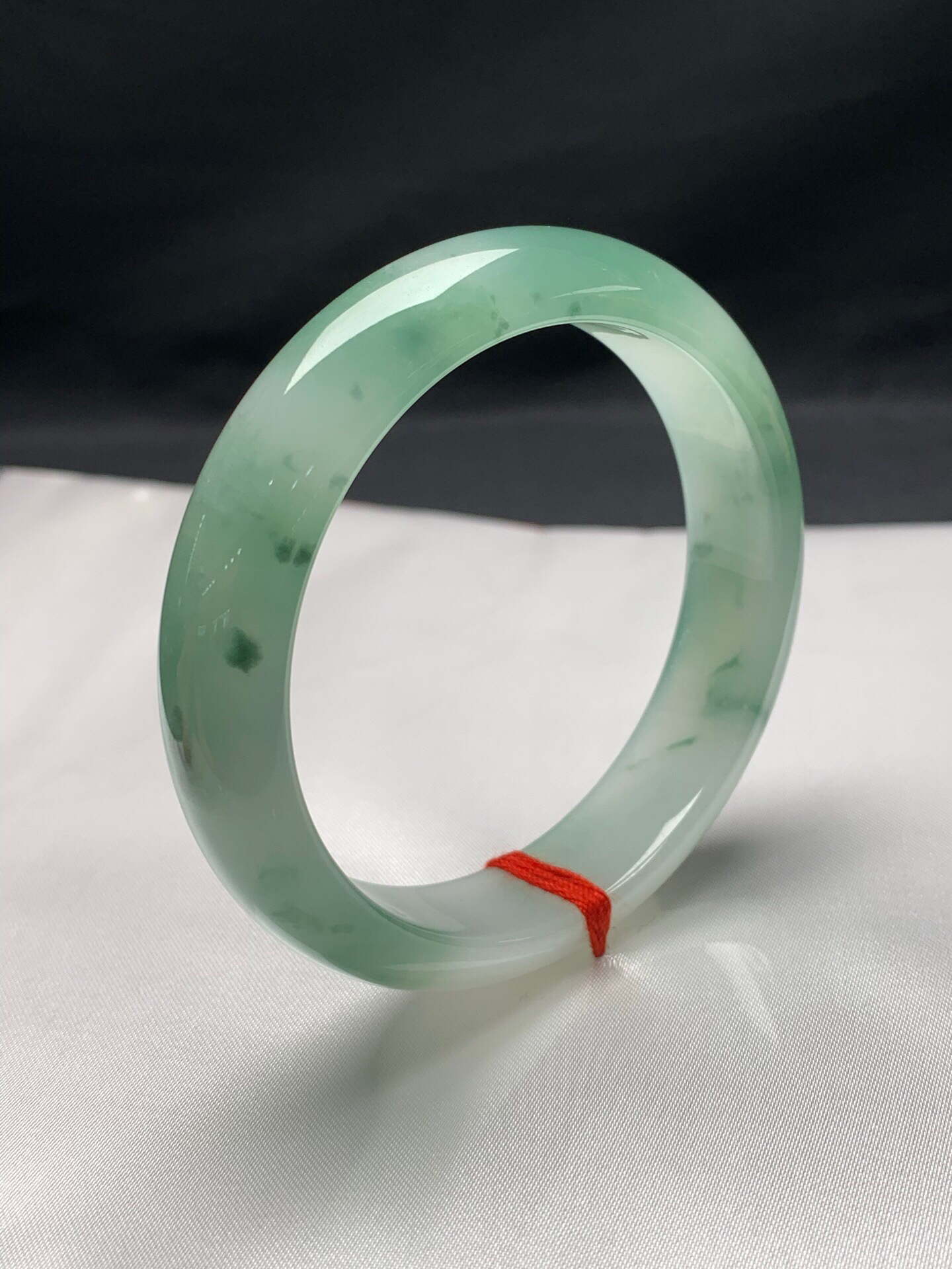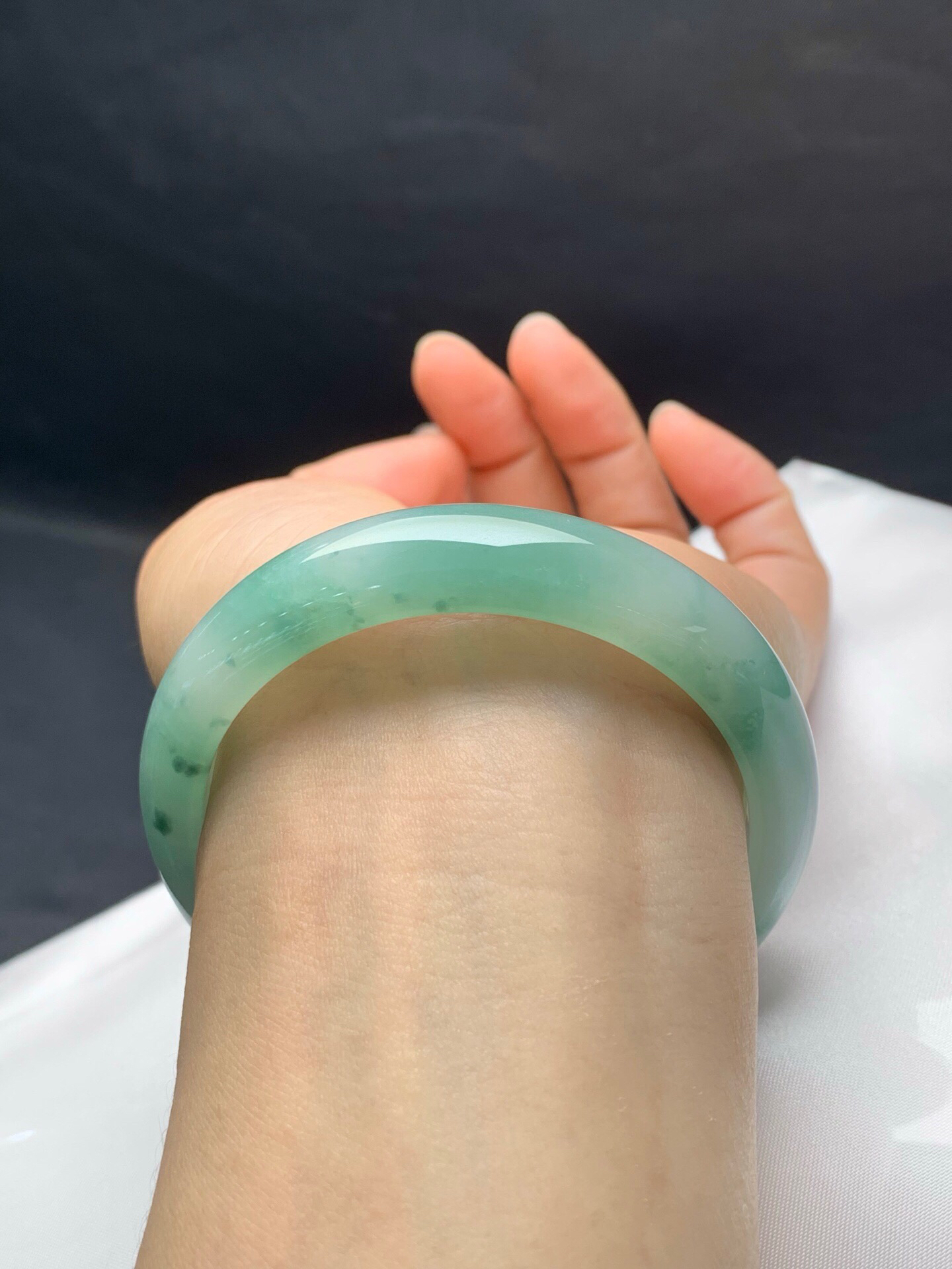 620725,62飘绿正圈手镯,11.8-8.2mm 很秀气清爽的一条。条形不粗,干干净净