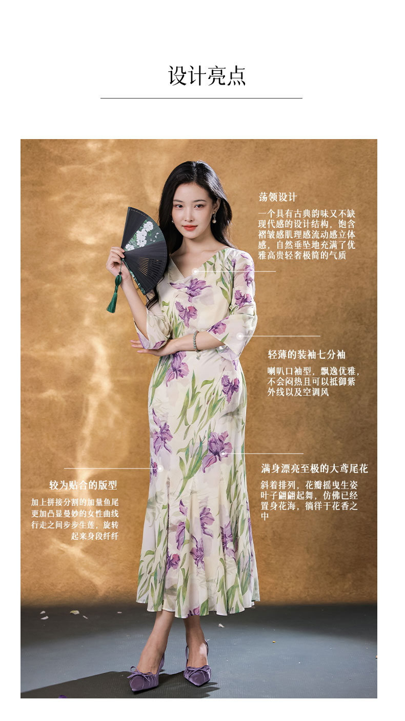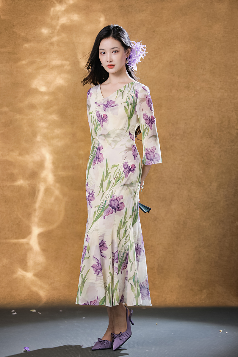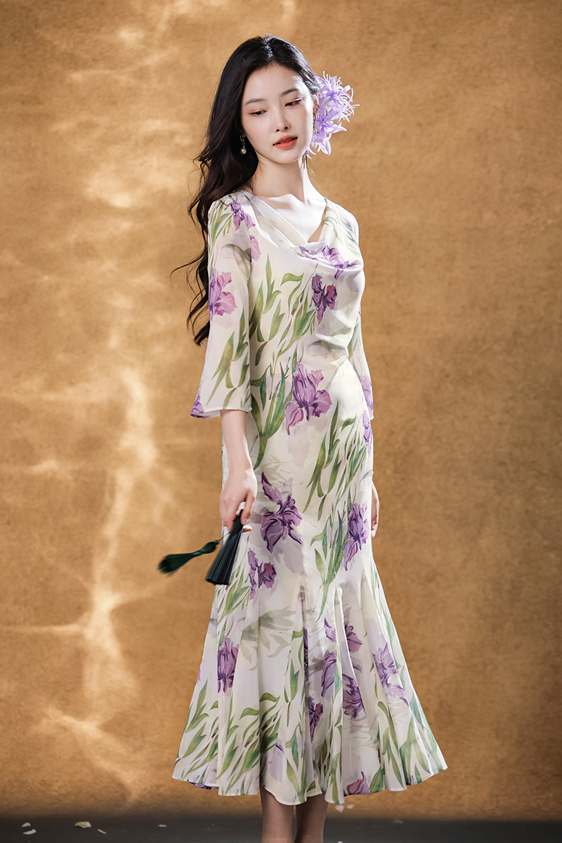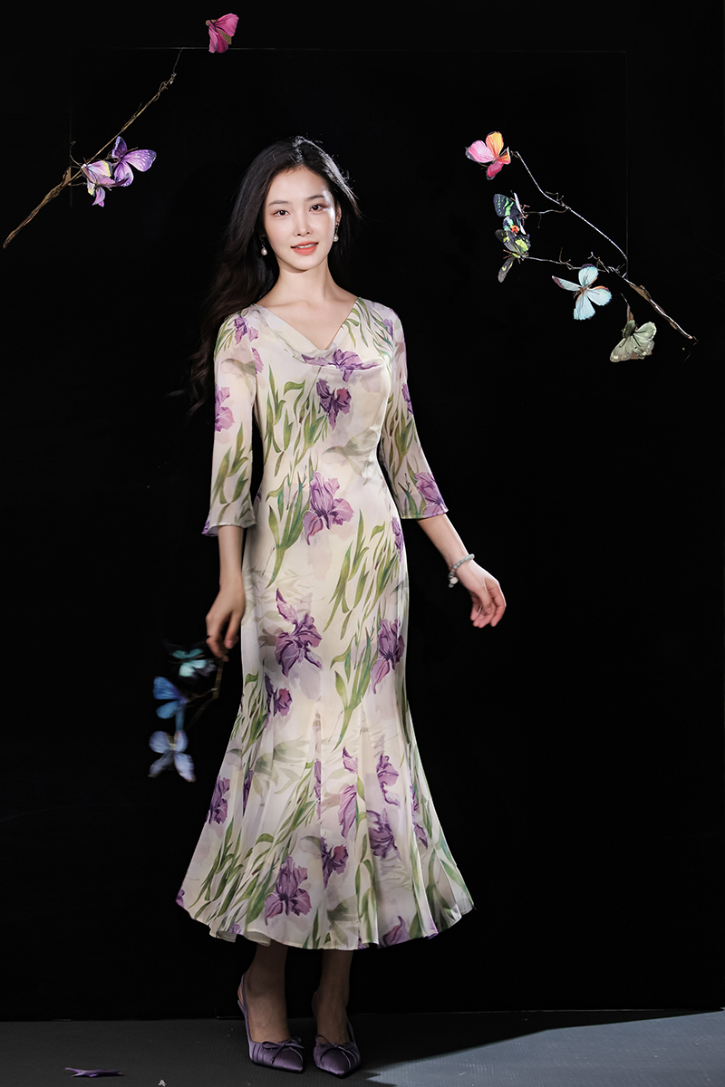 整条裙子铺满了超大朵的紫色鸢尾花!花朵不是死板印上去的,是斜着排列的,特别灵动。