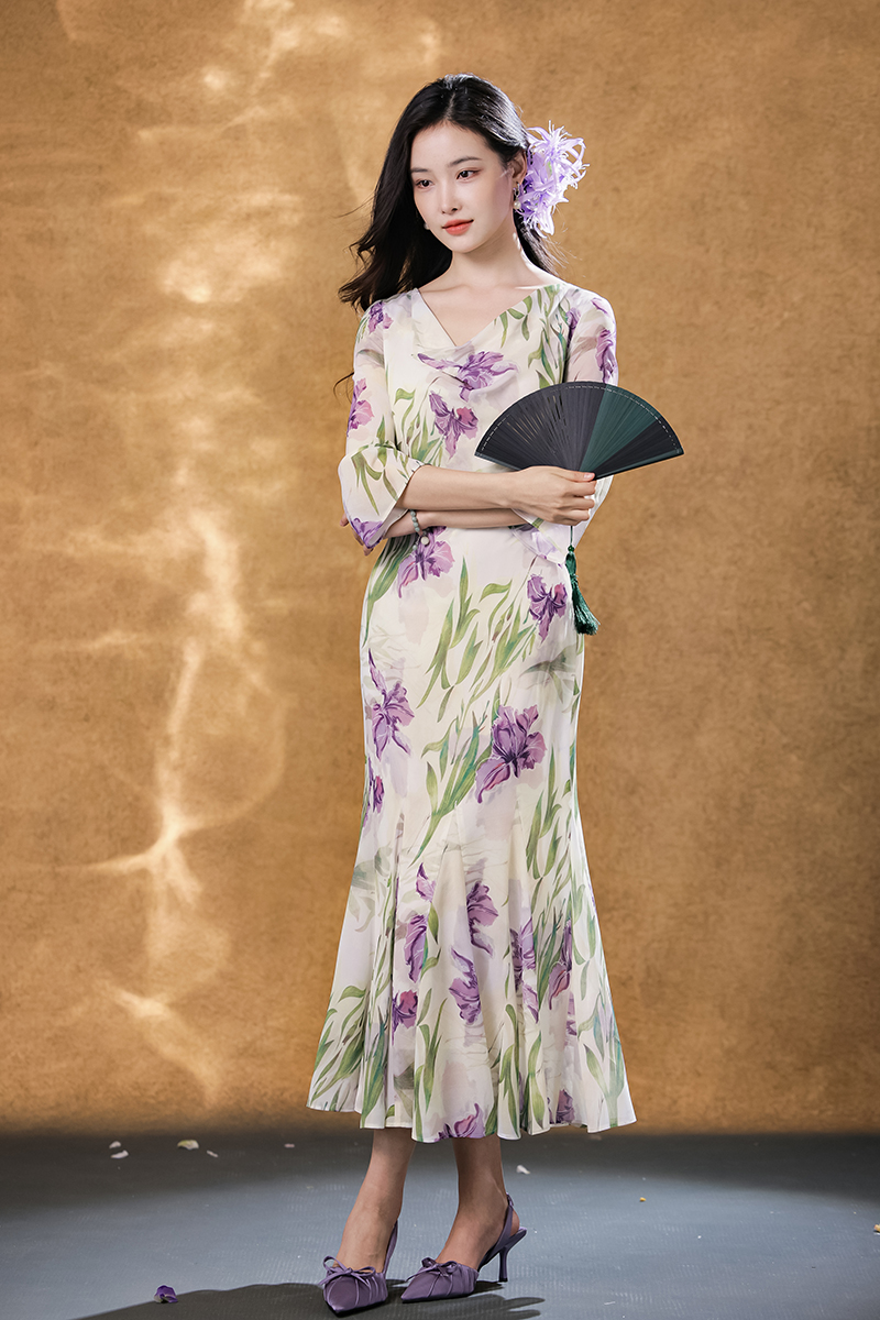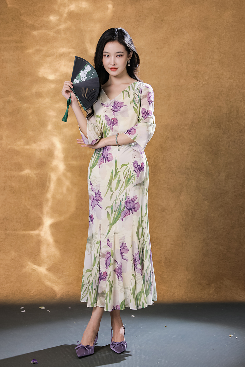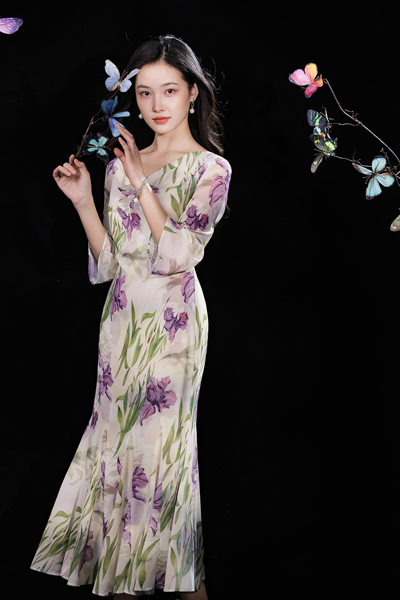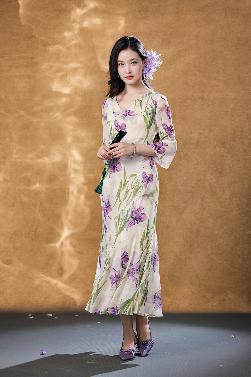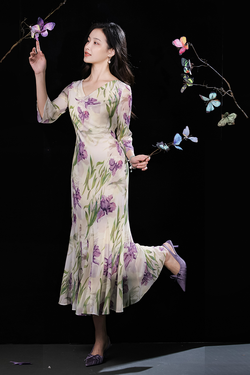 整条裙子铺满了超大朵的紫色鸢尾花!花朵不是死板印上去的,是斜着排列的,特别灵动。