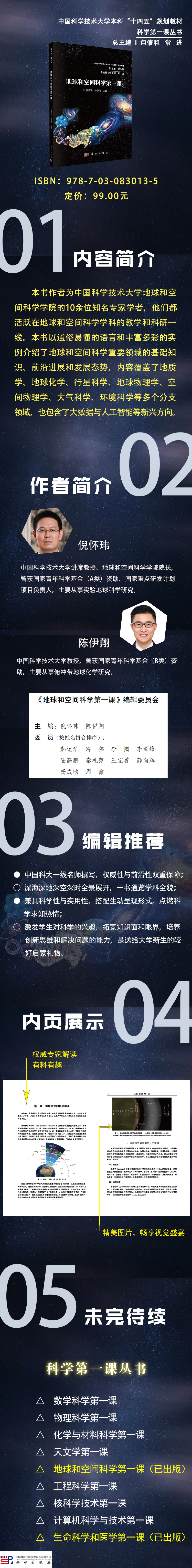 本书作者为中国科学技术大学地球和空间科学学院的10余位知名专家学者,他们都活跃在地球和空间科学学科的教学和科研一线。本书以通俗易懂的语言和丰富多彩的实例介绍了地球和空间科学重要领域的基础知识、前沿进展和发展态势,内容覆盖了地质学、地球化学、行星科学、地球物理学、空间物理学、大气科学、环境科学等多个分支领域,也包含了大数据与人工智能等新兴方向。