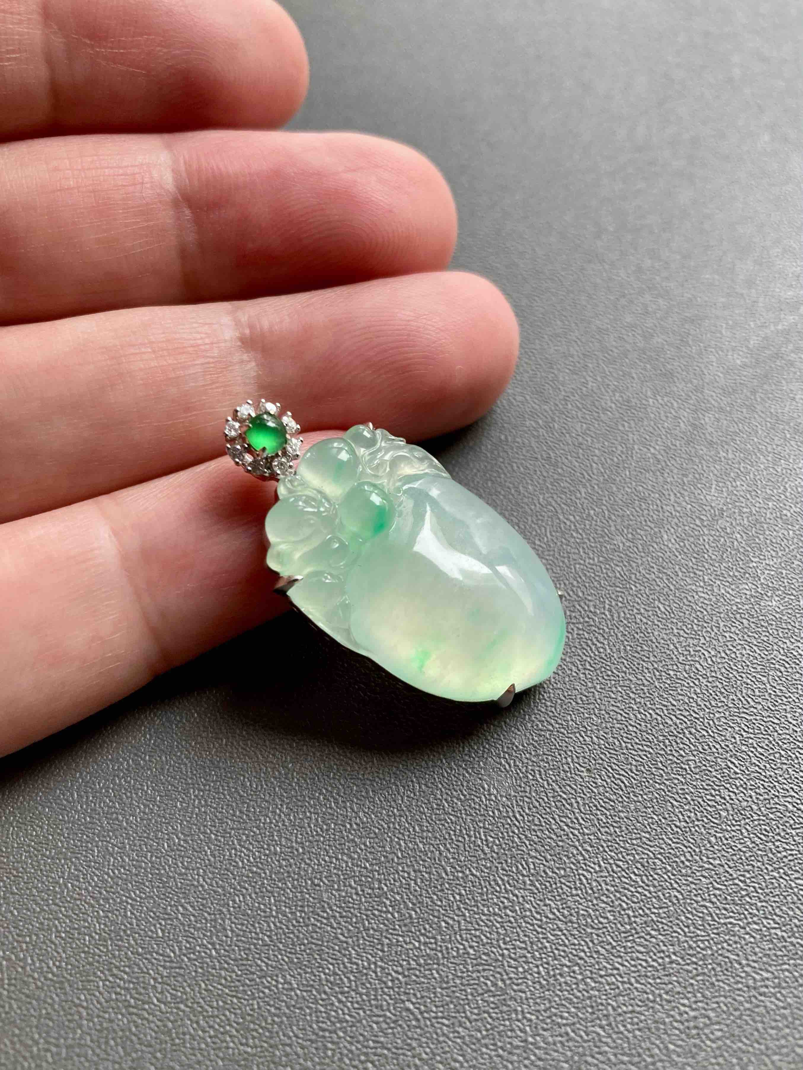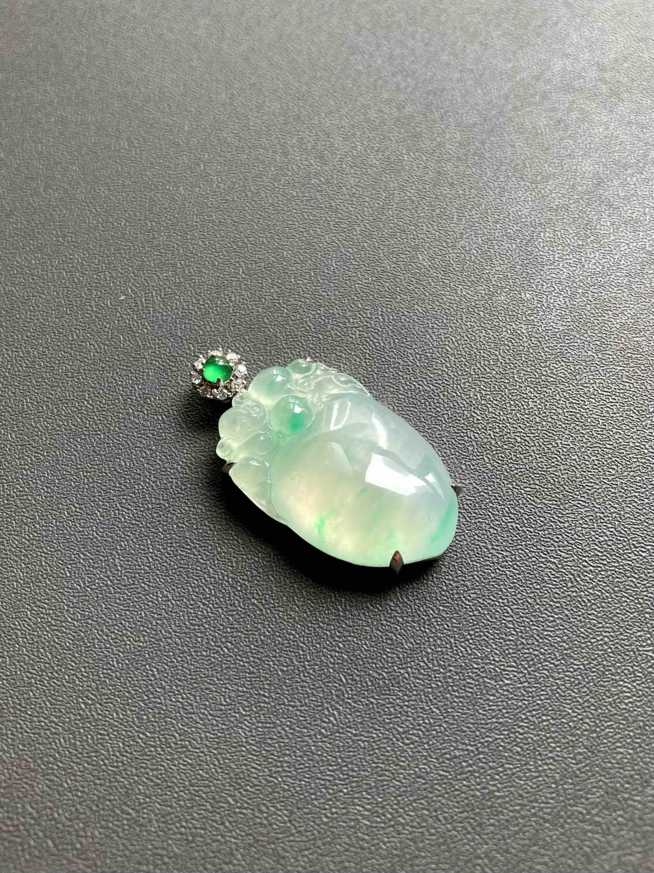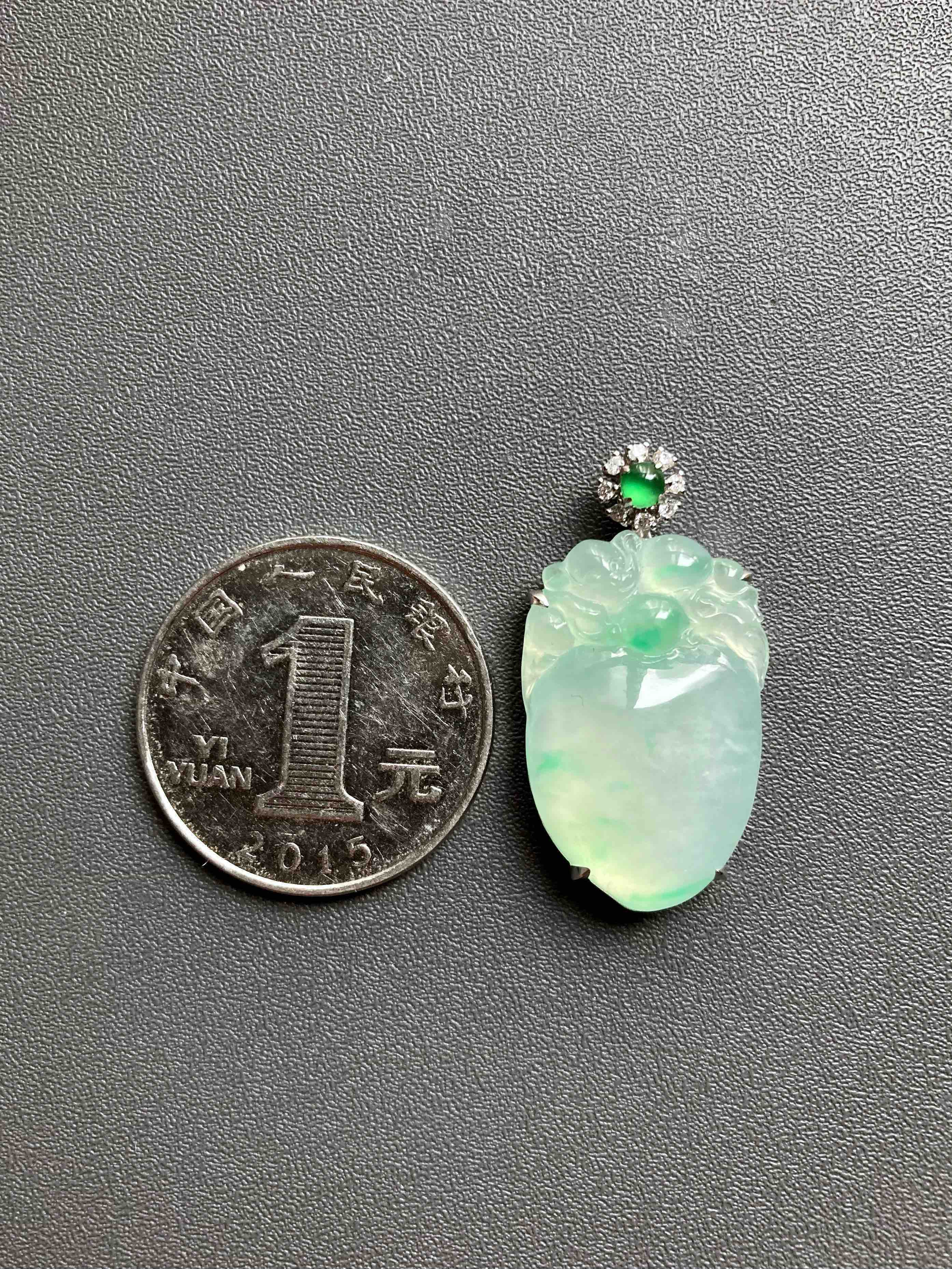 冰种飘阳绿翡翠桃子金猴捧寿18k白金钻石镶嵌