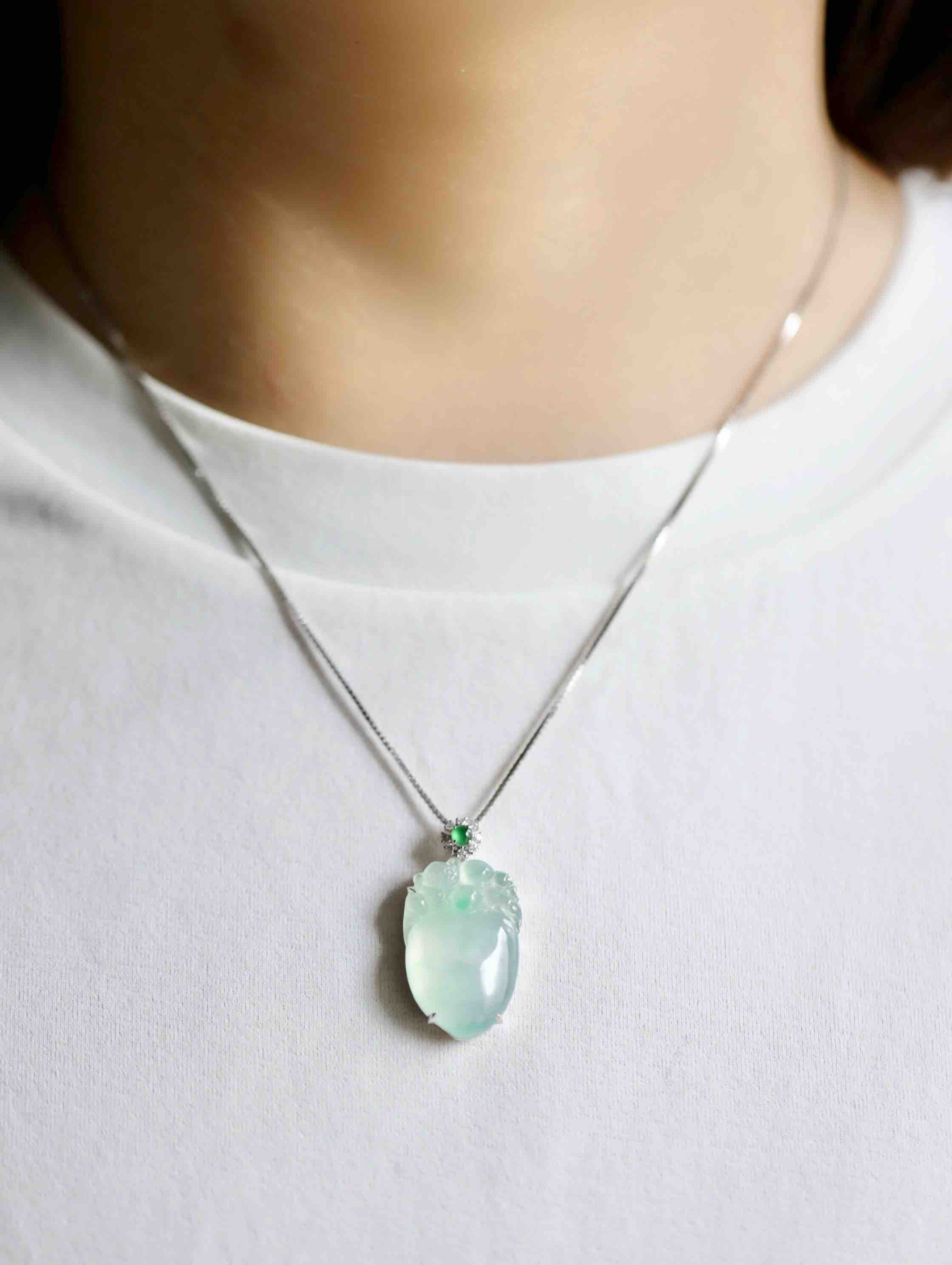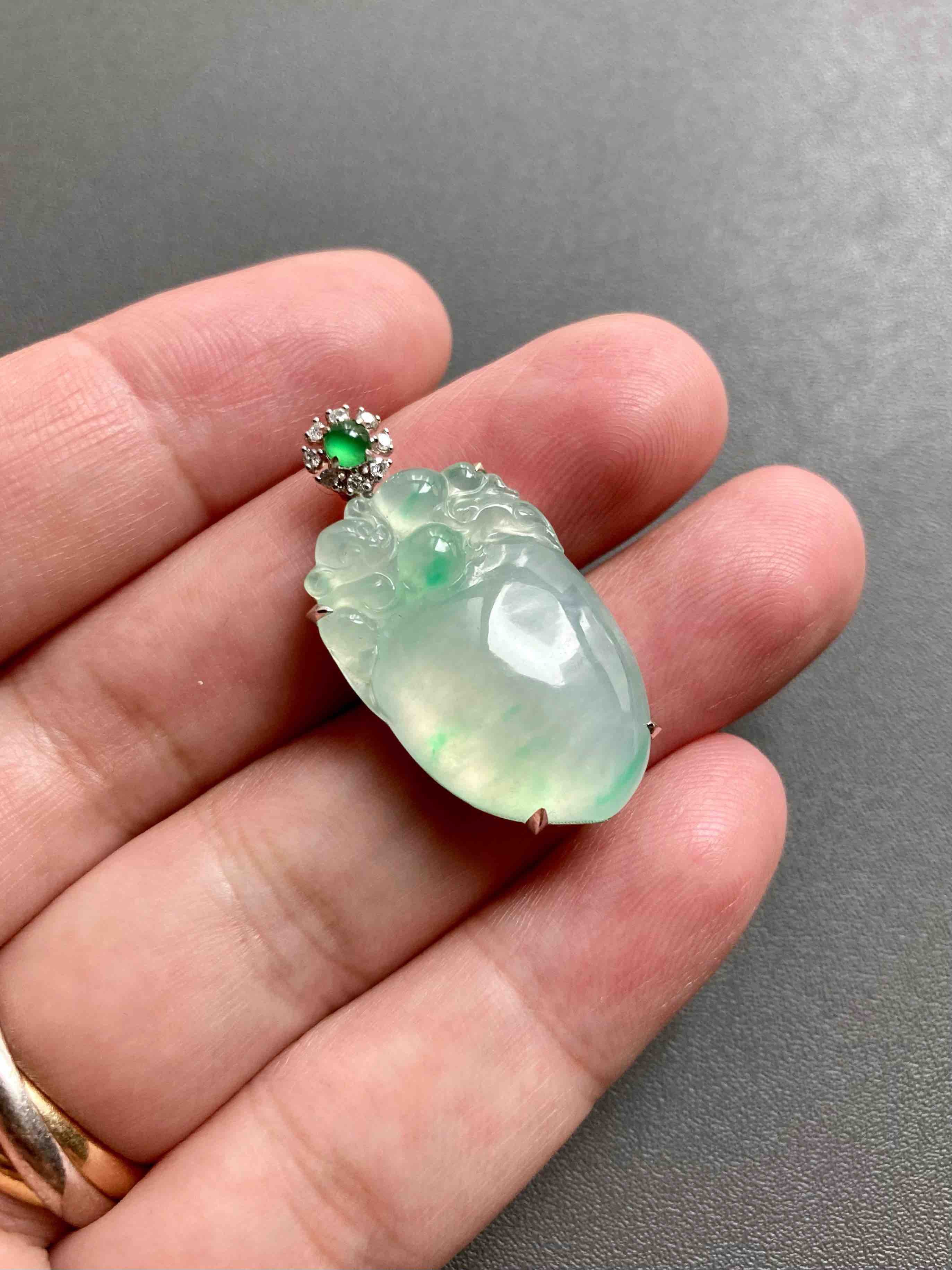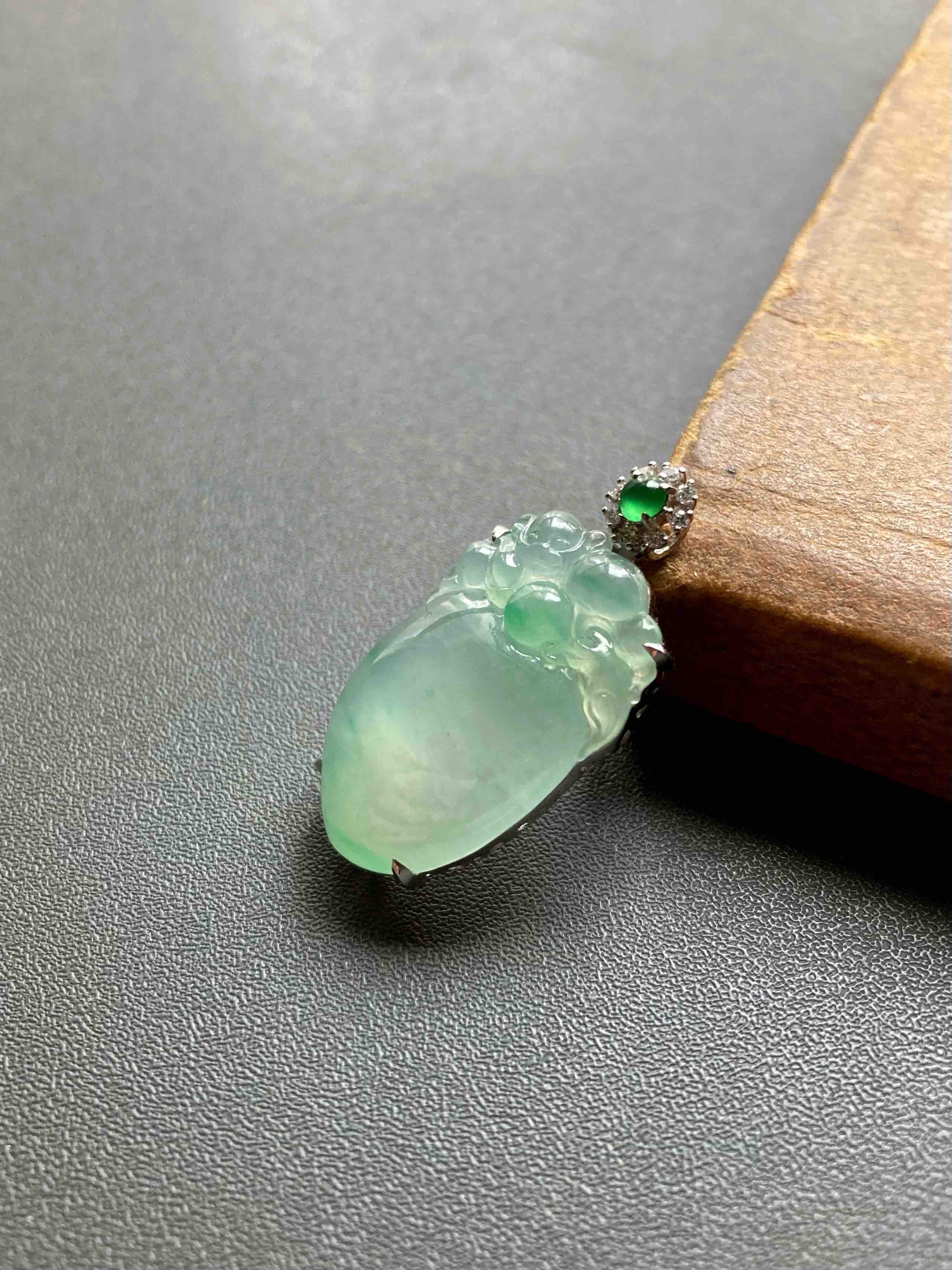 冰种飘阳绿翡翠桃子金猴捧寿18k白金钻石镶嵌