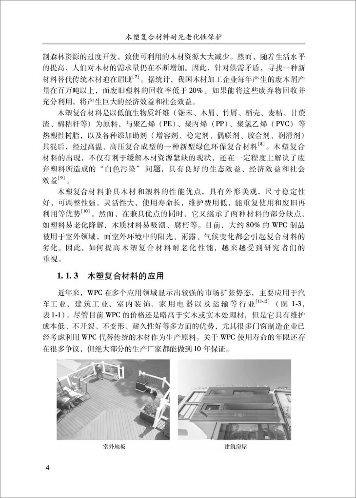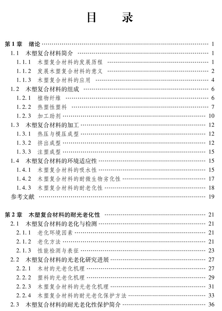 木塑复合材料作为一种绿色环保材料,被广泛应用在人们生活的各个领域,近年来保持 着快速发展的势头,目前其产量和用量均居世界前列。然而在户外使用时,复合材料会受到 自然环境因素的影响,发生老化现象,严重影响其使用寿命。本书是在总结多年相关科学研 究成果的基础上撰写而成的,系统地介绍了木塑复合材料的历史、发展、组成和生产工艺, 总结了木塑复合材料的光老化机理,并提出了改善其耐光老化性的具体方法。全书以大量数 据和丰富的例证作为支撑材料,叙述方式通俗易懂、简洁明了,兼顾实用性和学术价值。