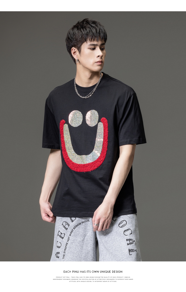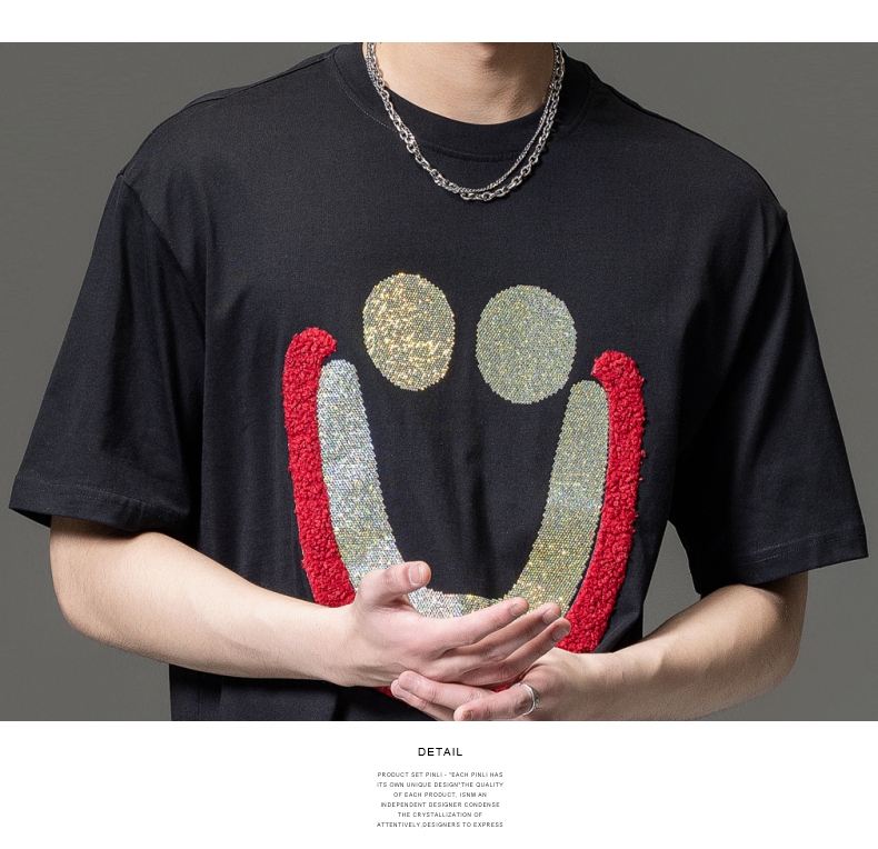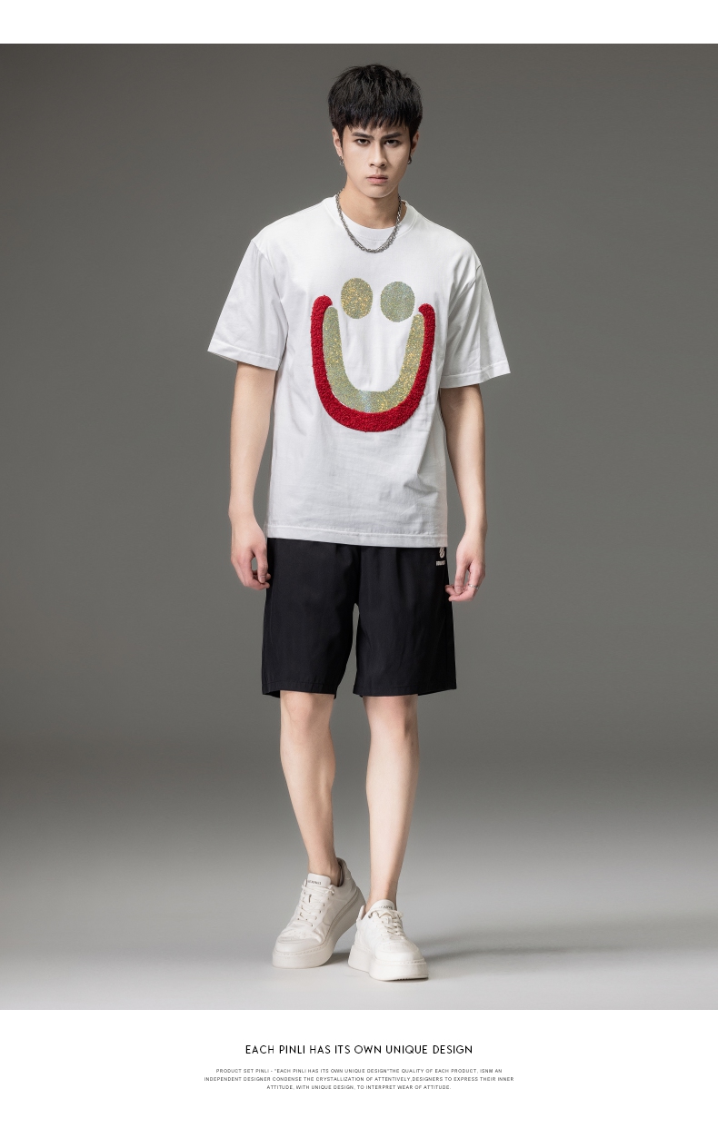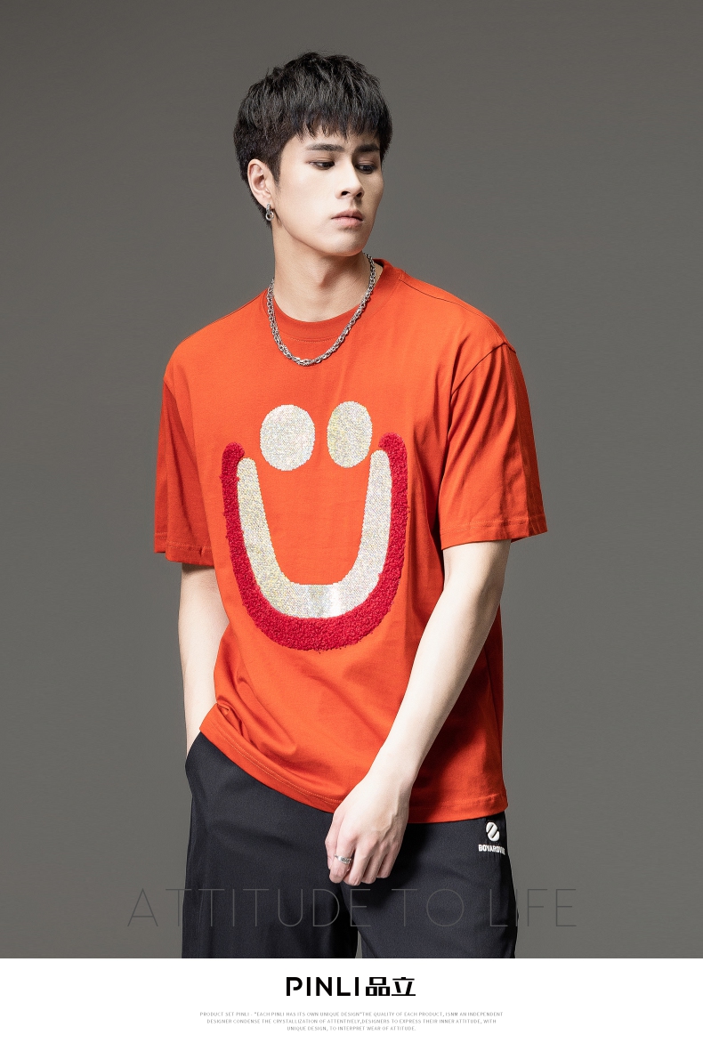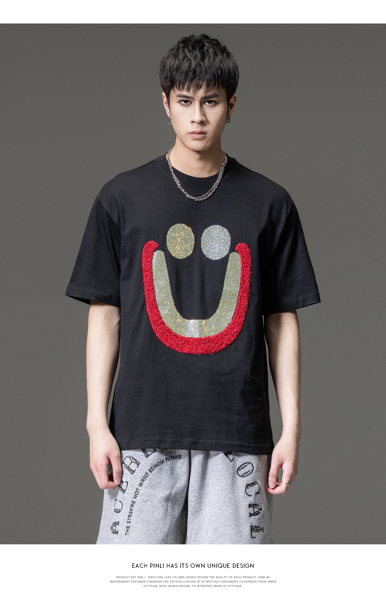 PINLI品立2023夏季新款男士落肩烫钻笑脸圆领短袖T恤BG231111084