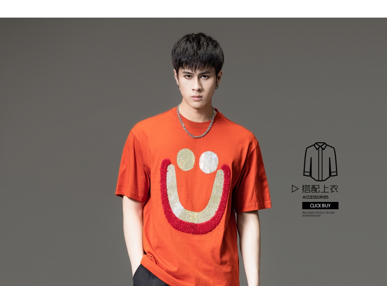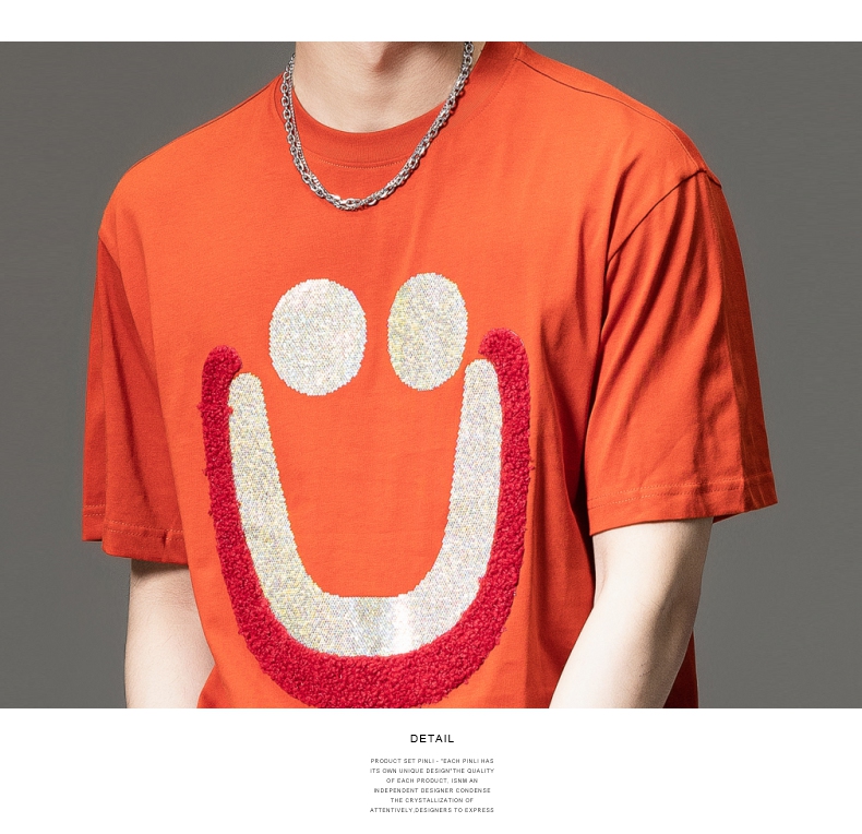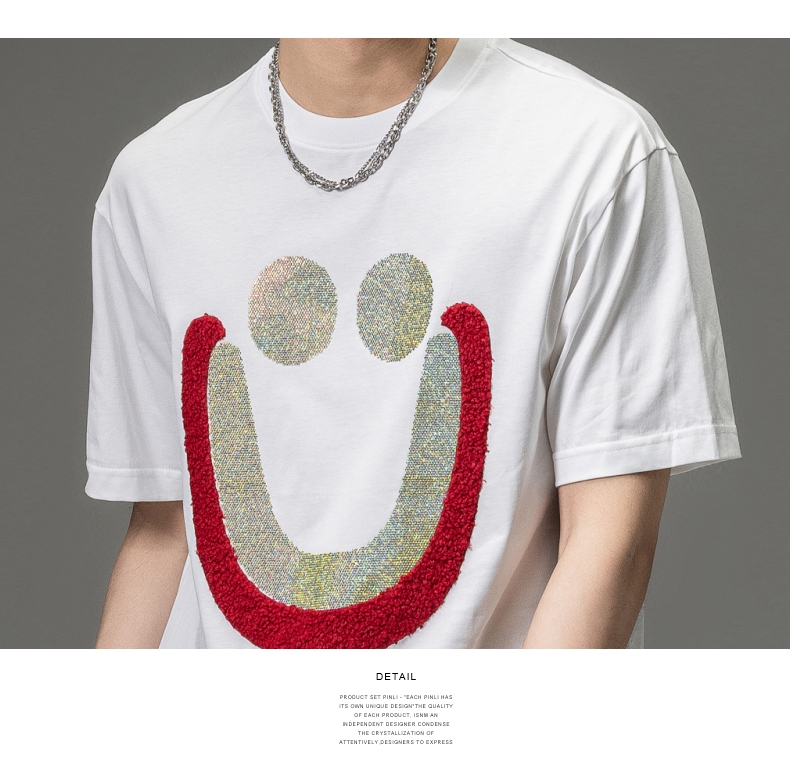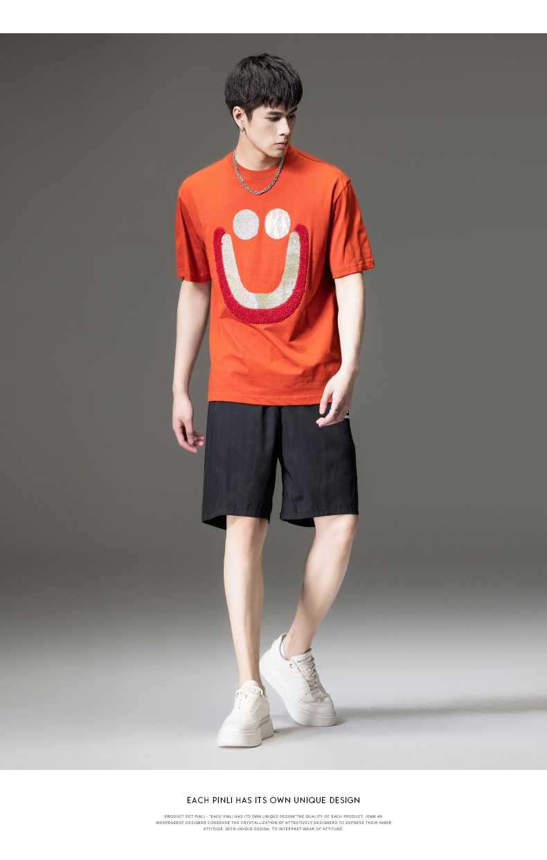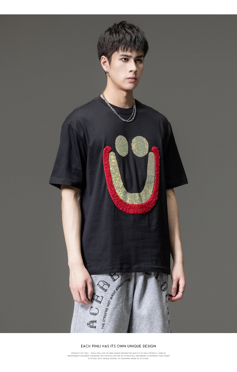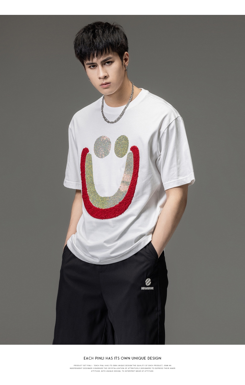 PINLI品立2023夏季新款男士落肩烫钻笑脸圆领短袖T恤BG231111084