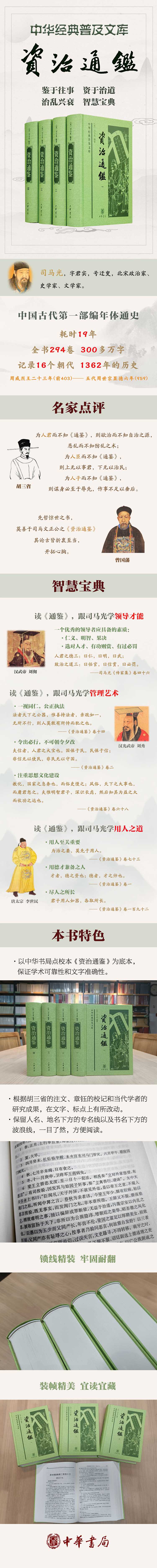 司马光写《资治通鉴》的目的,就是;鉴前世之兴衰,考当今之得失,因此《资治通鉴》自古被视为学习历史,吸取经验,学习治国理政、修身齐家之道的经典之作。书中举凡权力更迭、施政得失、制度沿替、人才进退都有详尽深入的记载,这些内容也是《通鉴》一书的精华所在;其中所蕴含的领导艺术、管理经验、用人智慧、权谋战略等,至今仍具有重要参考价值,是人们学习历史、汲取智慧、指导人生的不二之选。