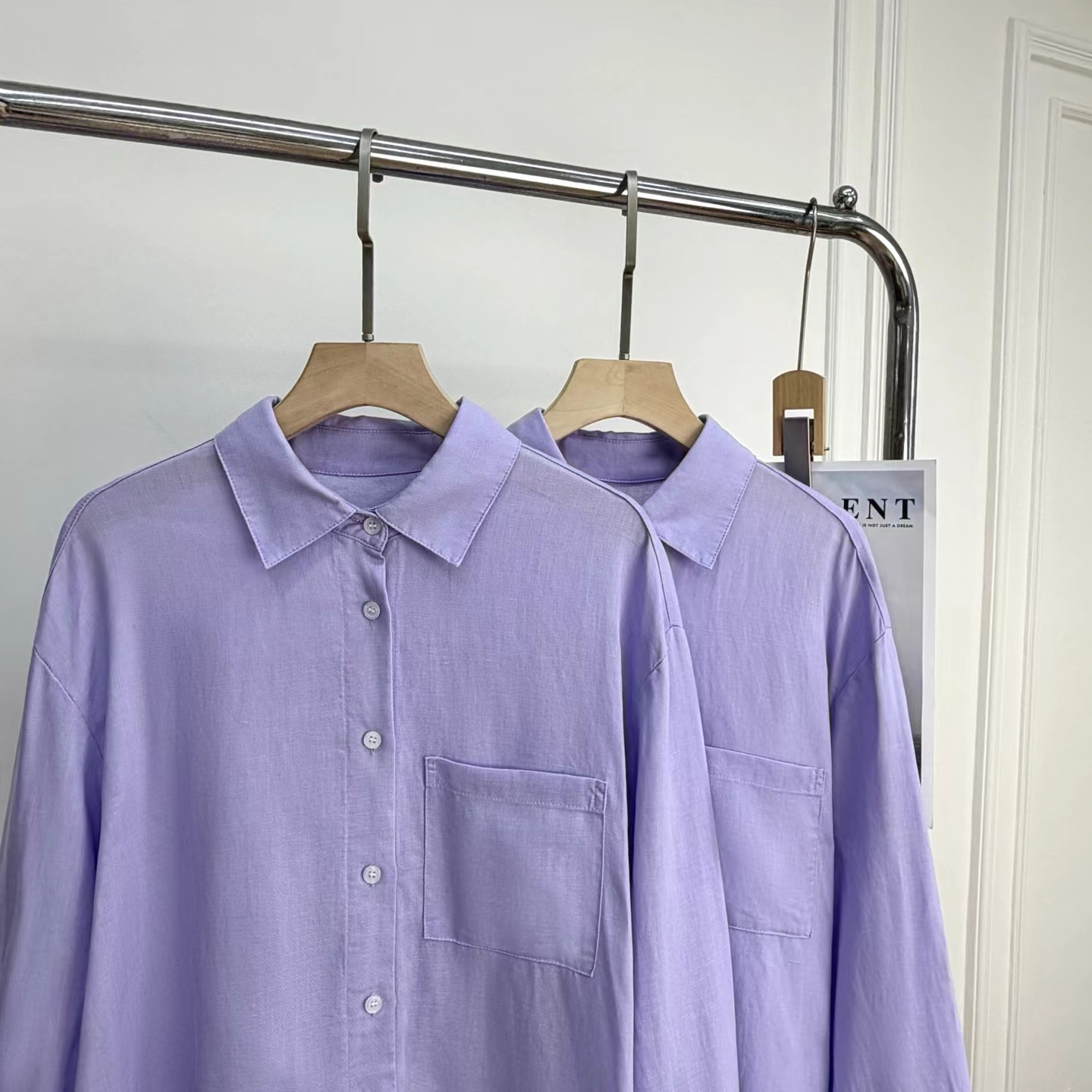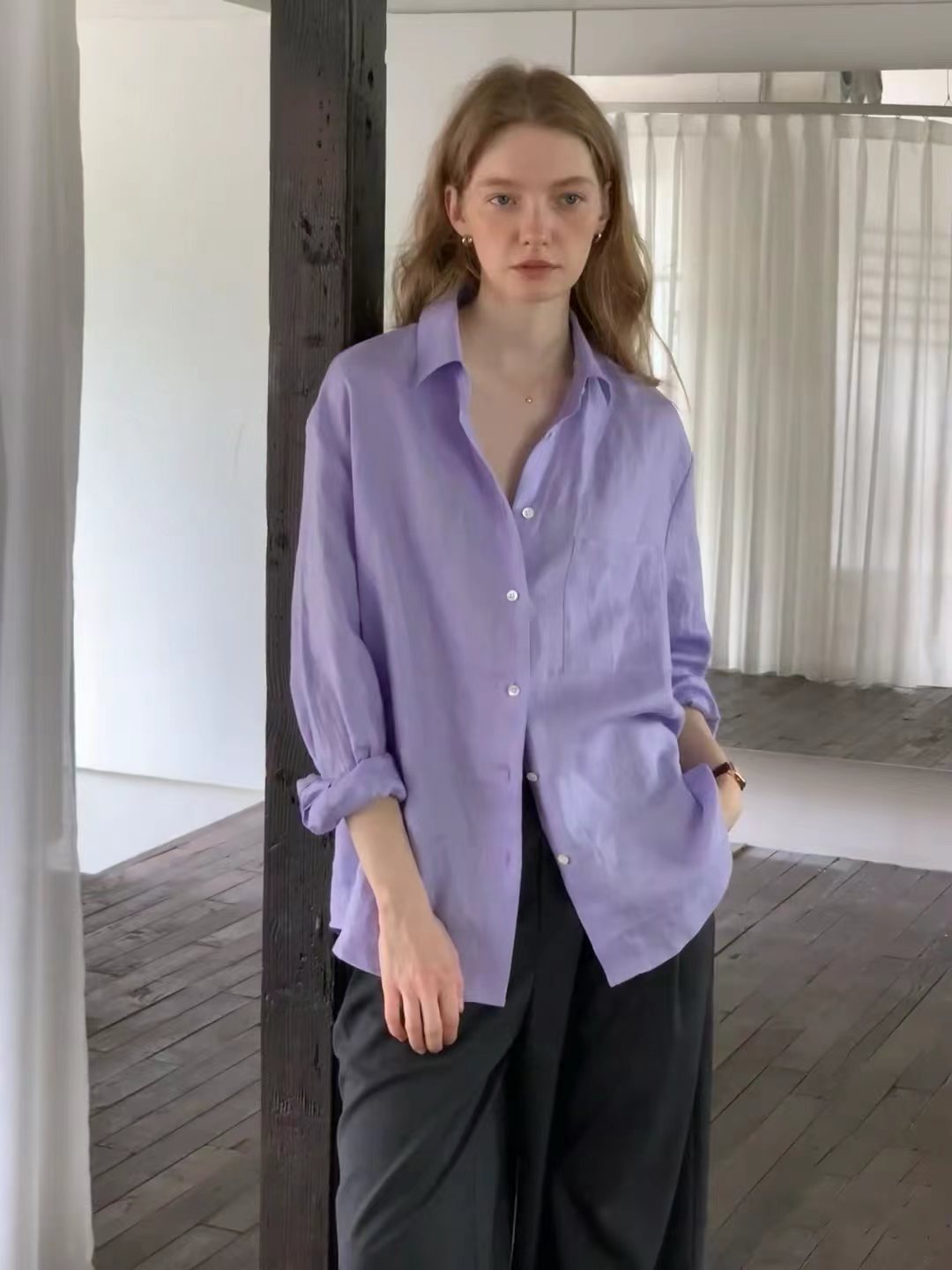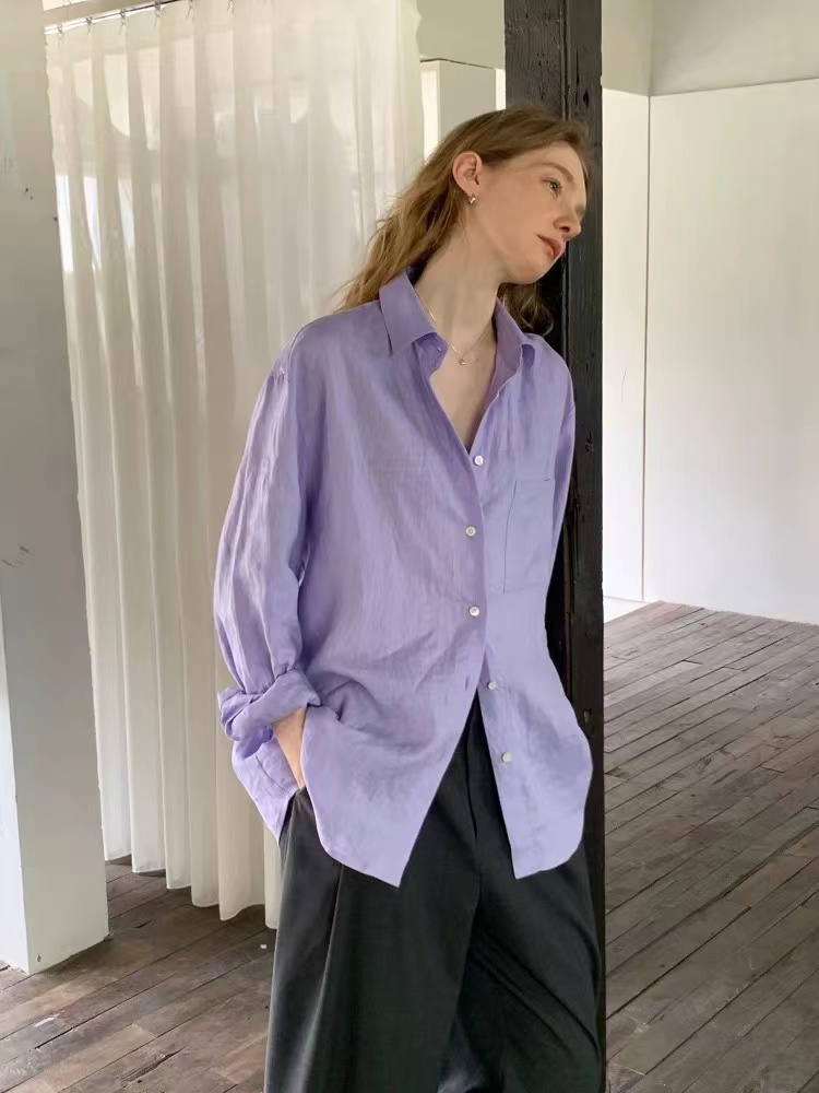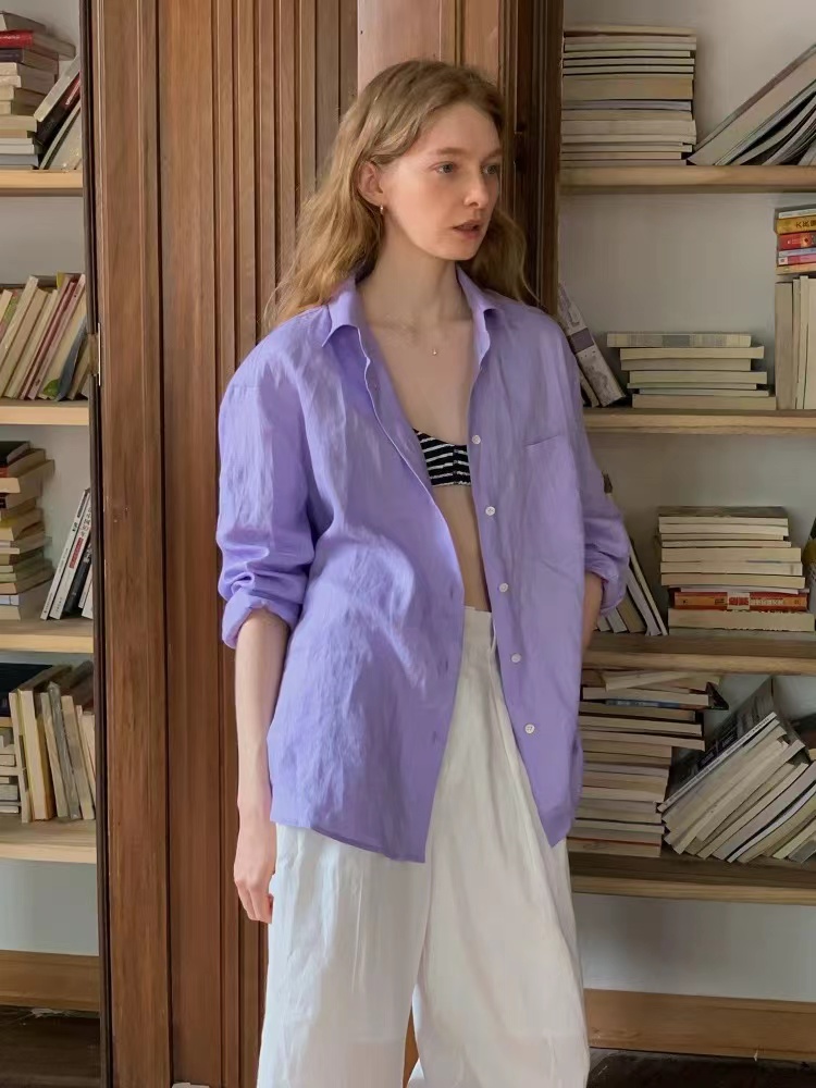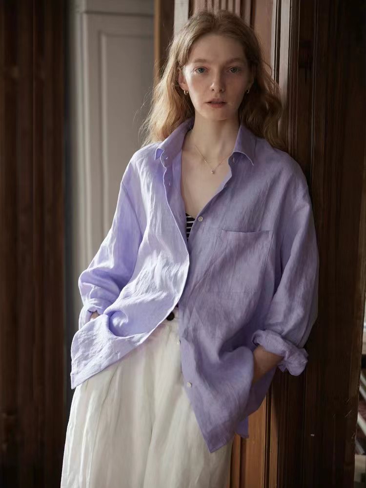 2026早春新款天丝亚麻香芋烟熏紫色长袖衬衫,烟熏紫-衬衫!春夏想出一款清爽一点的衬衫,挑了很久,才选上这款紫色的天丝亚麻料衬衫。它不像鲜艳的紫那么刺眼,比较柔和舒适,确实在市面上很少见,日常更不易撞衫~宽松的廓形,在春夏更显轻盈舒适,剪裁利落线条流畅平整有型,为身体留有松弛的空间。翻领+落肩袖设计轻松穿出“纸片人”既视感,慵懒气质轻松拿捏,展现颈部线条和气质,也能展现干练和自信。门襟做撞色扣子,紫配白色纽扣,看起来会更加显得清爽一些;胸前单侧做口袋设计,增添设计感。袖子长至手腕,显得整洁利落,底摆圆弧设计,线条流畅平整有型,为身体留有适当的空间,细节处增加质感!买过亚麻的姐妹应该都了解亚麻材质,就是自然又舒适,仔细看还带有一些麻结。唯yi缺点就是洗后会发硬,但是我们做的加入了天丝,中和了亚麻发硬的缺点,整体就是挺括造型的同时更加舒适稳固耐穿~