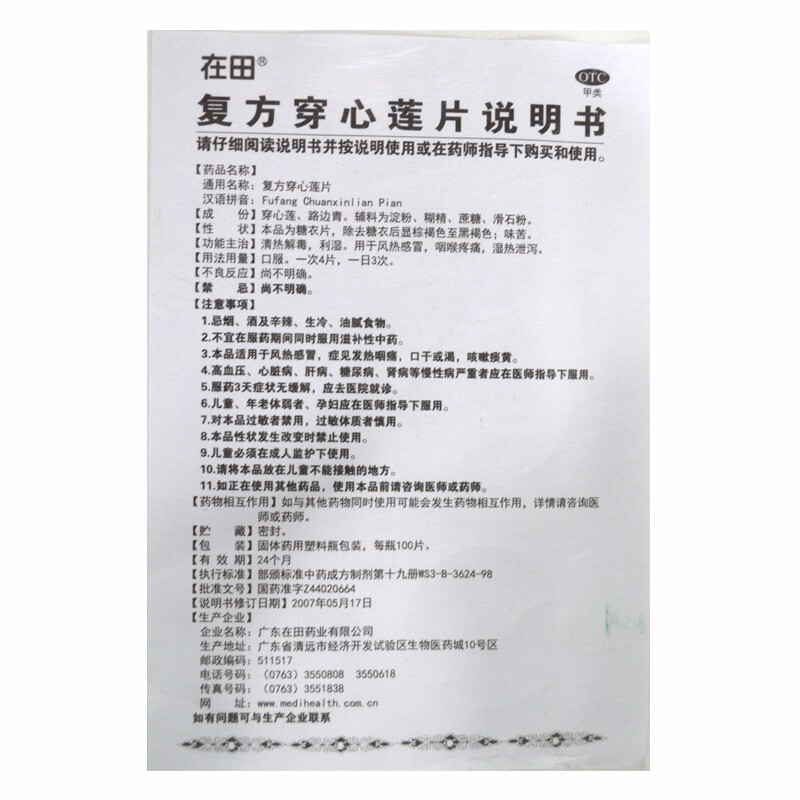 在田 复方穿心莲片 100片/瓶 风热伤风,咽喉疼痛,湿热泄泻