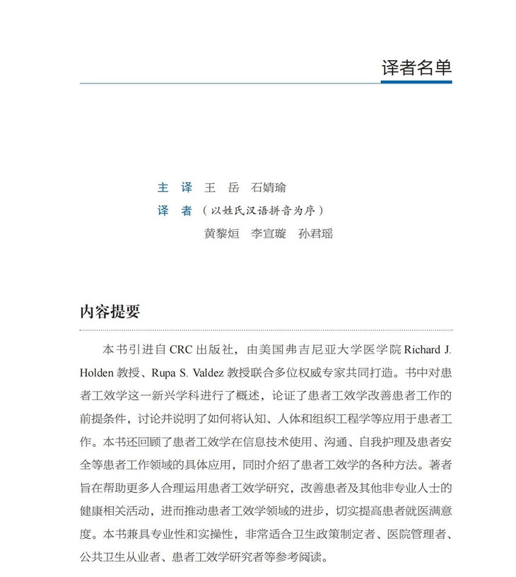 《精益诊疗:运用患者工效学提高就医满意度》引进自CRC出版社,由美国弗吉尼亚大学医学院RichardJ.Holden教授、RupaS.Valdez教授联合多位专家共同打造。书中对患者工效学这一新兴学科进行了概述,论证了患者工效学改善患者工作的前提条件,讨论并说明了如何将认知、人体和组织工程学等应用于患者工作。