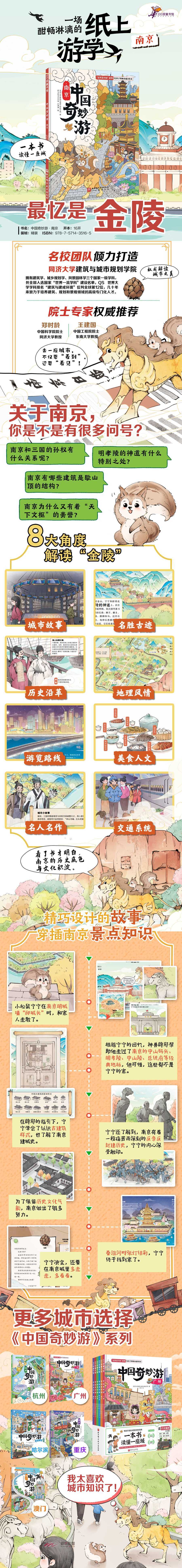 首印即赠涂色卡! 名校团队倾力打造,两院院士推荐,带孩子了解南京的前世今生。 一次酣畅淋漓的纸上游学,让孩子了解南京背景文化,带着;心眼去旅行,能收获更多。 南京和三国的孙权有什么关系呢?明孝陵的神道有什么特别之处?南京有哪些建筑是歇山顶的结构?南京为什么有;天下文枢的美誉? 8大角度解读南京:城市故事、名胜古迹、历史沿革、地理风情、美食人文、游览路线、名人名作、交通系统。 精巧设计的趣味故事,穿插融合城市景点知识,孩子能边走边学知识。