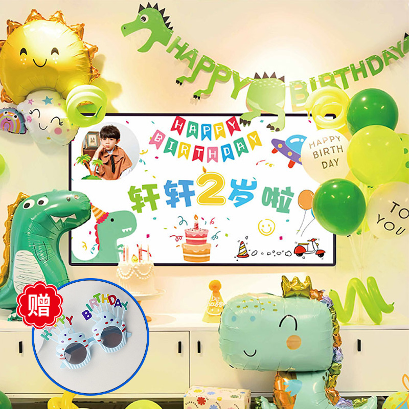 【内含:恐龙气球*2、太阳云朵气球*1、生日拉旗*1、白色印字气球*2、哑光气球深绿*4、浅绿*4、白*2、波点气球*2、长条气球浅绿*2、黄*2、气球支架*1、赠送眼镜1个】