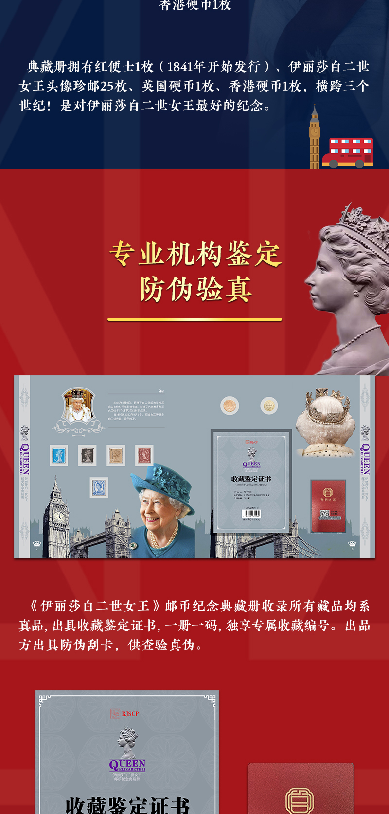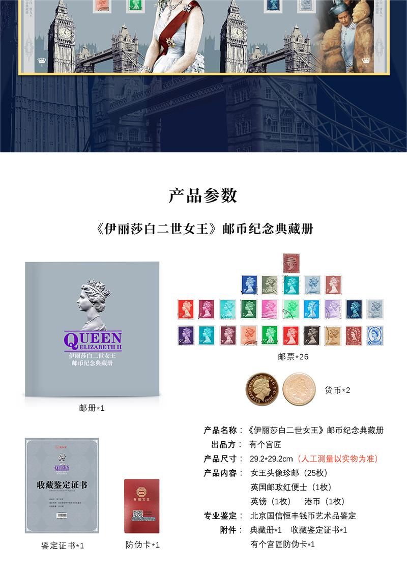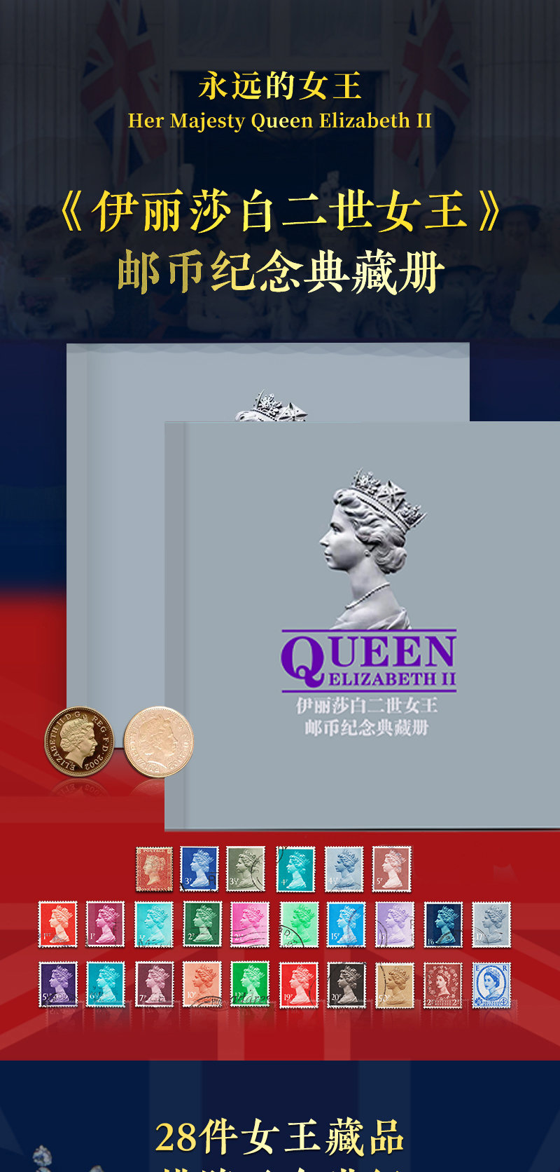 《伊丽莎白二世女王》邮币纪念典藏册 珍邮26枚、英国硬币1枚、香港硬币1枚