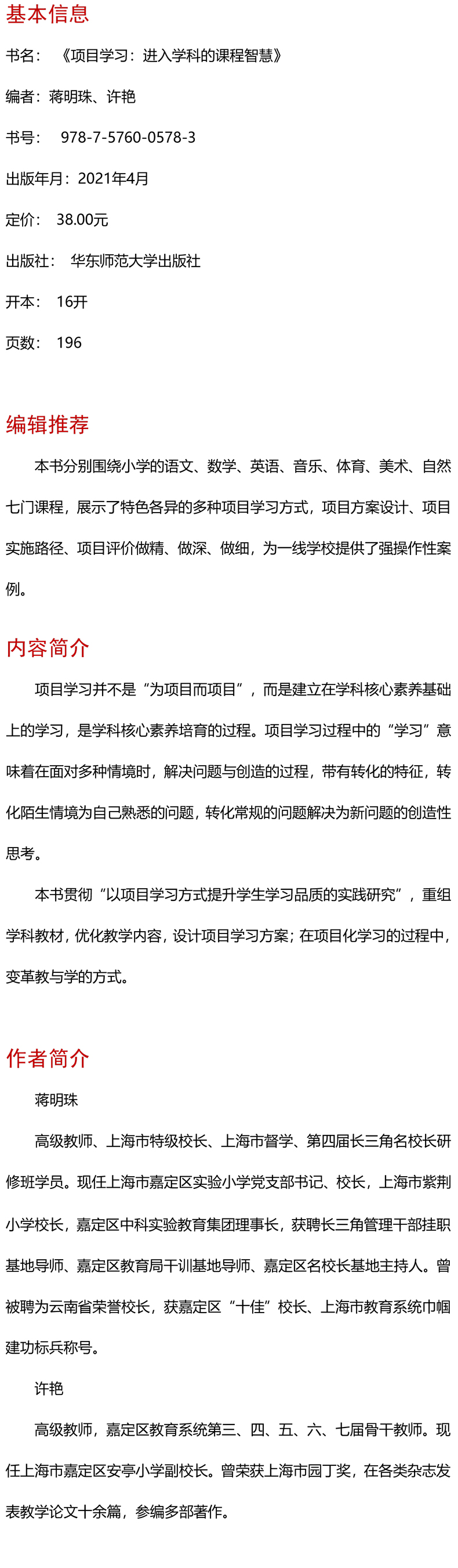 项目学习 进入学科的课程智慧 蒋明珠 许艳主编 小学案例 教师读物