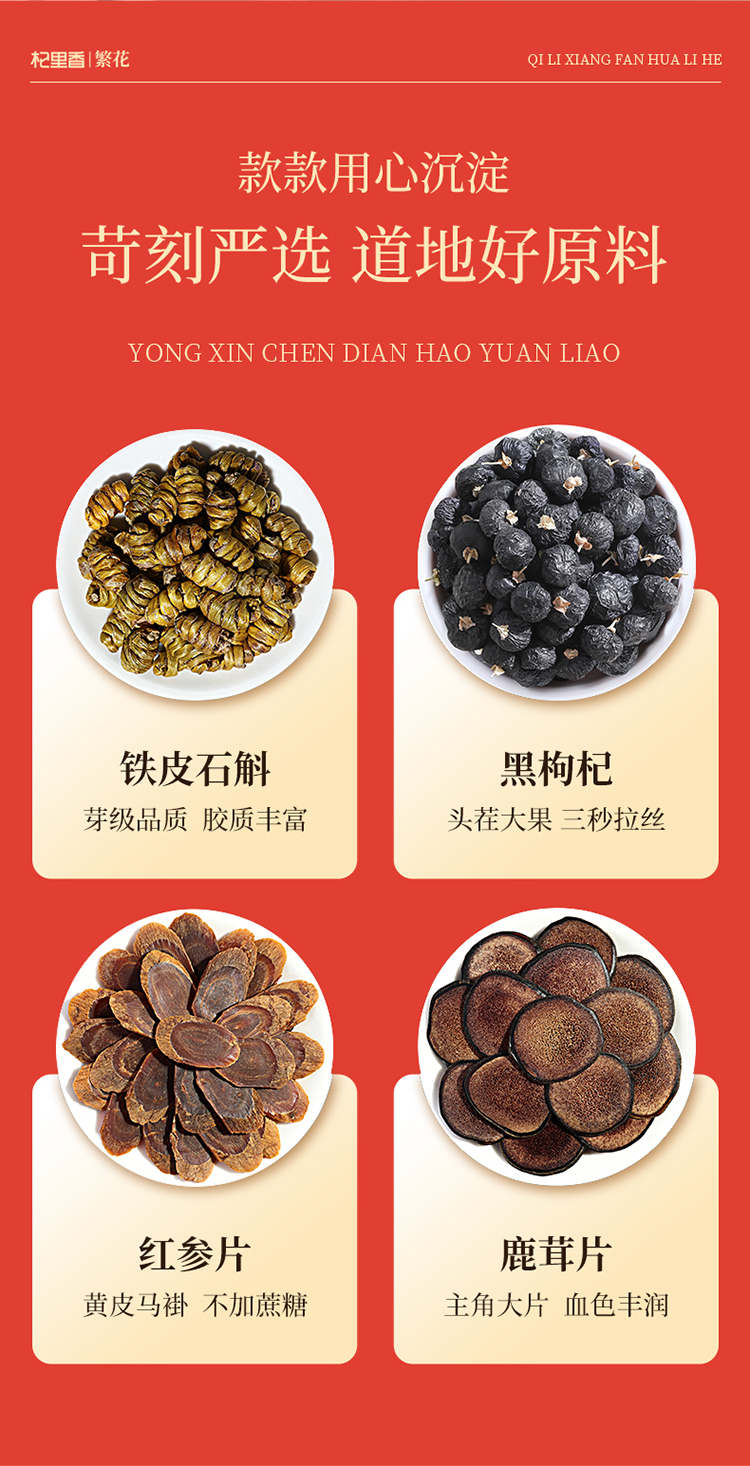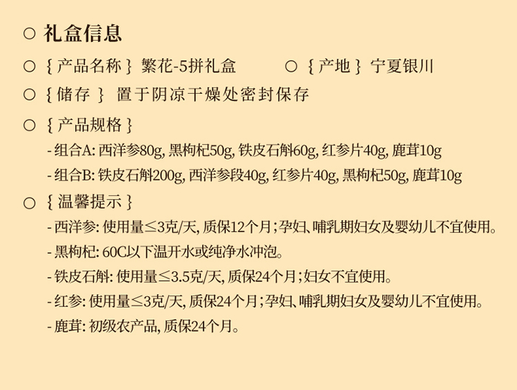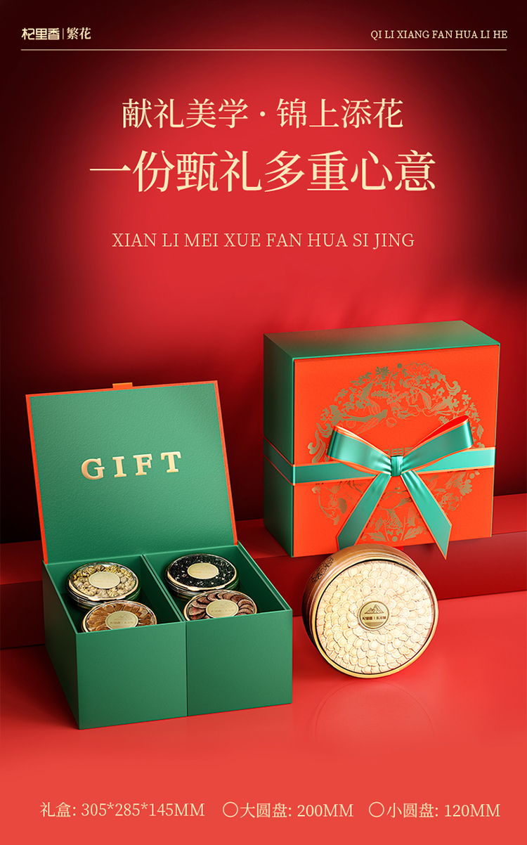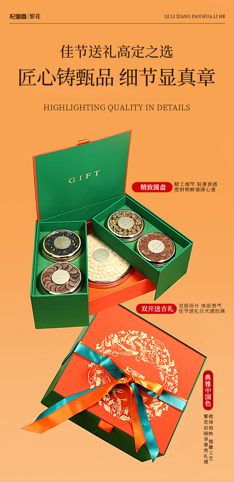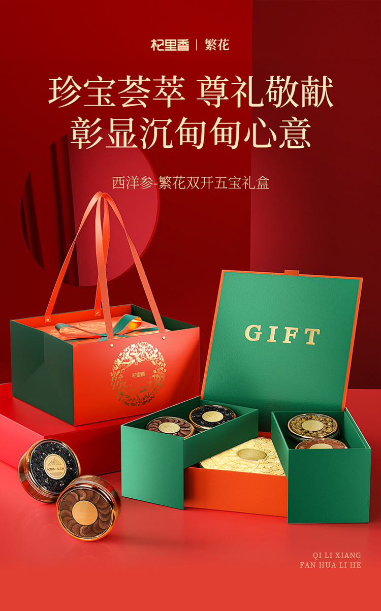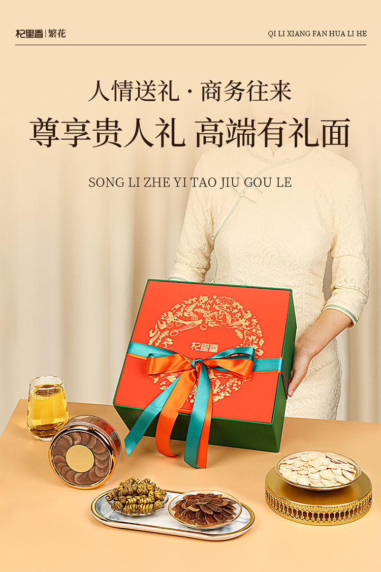 【冬季滋补】杞里香240g双层繁华5拼礼盒-A含西洋参80,石斛60g,红参40g,鹿茸10g,黑枸杞50g高颜值双层繁华礼盒送礼年货中秋过年典雅中国色:橙绿搭配繁华锦簇,彰显尊贵华丽