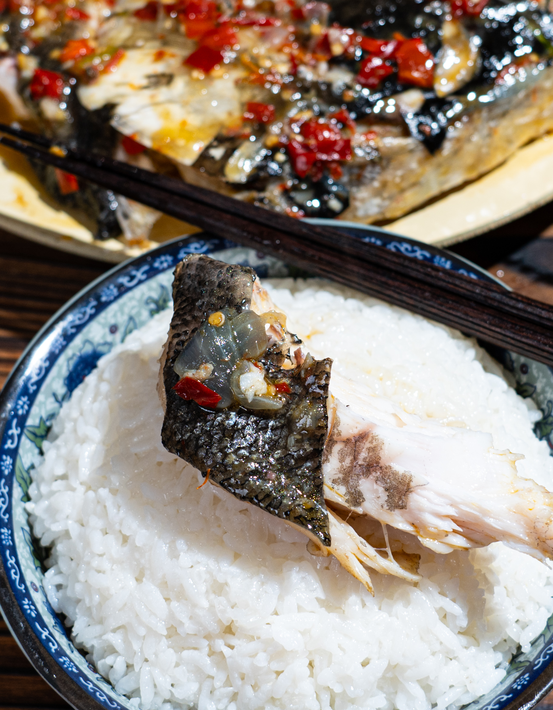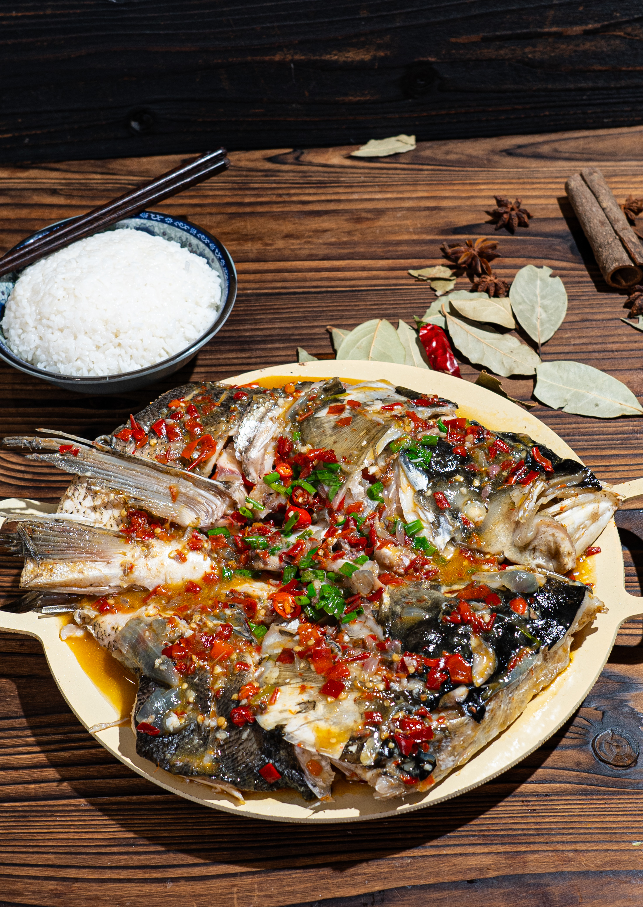 3、蒸锅水烧开后,放入鱼头,大火蒸熟(蒸制时间视鱼头大小调整);