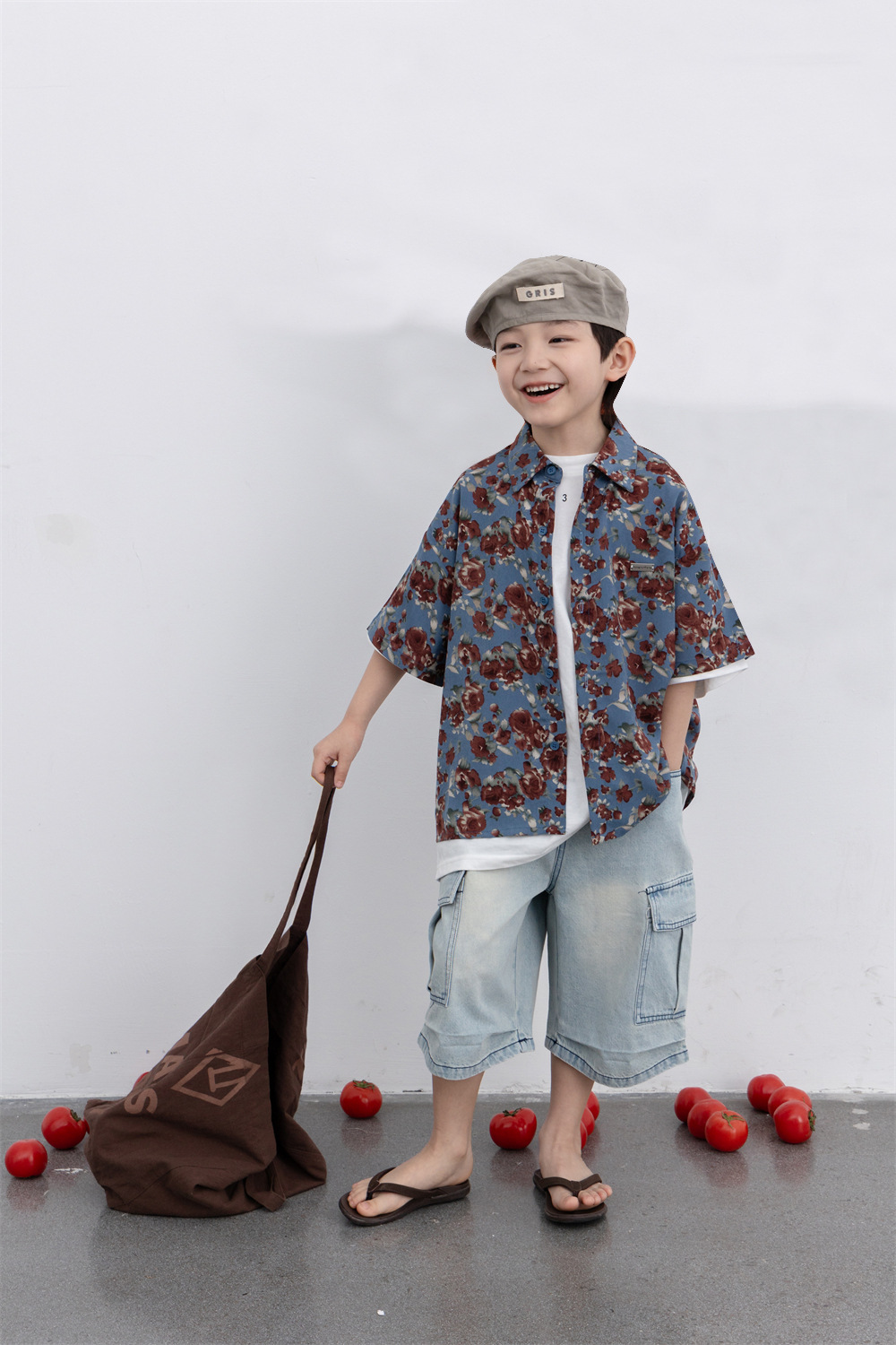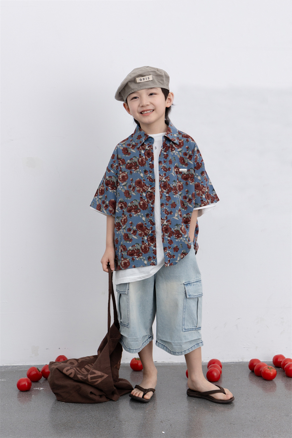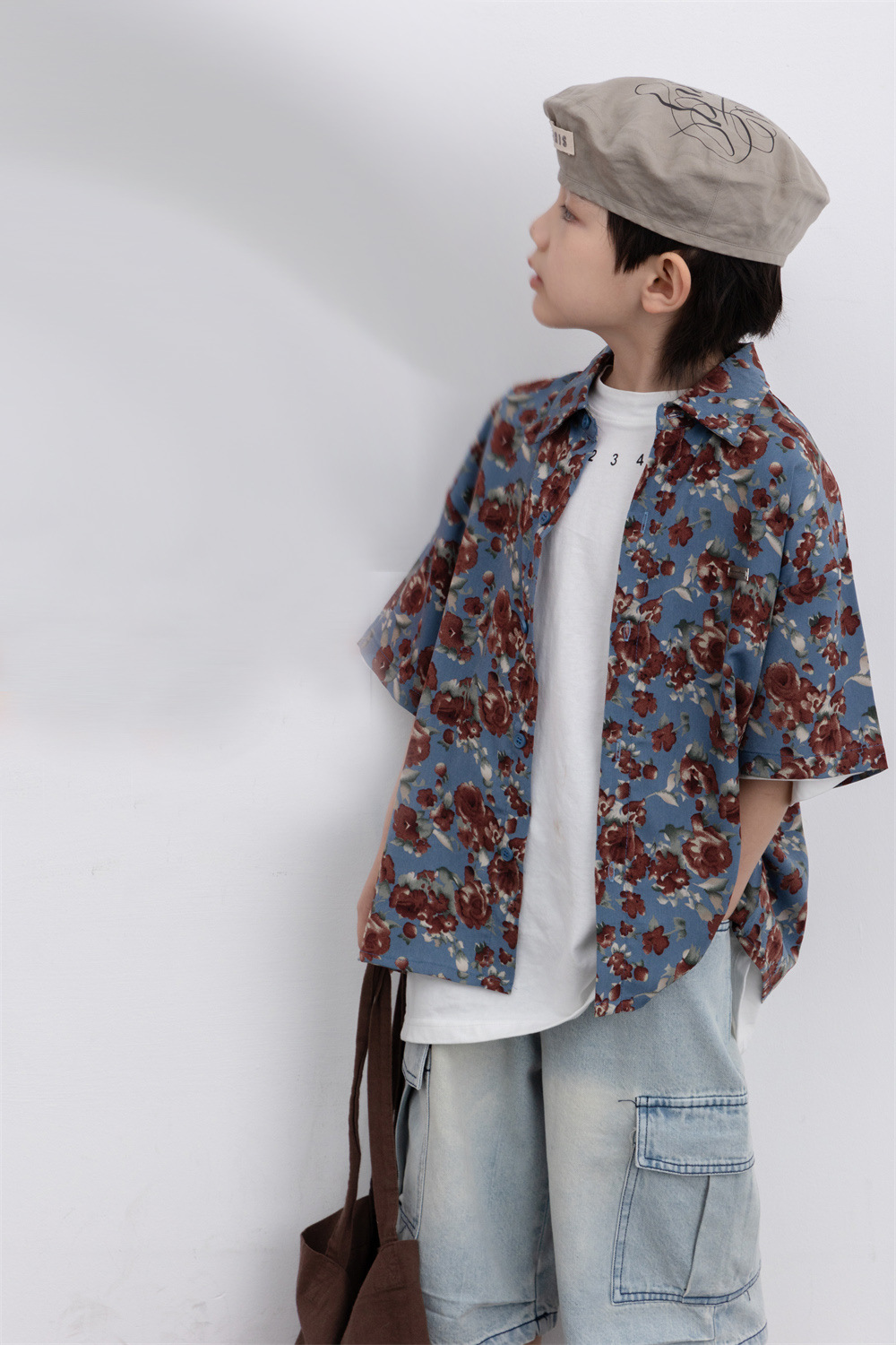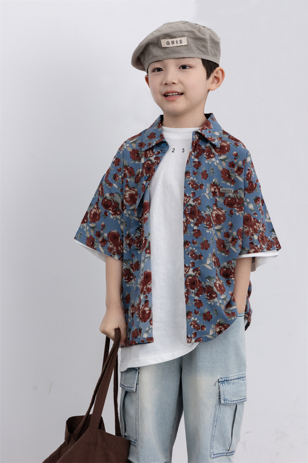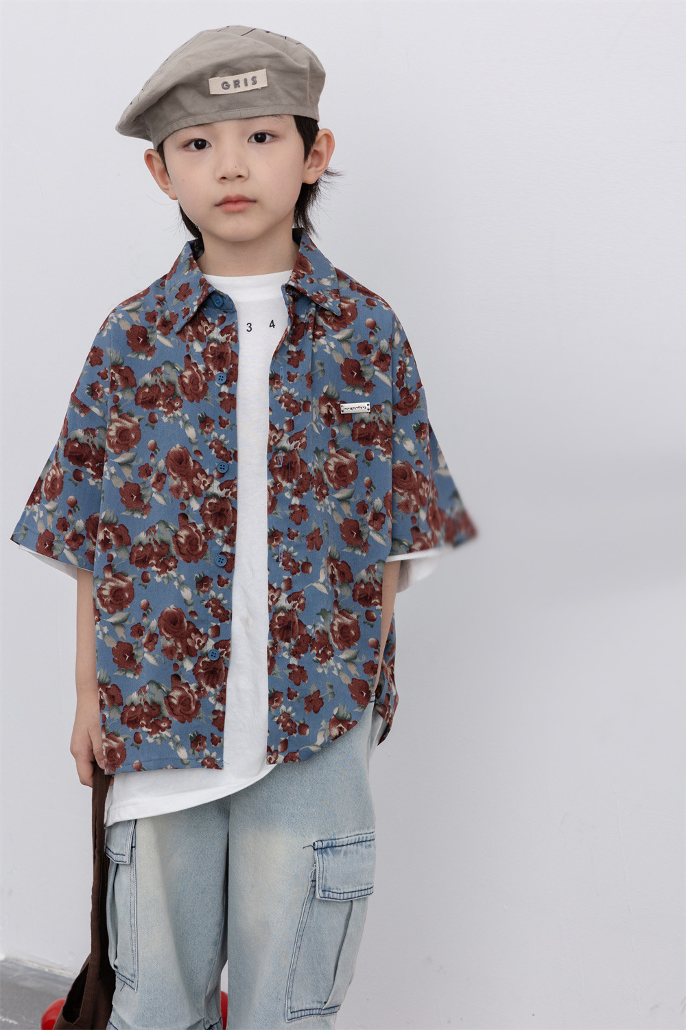 奶酪与喵男童印花休闲短袖衬衫2024夏季新款满身衬衣儿童韩版上衣