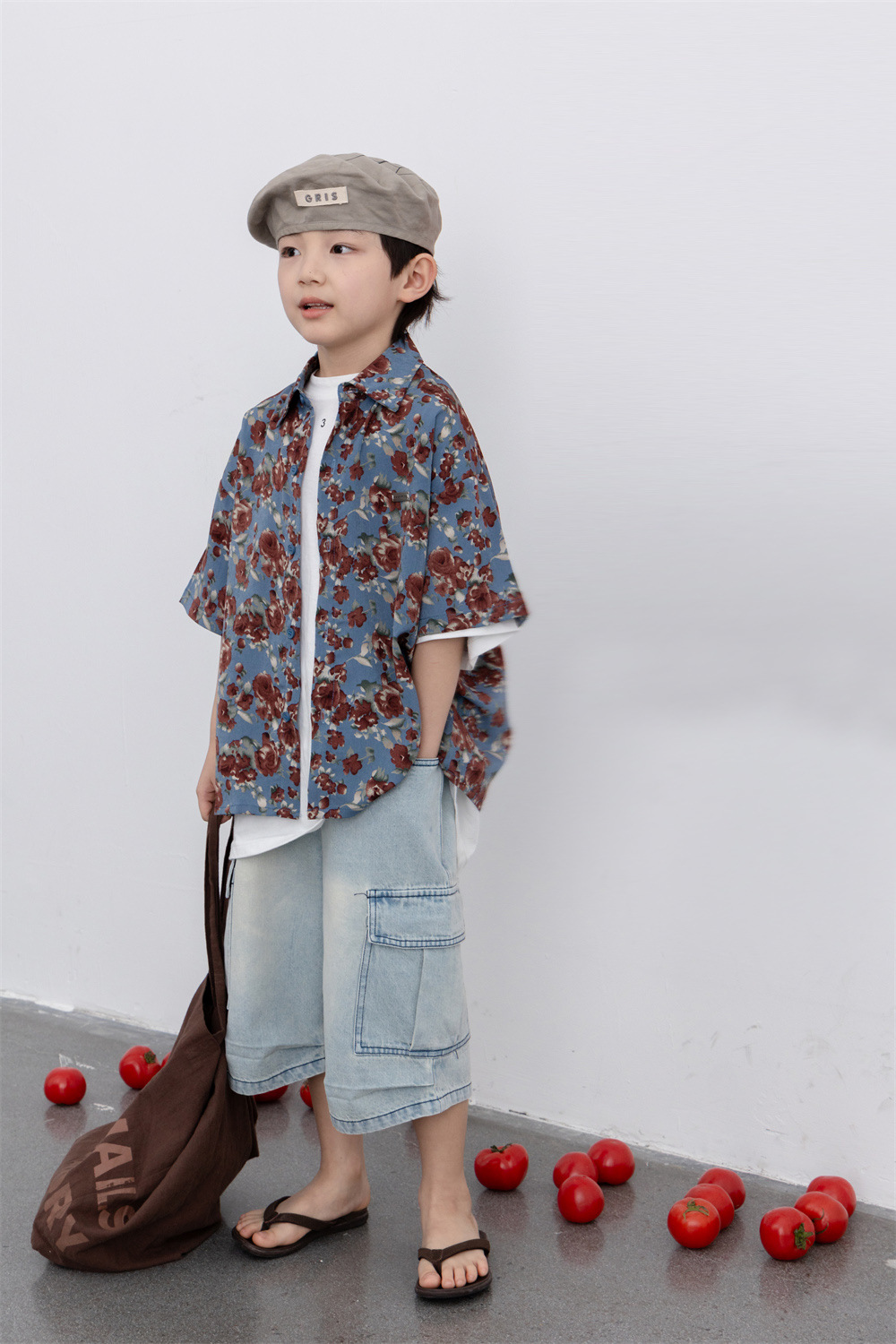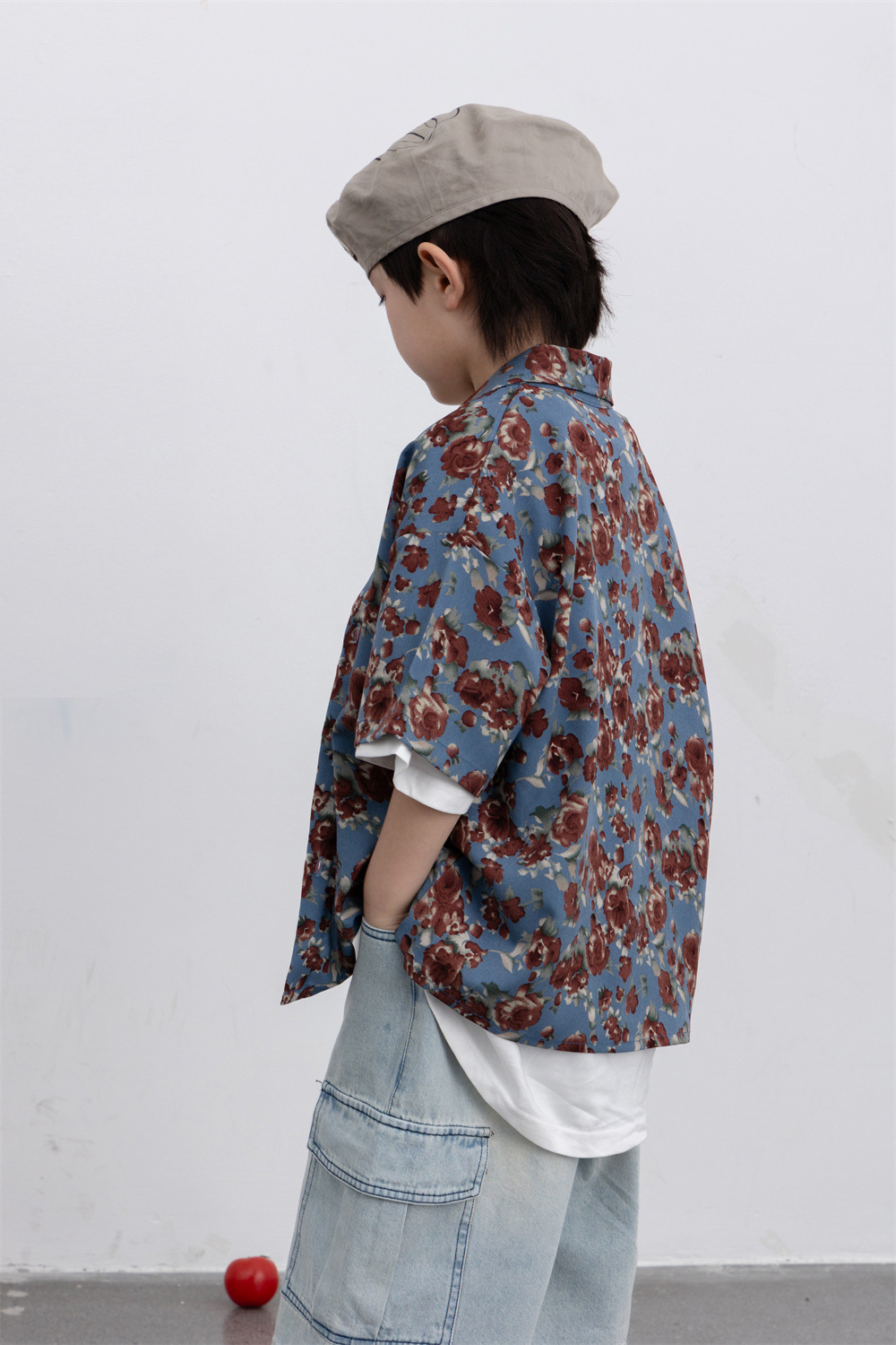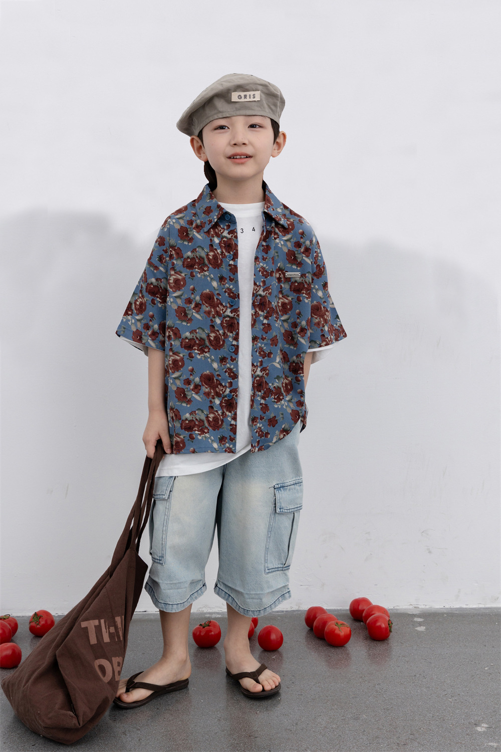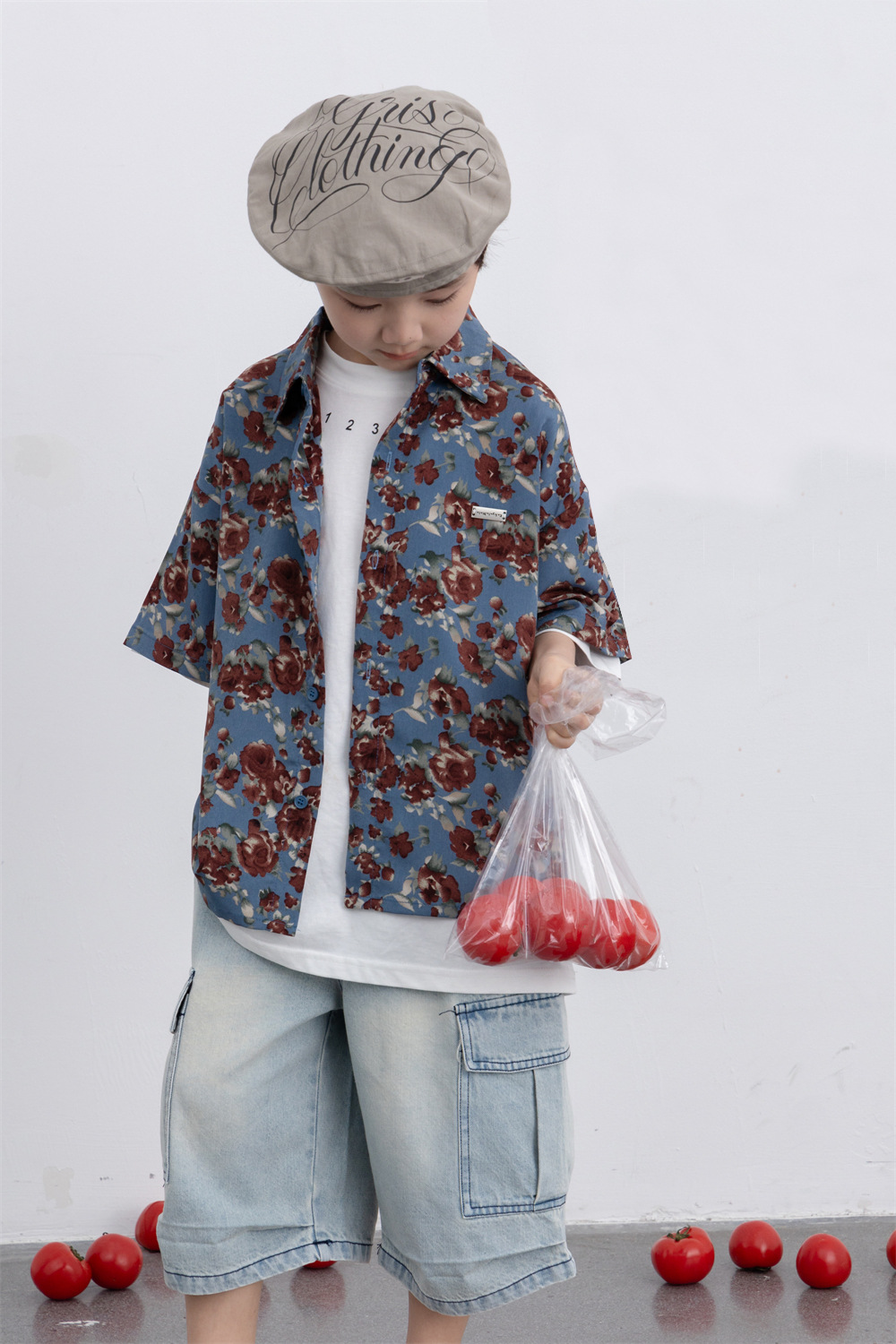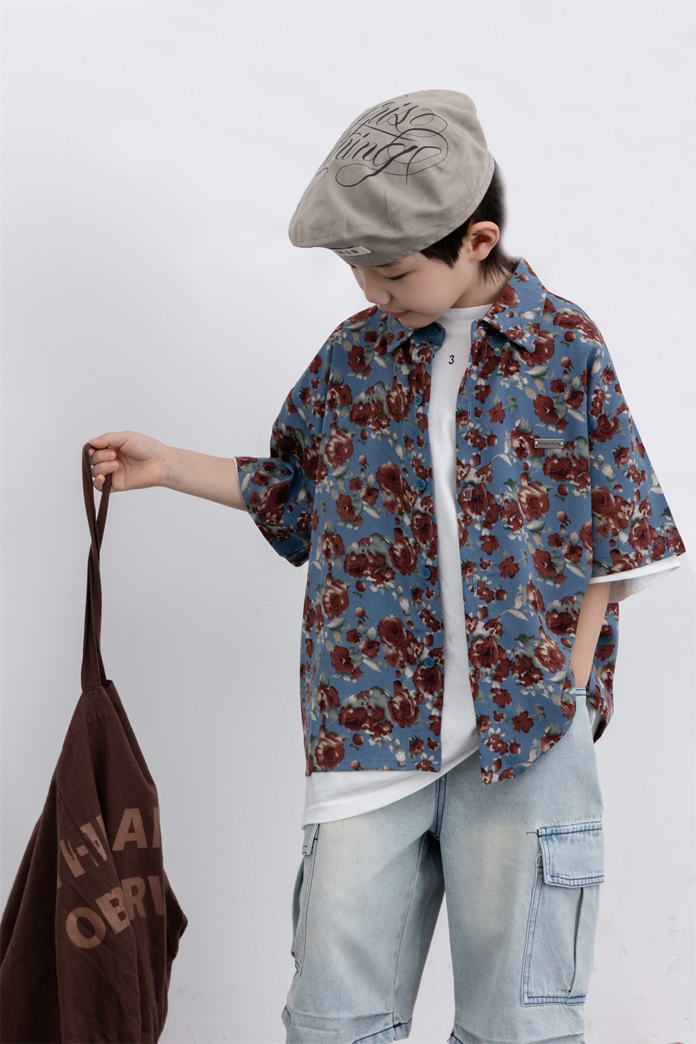 奶酪与喵男童印花休闲短袖衬衫2024夏季新款满身衬衣儿童韩版上衣