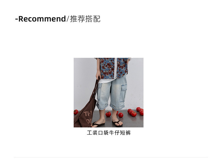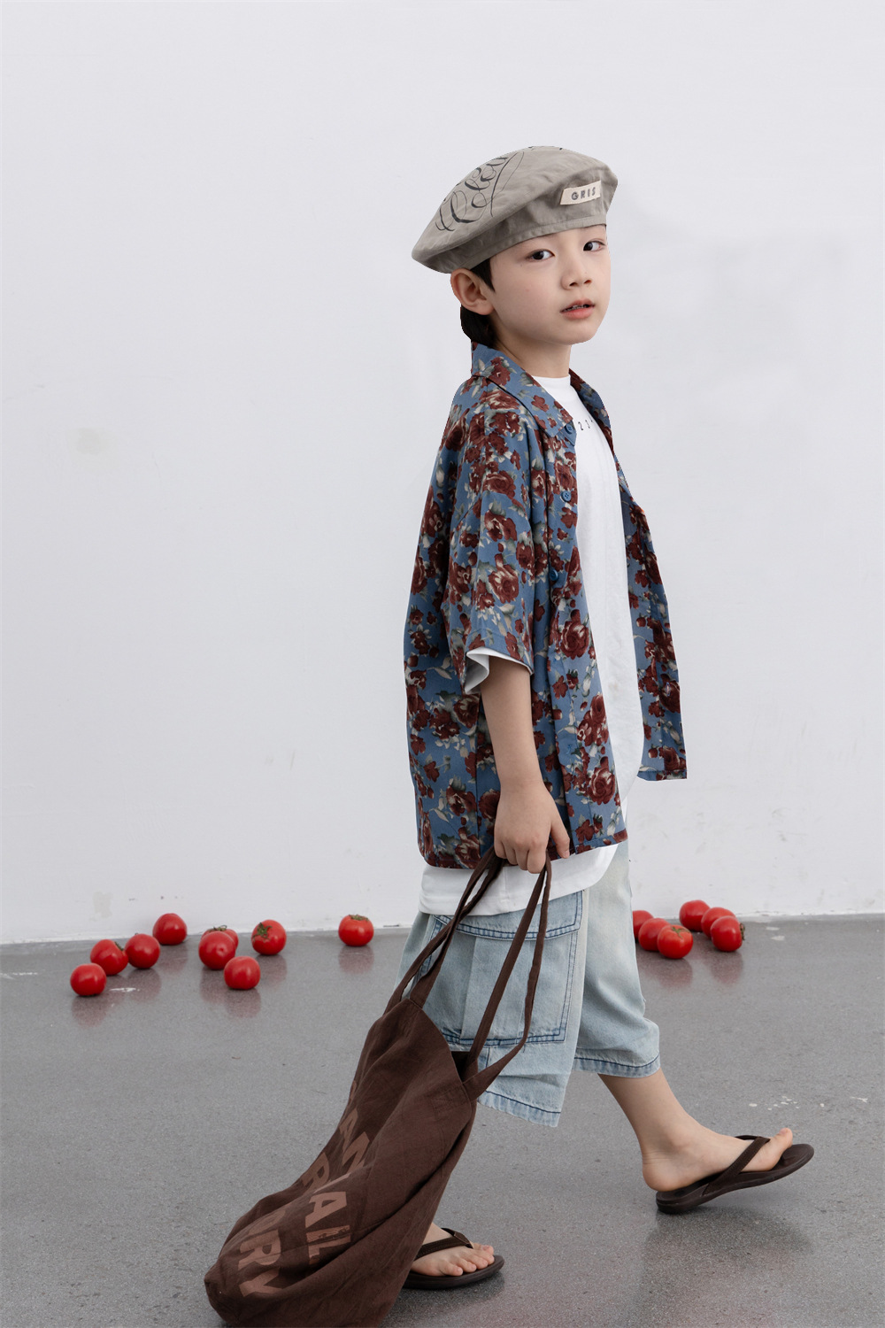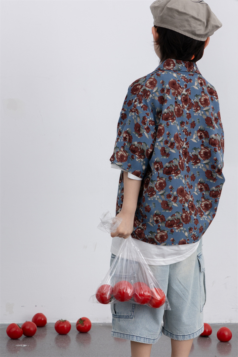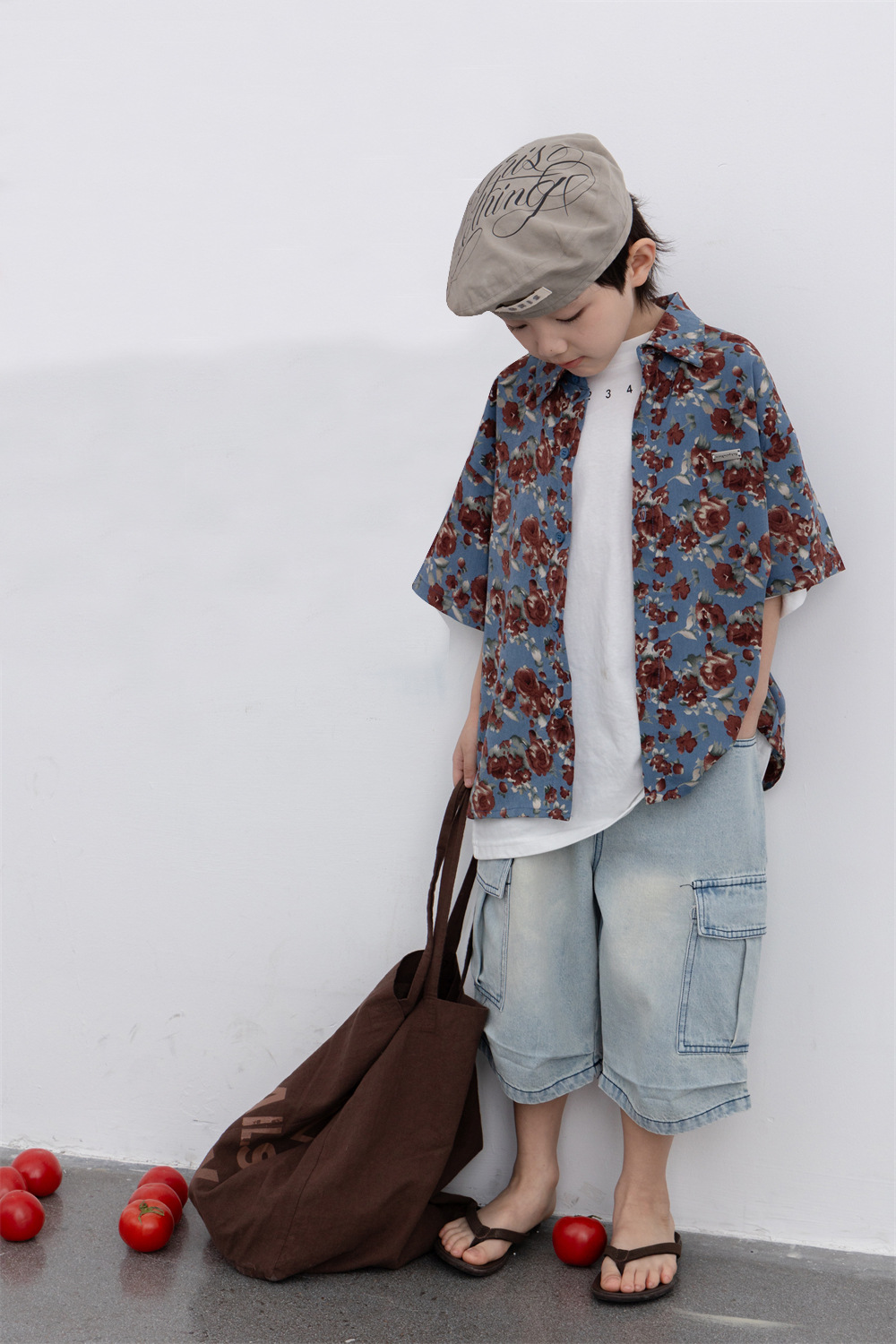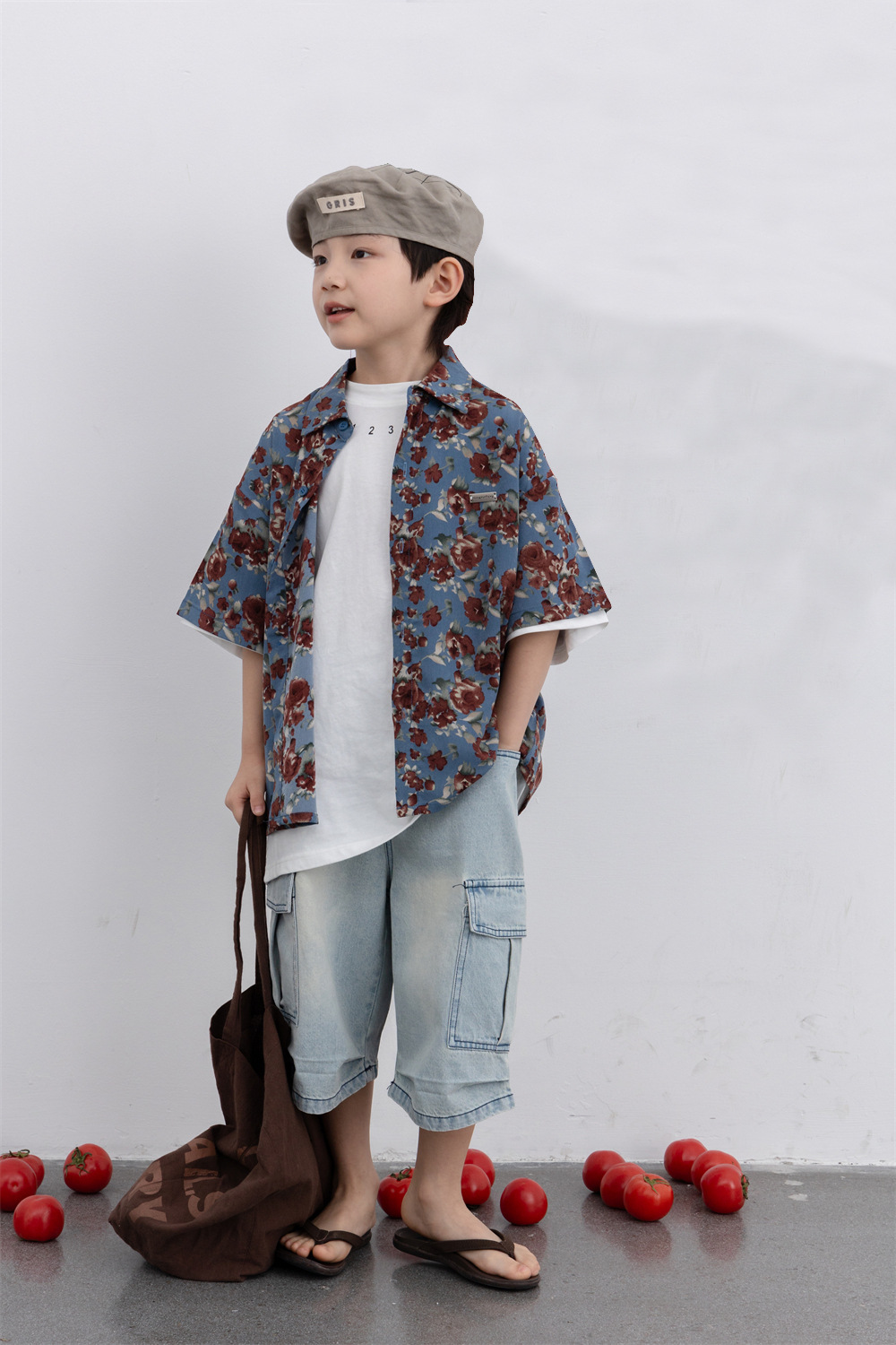 奶酪与喵男童印花休闲短袖衬衫2024夏季新款满身衬衣儿童韩版上衣