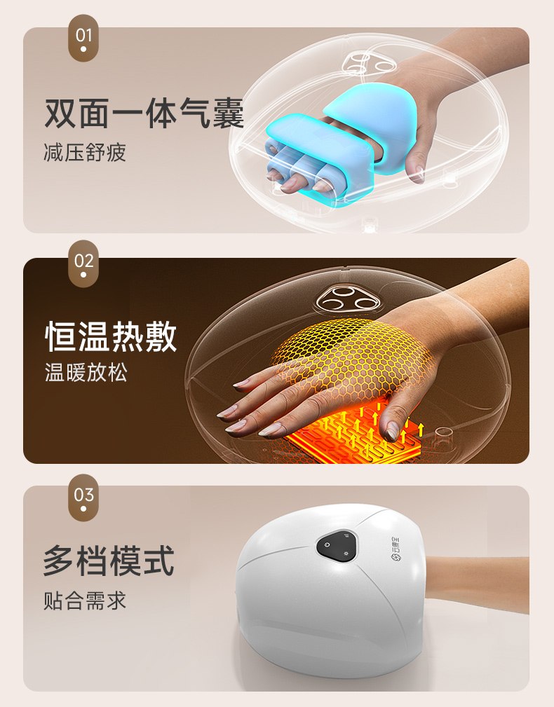 不同于传统机械按摩,气囊3D按摩更加温和舒适,不会对手造成额外的压力和负担。