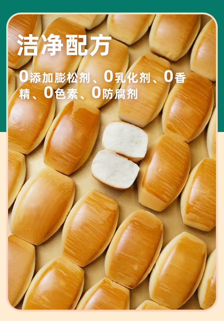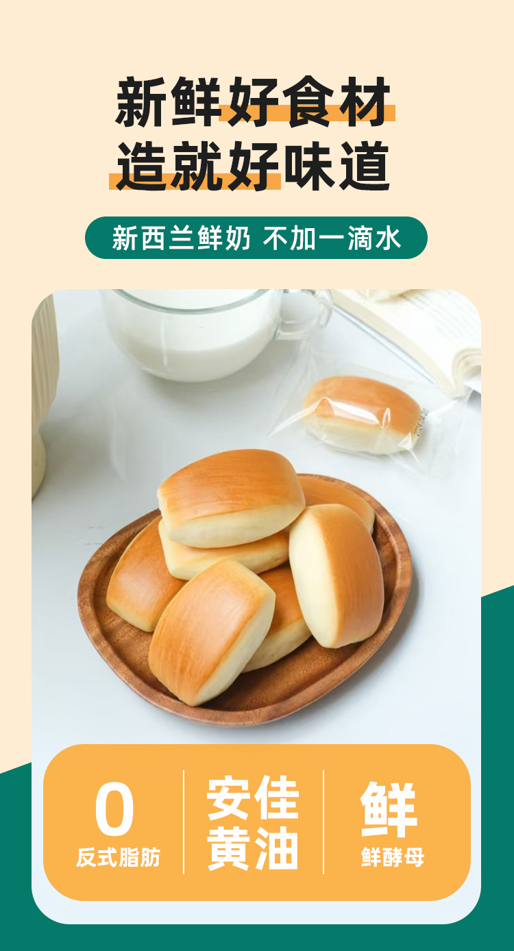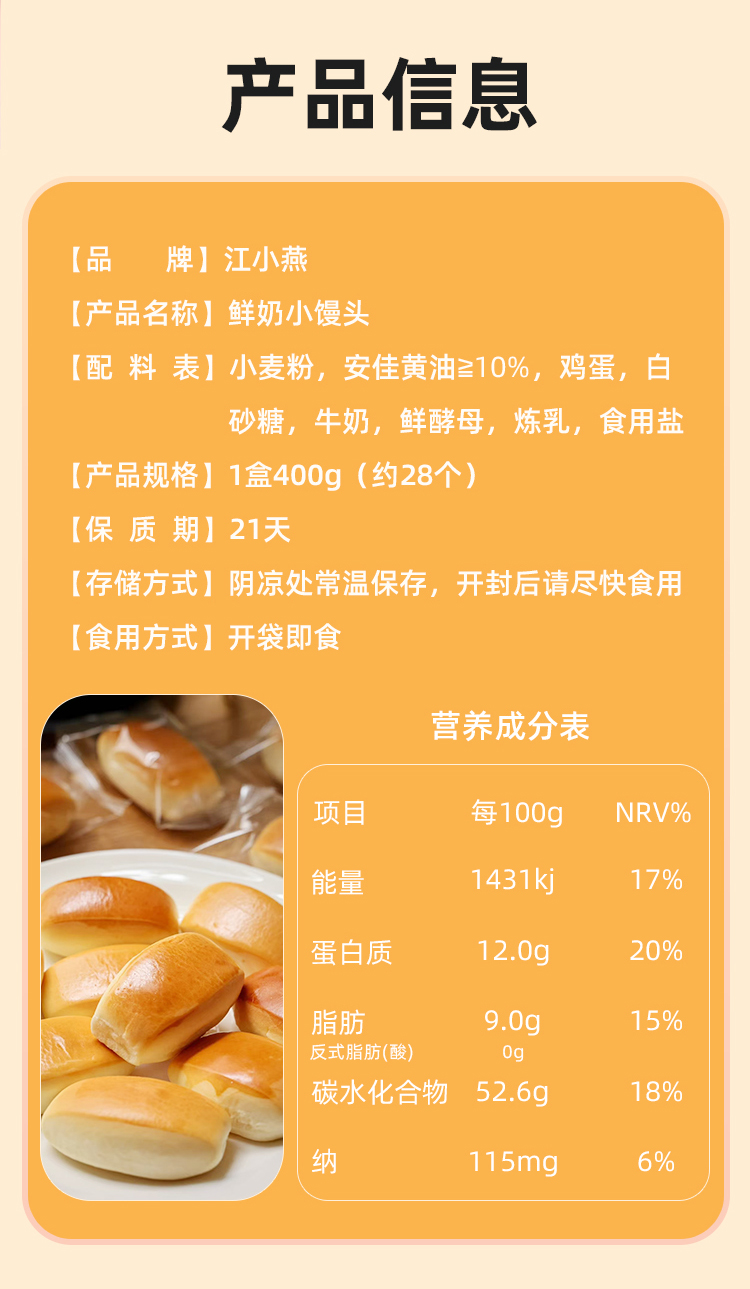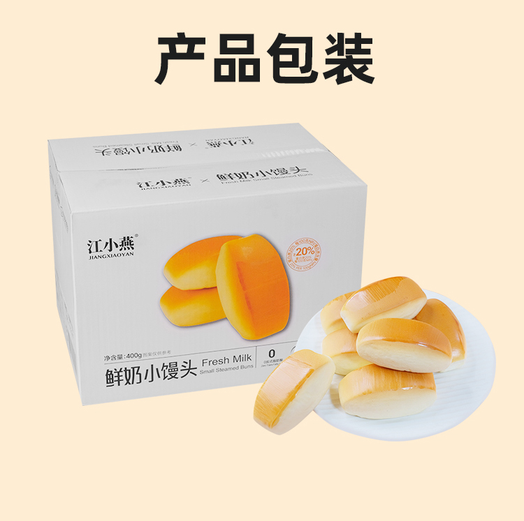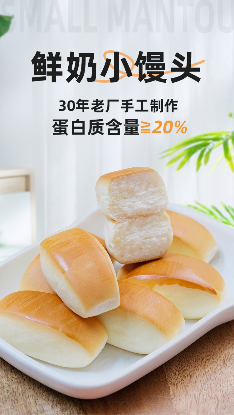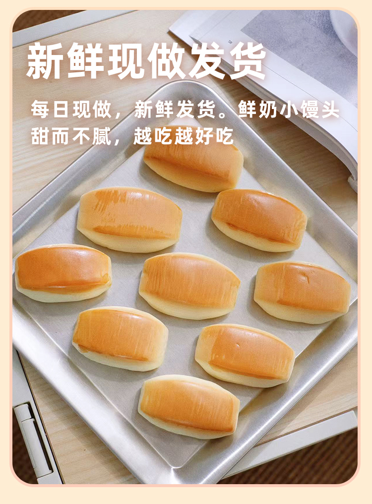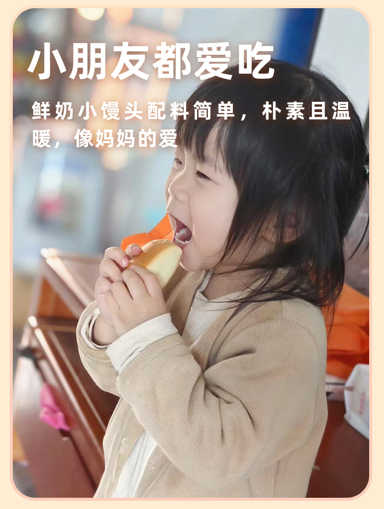 鲜奶小馒头 · 鲜奶和面 · 不添加一滴水 · 口感扎实 · 香醇劲道 · 宝宝安心 · 妈妈放心 · 0香精 0色素 0防腐剂 0反式脂肪酸(400g约28个)