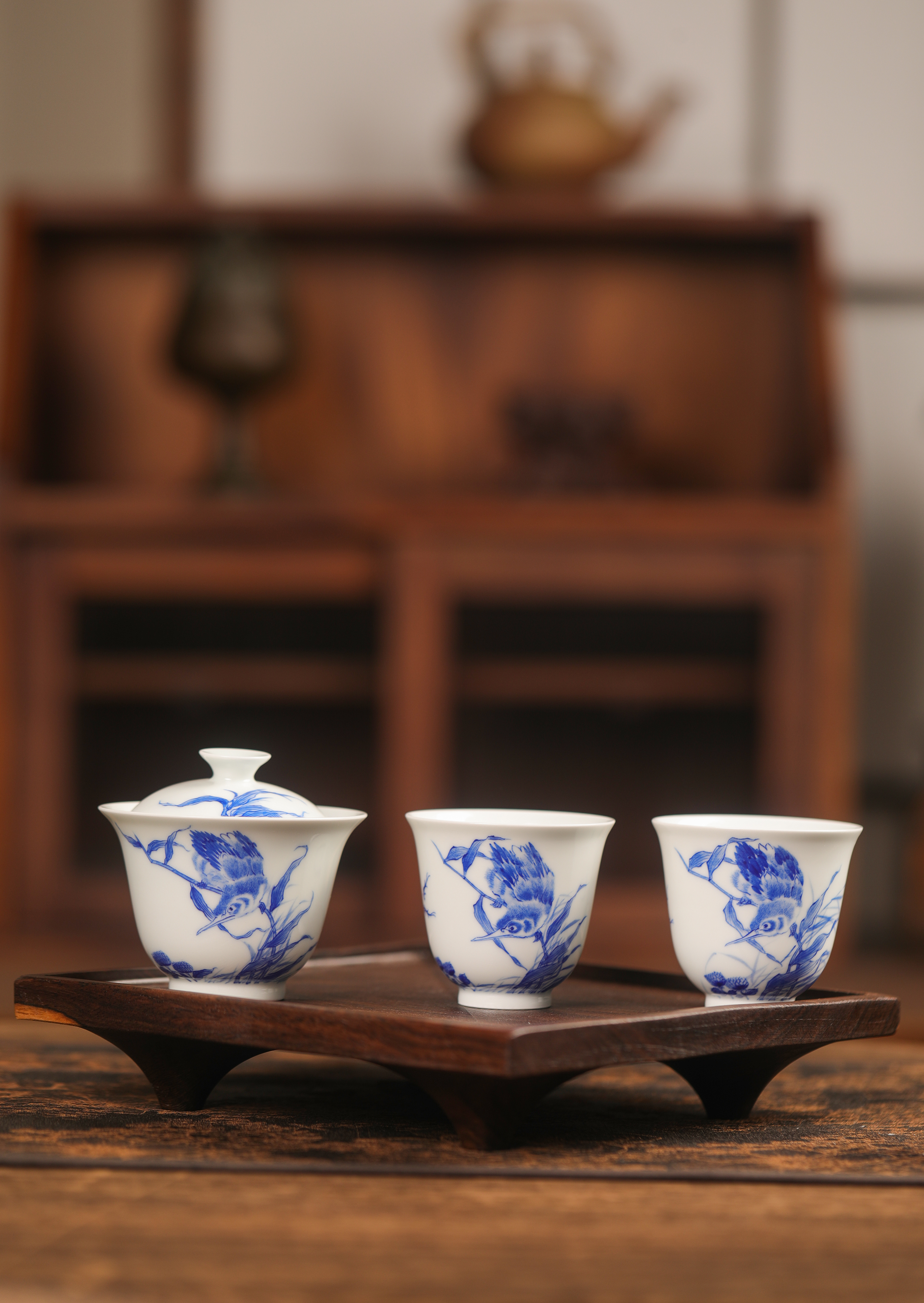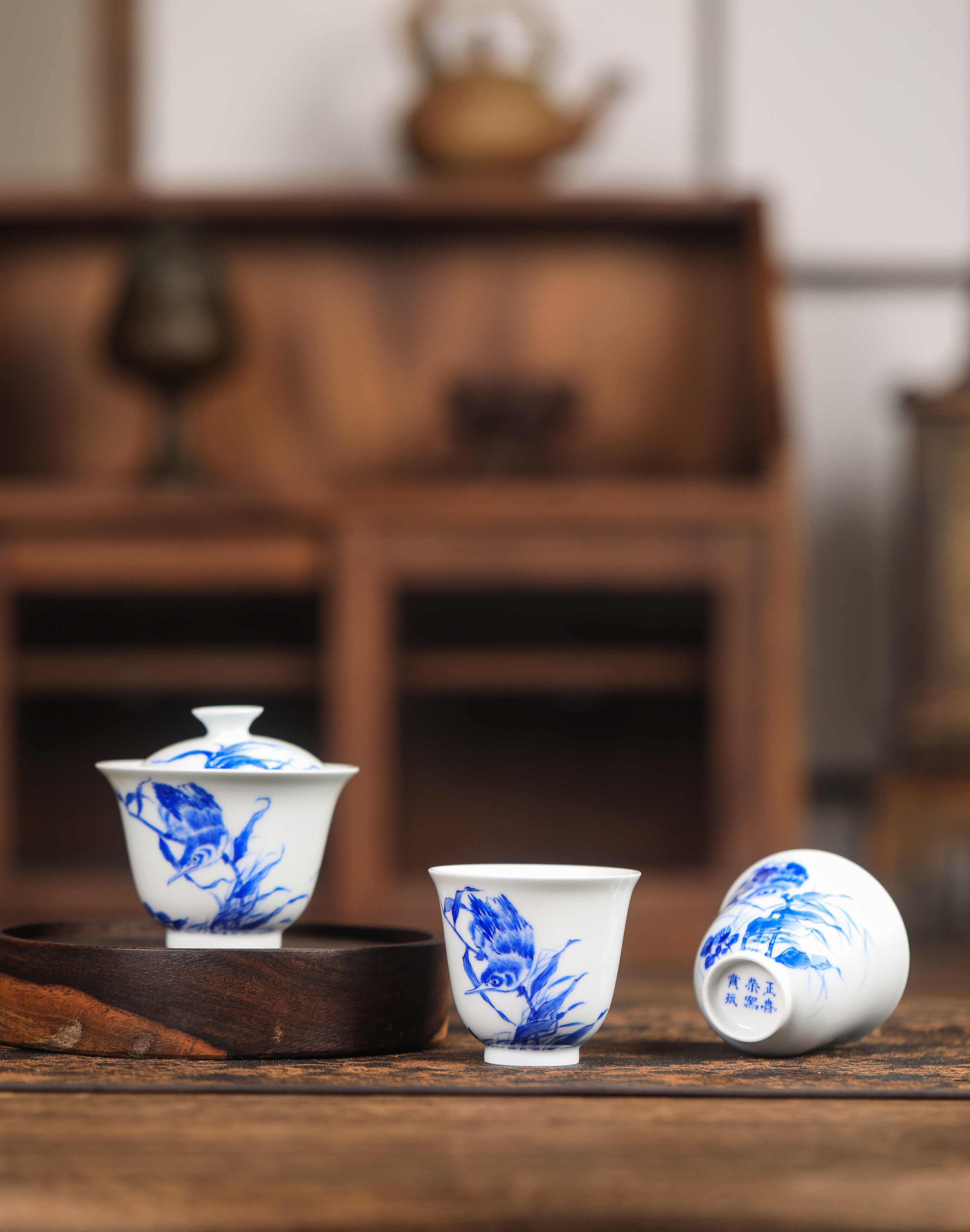 正春堂青花单翠二才盖碗两杯