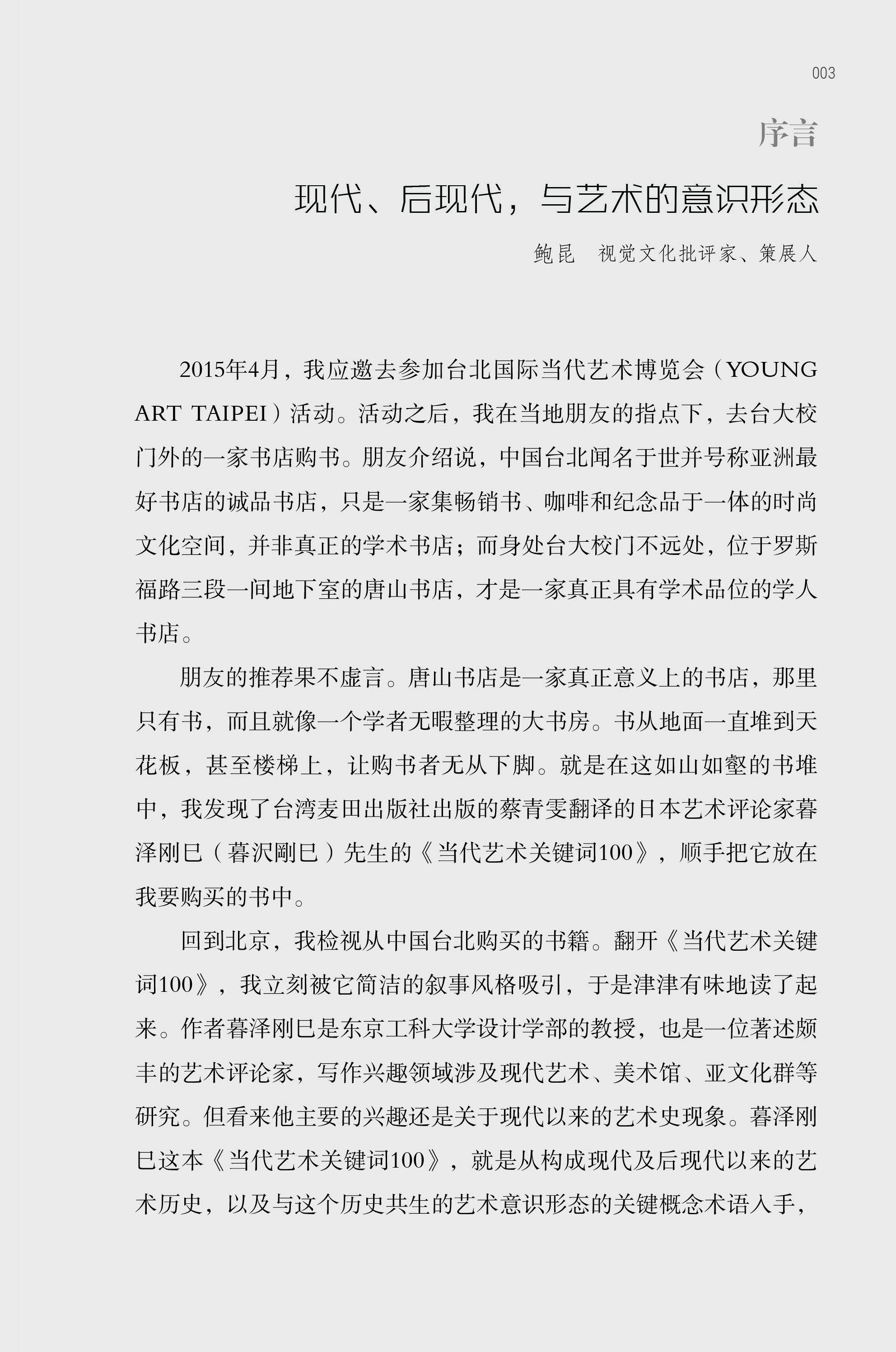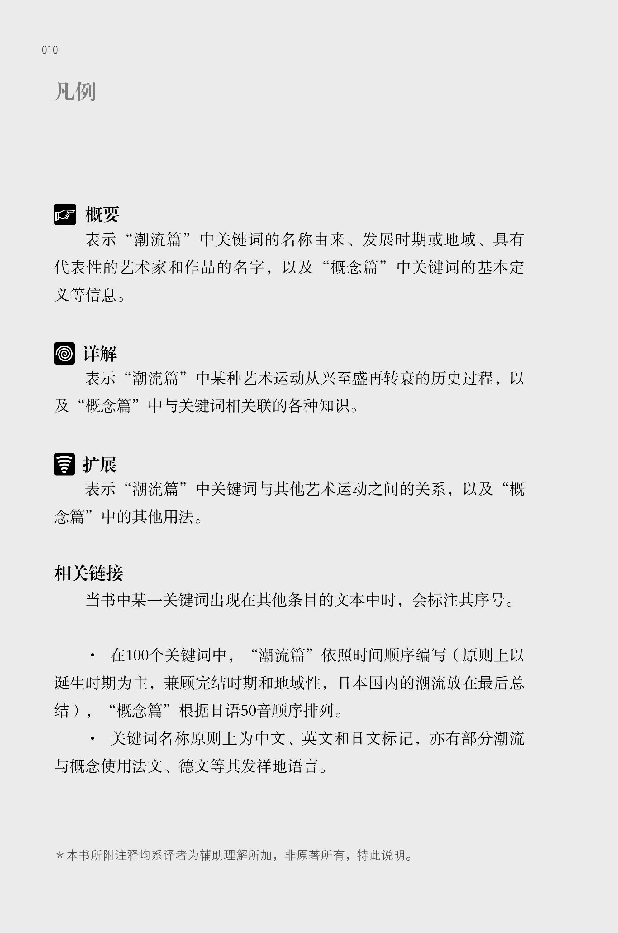 本书最大特点应该是“潮流篇”与“概念篇”这种两章构成的形式。艺术的历史通常被理解为潮流兴衰的历史,很多艺术类工具书也将大半笔墨耗费在对潮流的解说上。理解艺术,准确掌握种种潮流兴衰的重要性不言而喻,本书对此也并未敷衍了事,但考虑到对当代艺术背景下的各种概念的理解亦同等重要,故在总计100个关键词中潮流与概念各占一半。读者若能透过这些乍看之下和艺术毫无瓜葛的关键词,理解当代艺术绝非社会的突变和畸形,而是与同时代的文化和思想密切相关的表现形态,乃笔者之幸。