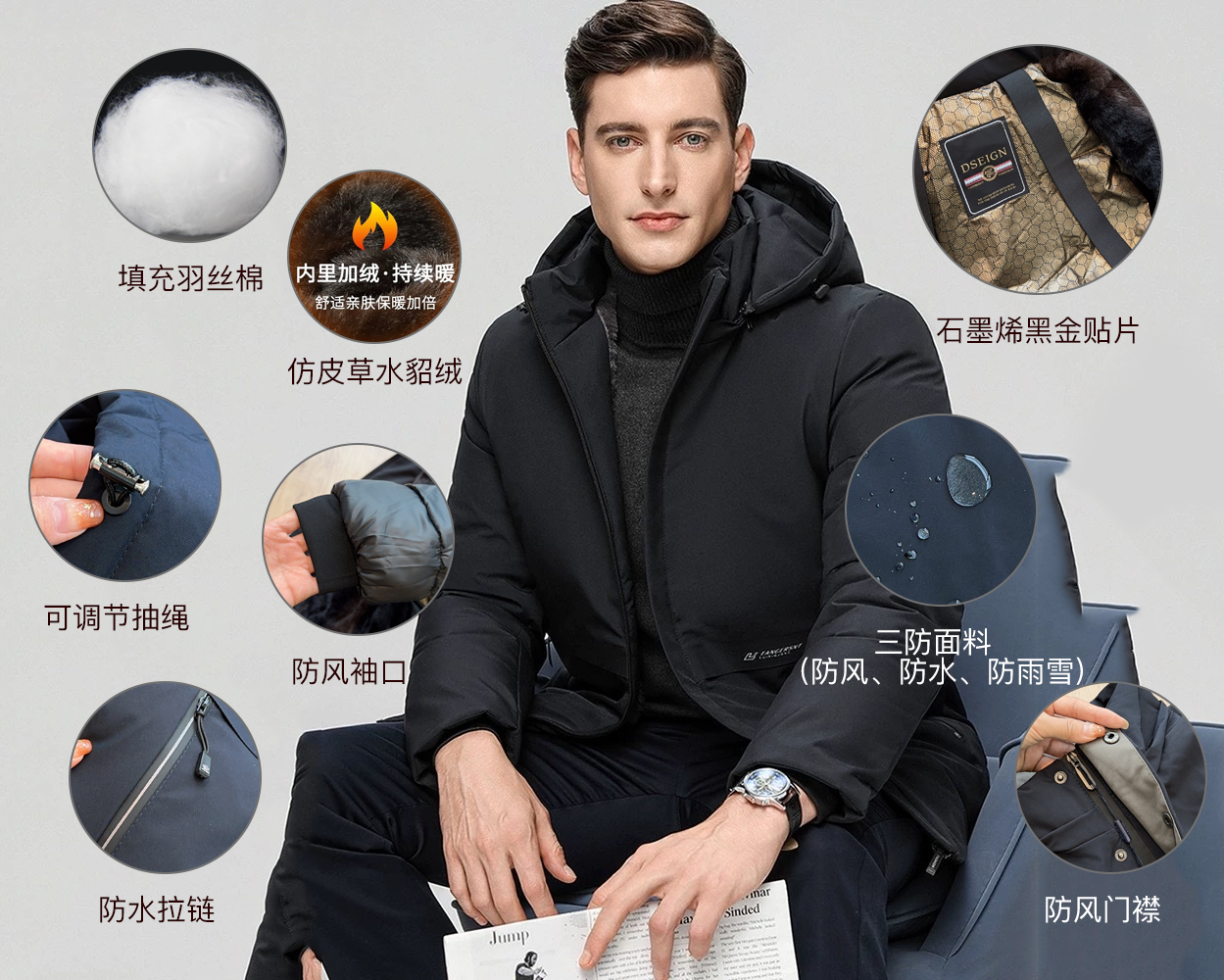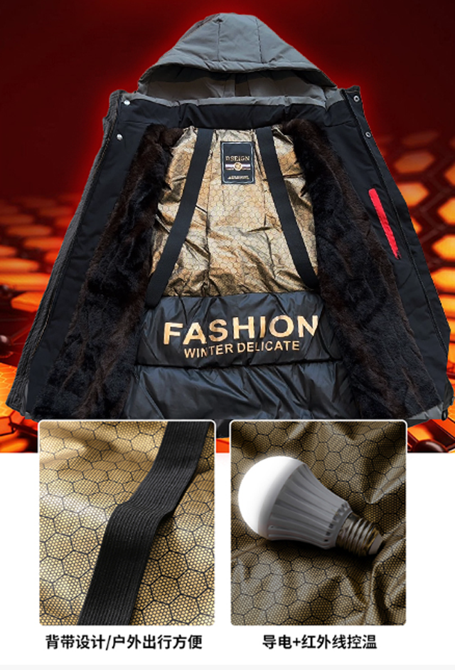 内有水貂绒+石墨烯黑金贴片,中层填充了羽丝棉,外层是三防面料。