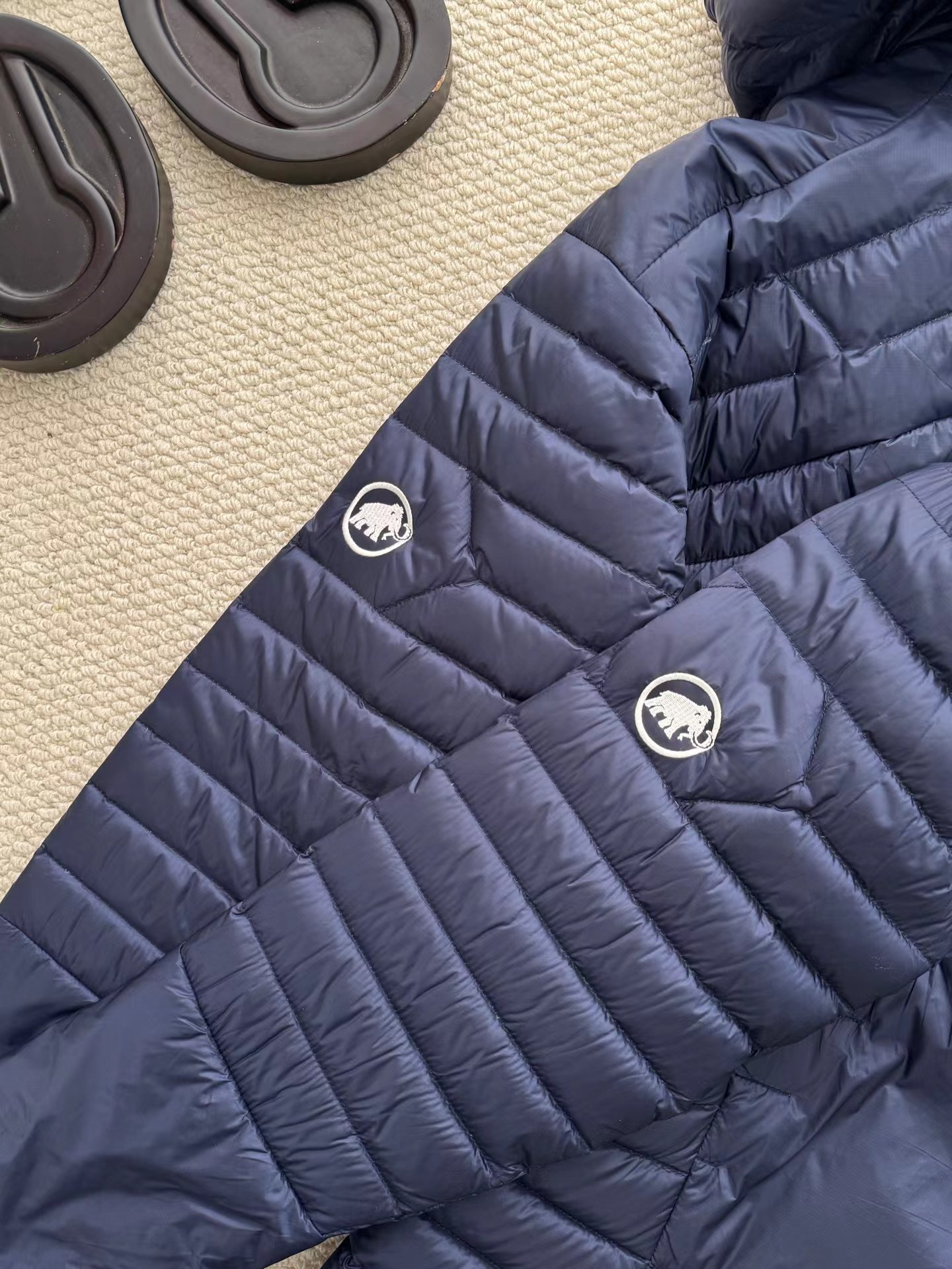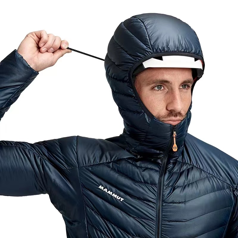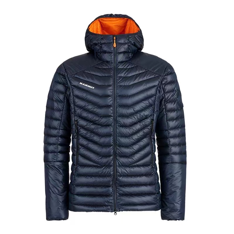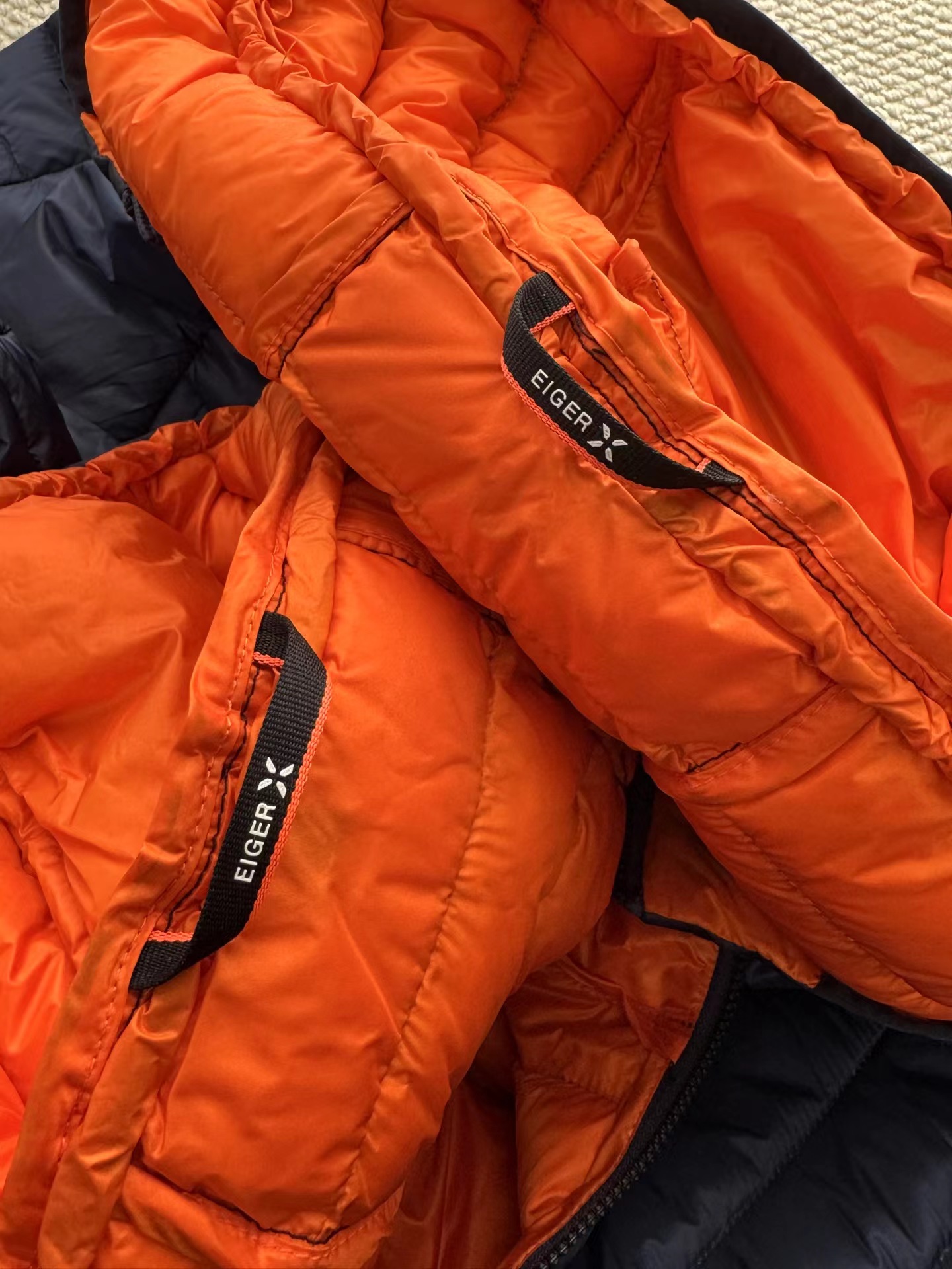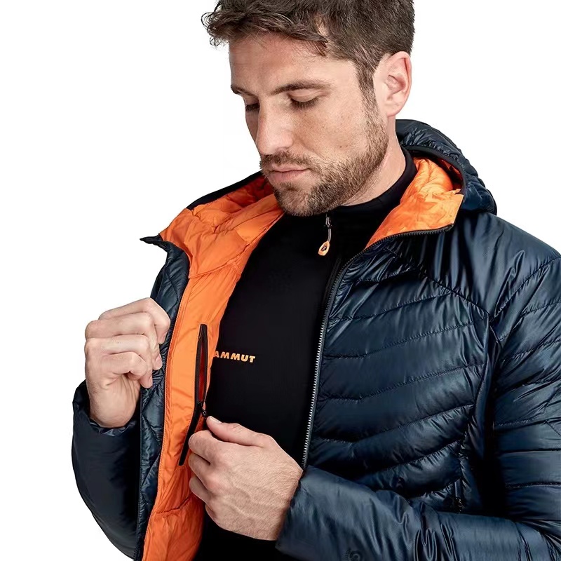男士Pertex轻量保暖防泼水750+蓬羽绒服 采用标志性的排骨纹绗缝工艺,让羽绒分布更均匀且有效避免跑绒;连帽设计贴合头部轮廓,帽檐可轻微调节,应对户外多变风况;领口内侧的橙色撞色,为藏青主色增添视觉亮点,左胸的品牌标识与隐形拉链口袋设计,兼顾品牌辨识度与整体版型的简洁性;衣身的立体剪裁贴合人体工学,肩部与袖管的衔接处无多余缝线,活动时无束缚感。主打轻量化羽绒填充,在保证保暖性的同时大幅降低衣身重量,作为中间层搭配冲锋衣无臃肿感,单穿也能应对秋冬日常及轻户外场景;面料具备一定的防泼水性与抗风性,徒步、露营时可抵御小雨和冷风;拉链口袋能安全收纳手机、钥匙等小物件,连帽的防风设计也进一步提升了户外实用性。