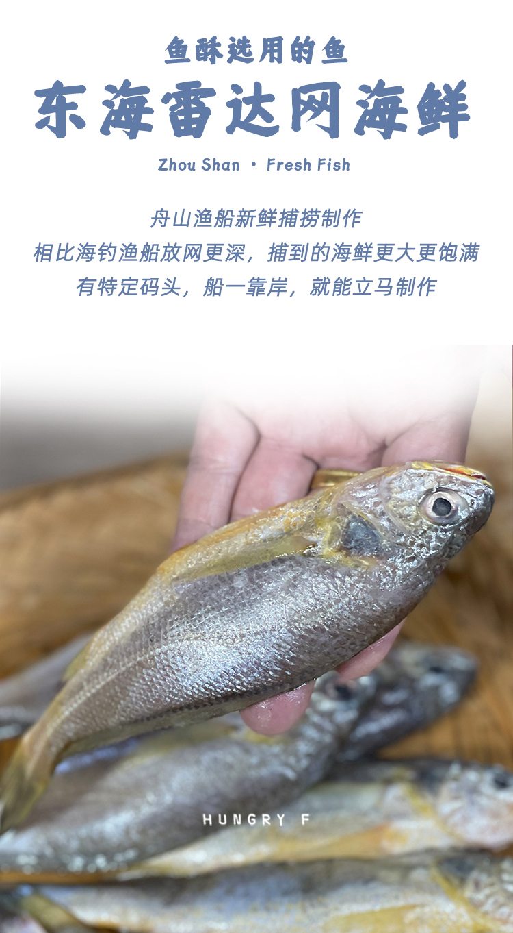市面上的鱼酥,大多来自辽宁大连,属于渤海海域,量大便宜,但这款小鱼酥不同,它是来自舟山东海雷达网海鲜,原料选用的是每天新鲜到港的小眼睛带鱼和小黄鱼!不是速冻很久的鱼肉,选材和制作全部都在舟山完成。每天新鲜到港的带鱼、黄鱼直接运送到舟山工厂海力生集团(以前是舟山食品厂,据说是问10个舟山人9个都知道的大厂!),这大大缩短渔货运输的时间,拒绝二次冷冻,保证了食材的新鲜。而在制作工艺上,食品厂采用了市面少见的低温真空油炸工艺,调味也遵循了舟山老底子的手艺,只用简单的香料去腥,酥脆口感的同时,杜绝因高温油炸而产生的致癌物,好吃又健康!