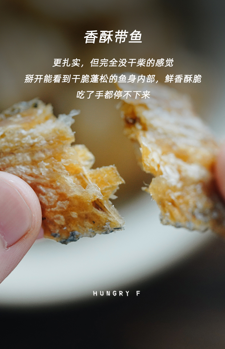 看陆老师捧着袋子吃得停不下来,我也抓了几块试试!鱼酥身型完整,拿到手就能感受到它厚实的肉感,一点儿也不油腻。黄鱼酥是掐头去尾只有中间段的,除了一整条大鱼骨外,基本没刺,能轻松入口,整条直接啃,比薯片更酥脆,而且炸过后连鱼骨小朋友都能直接吃!带鱼酥的口感会比黄鱼酥更扎实,完全没有干柴的感觉,掰开能看到蓬松的鱼身内部,鲜香甜美,停不下来!原料和工艺用不用心,真的能尝出来哦!