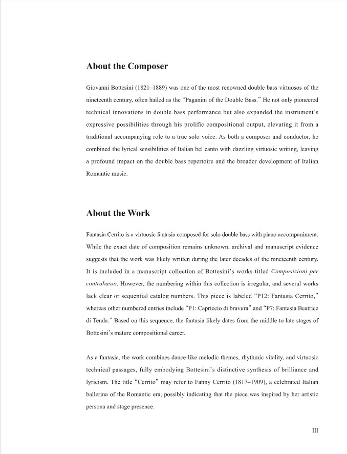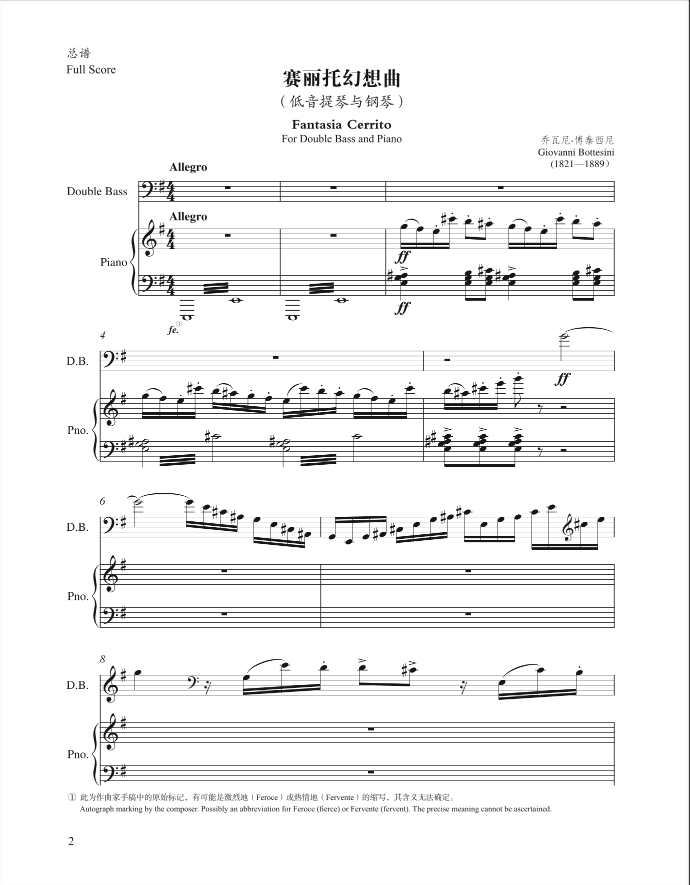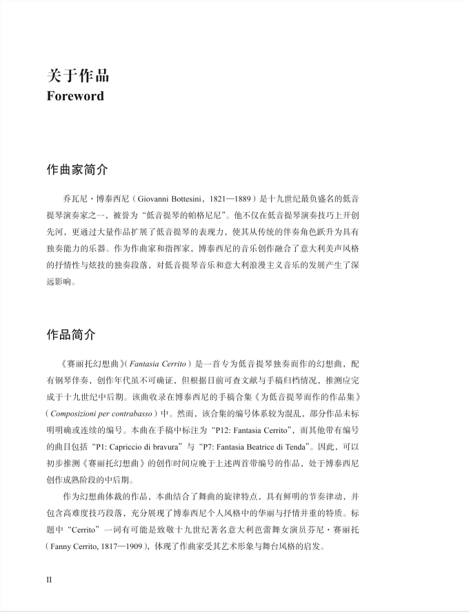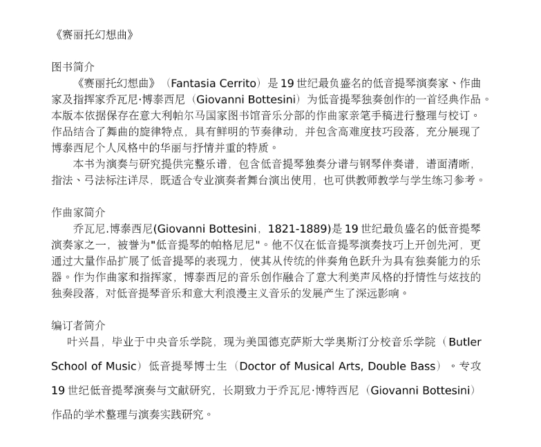 本书基于意大利帕尔马音乐图书馆藏博特西尼亲笔手稿,编者制作了《Fantasia Cerrito》的批判性版本。通过与Rodney Slatford等现有版本的细致比对,指出了手稿与后期编辑版本之间的差异与问题,并在尊重原作风格的基础上,制作了兼顾历史准确性与演奏实用性的全新校订演奏谱。本书是国内首次出版,兼具学术研究价值与演奏指导功能,适合低音提琴演奏者、教育者及研究者使用