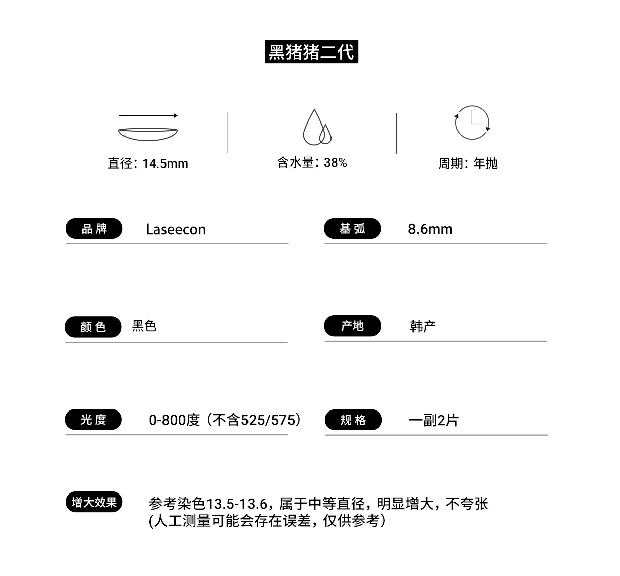 Laseecon 黑猪猪二代 黑色美瞳中等尺寸 自然增大 【14.5mm年抛】