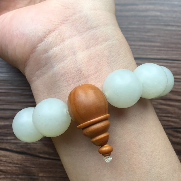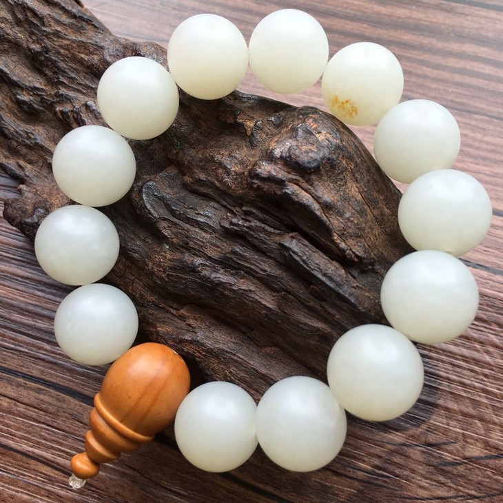 【900015】和田玉新疆料桶珠手串,质地细腻,温润有泽,原皮俏色。圆珠颗粒饱满,颗粒均匀,简单素雅,经典百搭,轻饶腕间,举足投手间典雅风度尽显无疑。尺寸约15.8mm,总重83.6g,倾心价8600