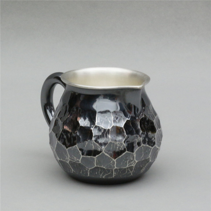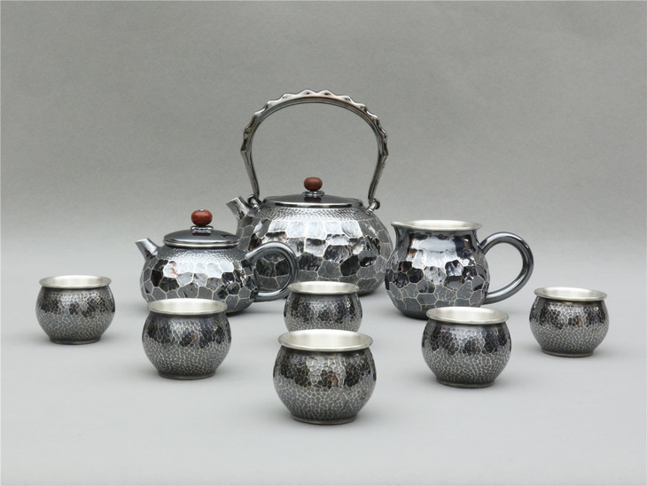 此套纯银茶具含泡茶大壶一把,斟茶小壶一把,公道杯一只,品茗杯6个组成。小锤牒为纹,大锤牒似石相连,加之防氧化古旧工艺,外壁之粗旷与内壁之精润于反差之间更显古人外方内圆的待友之道。
