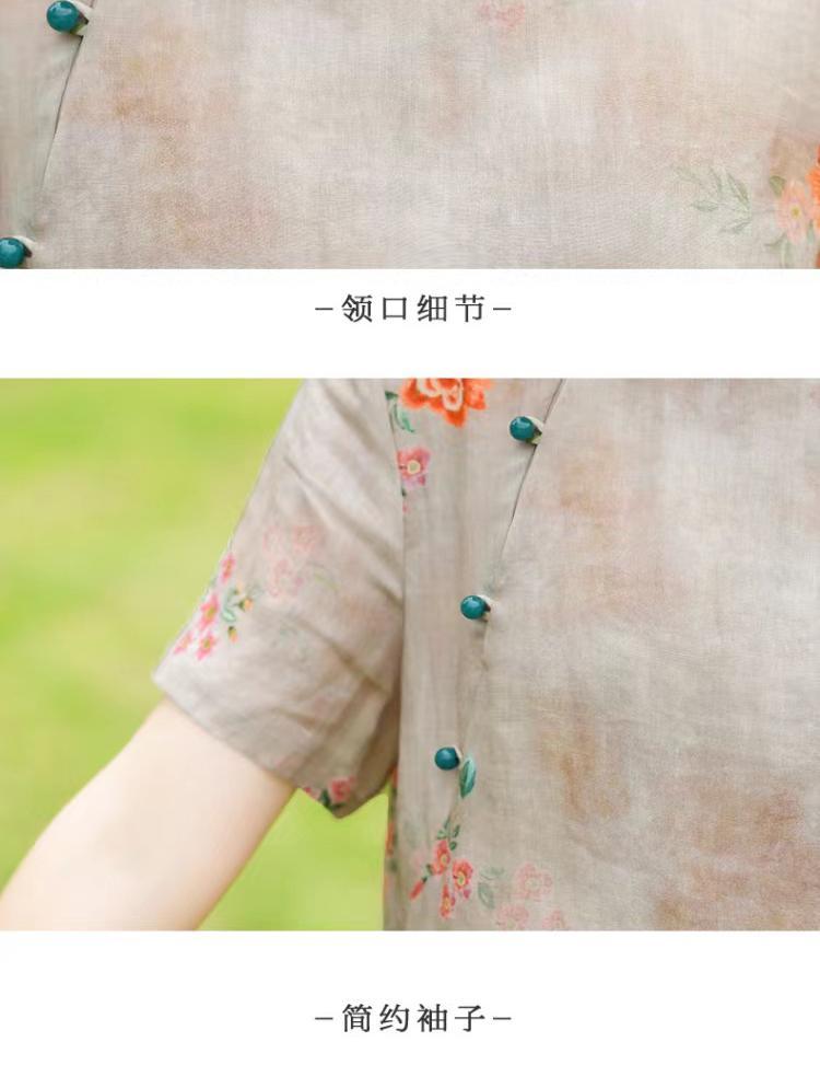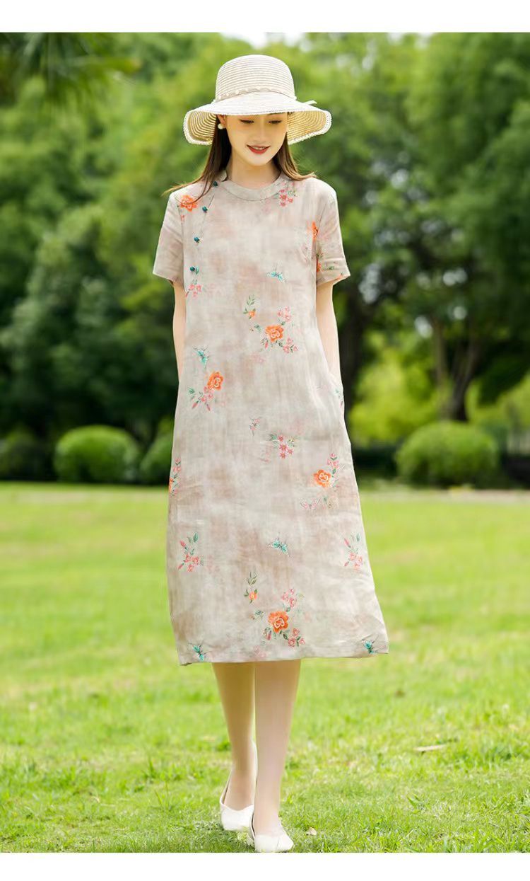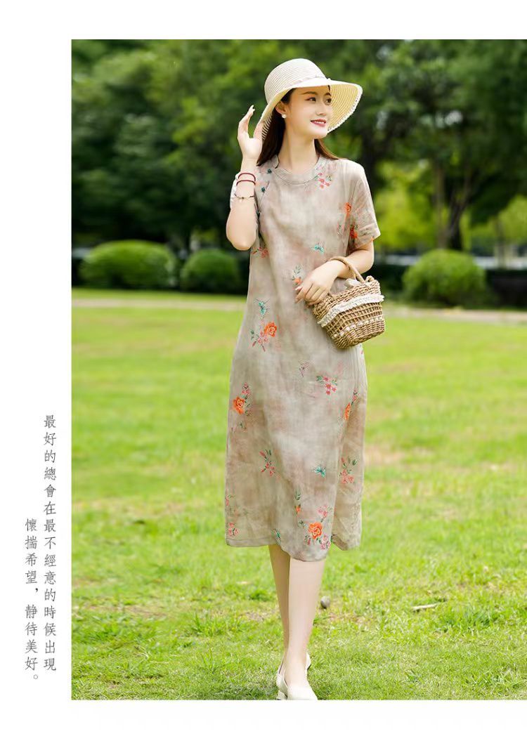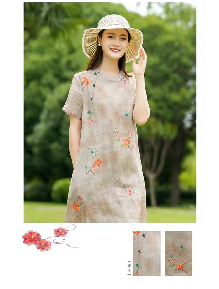 dp1095 2022夏季改良旗袍日常短袖复古文艺斜襟棉麻印花连衣裙