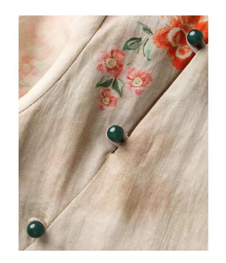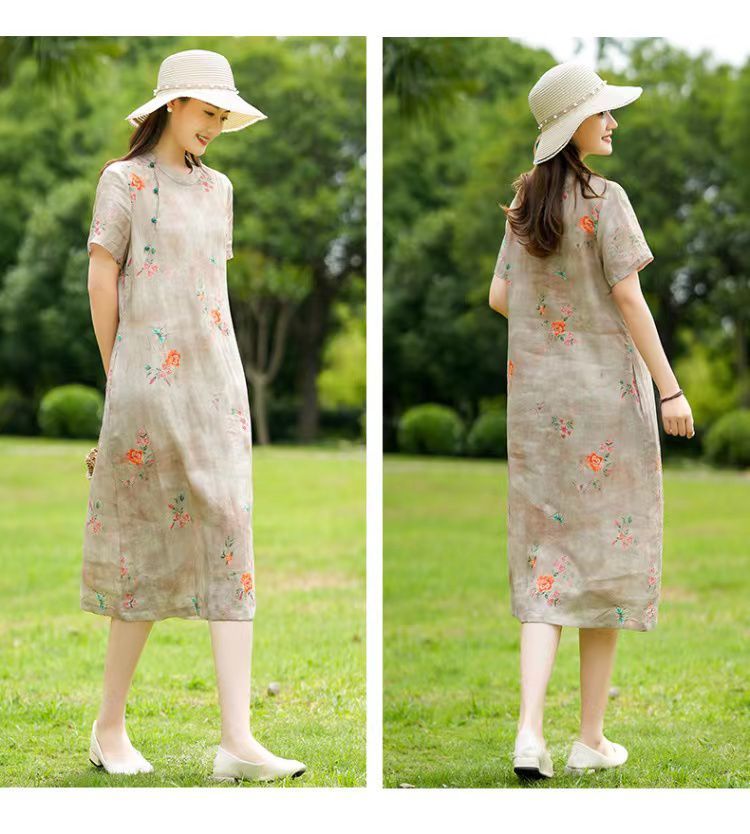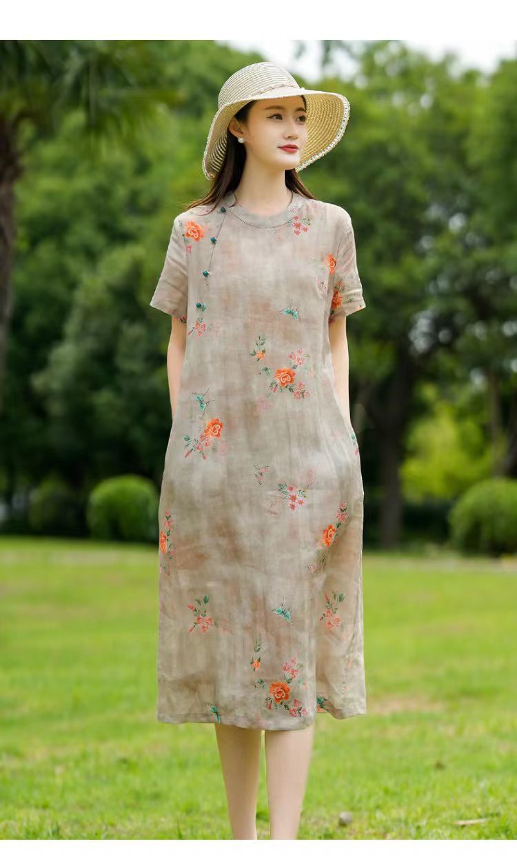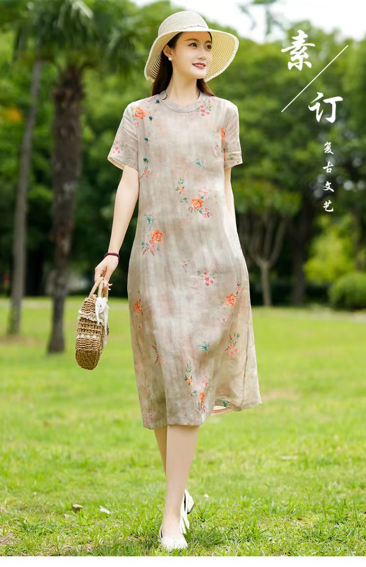 dp1095 2022夏季改良旗袍日常短袖复古文艺斜襟棉麻印花连衣裙