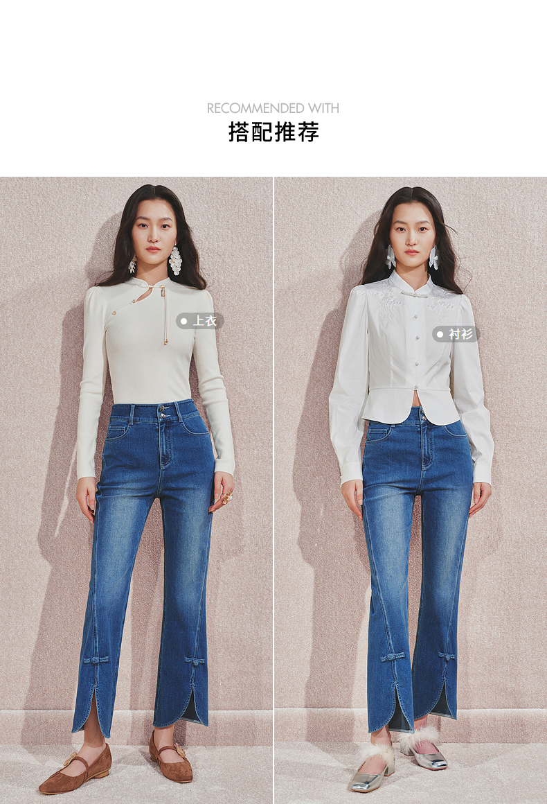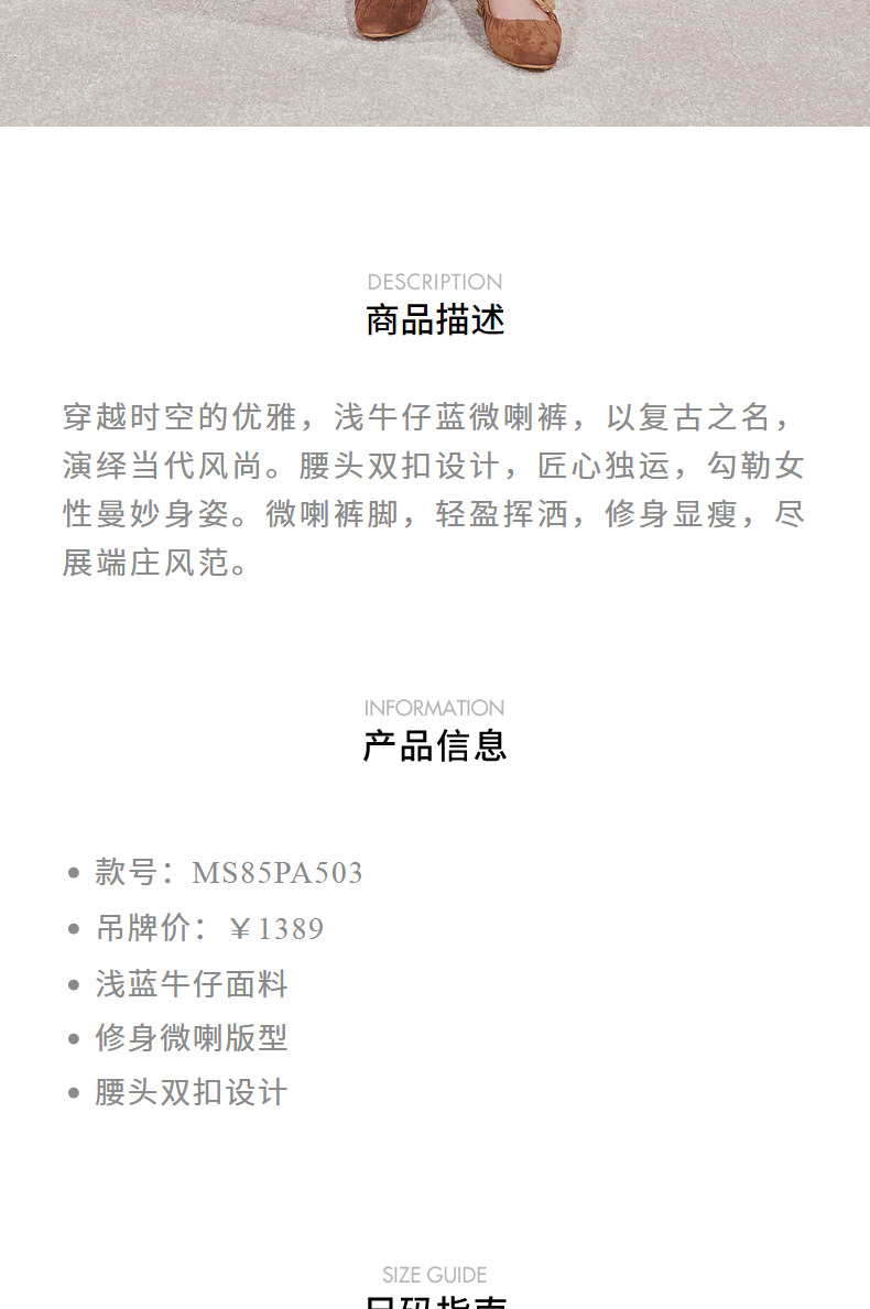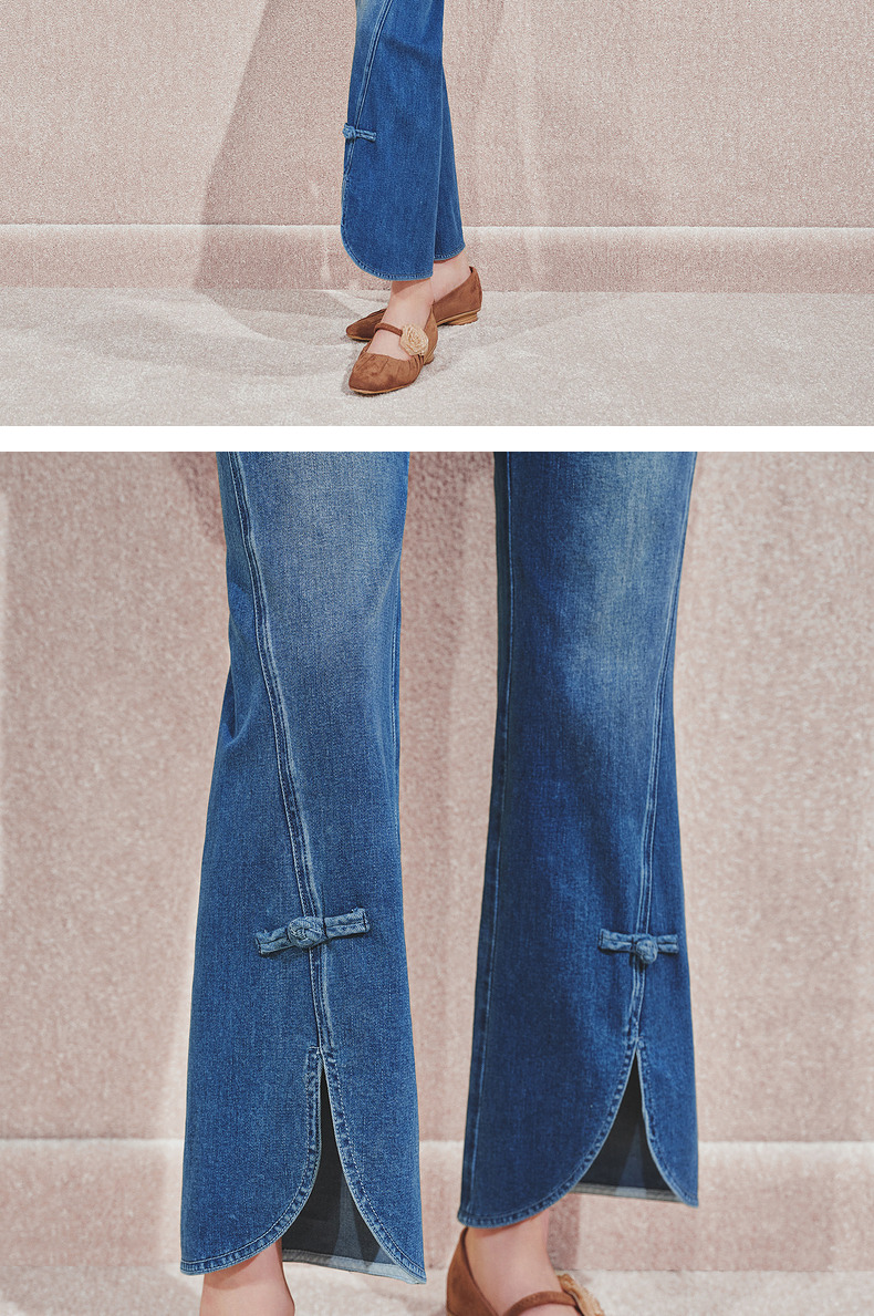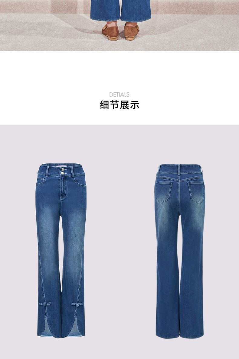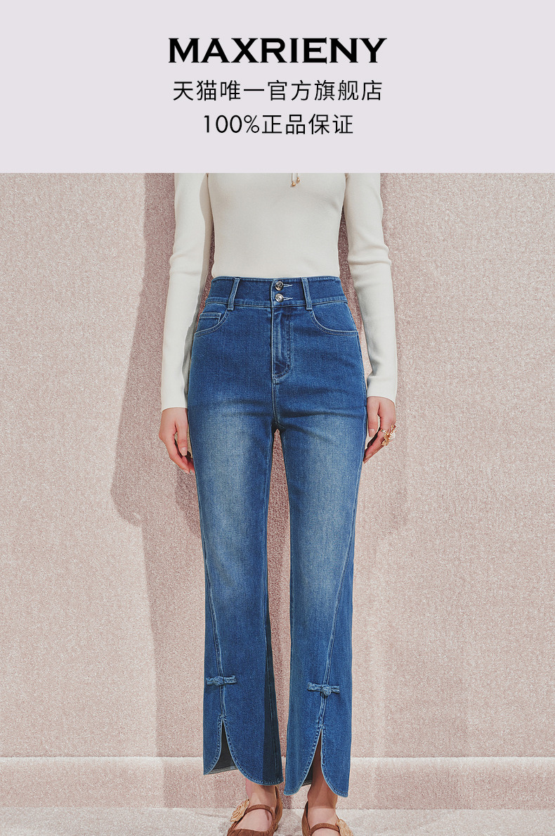 MAXRIENY复古优雅微喇牛仔裤2024秋冬新款腰头双扣设计长裤(货号:MS85PA503)